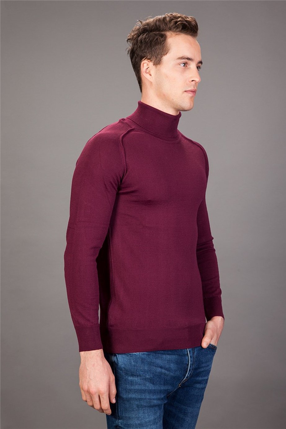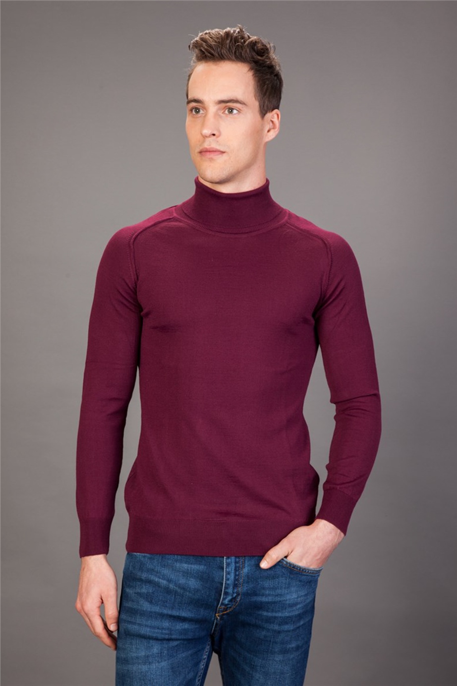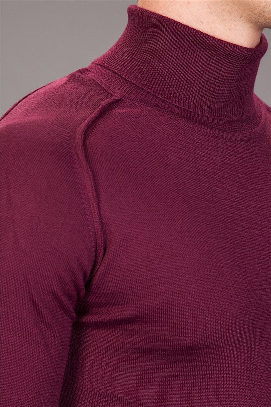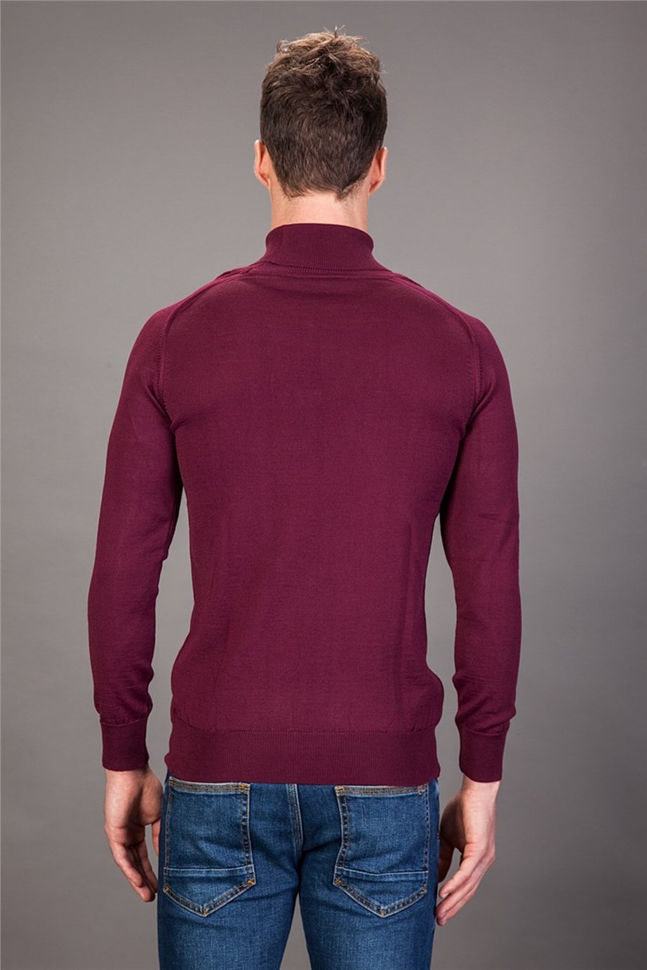 Erkek Slim Fit Tam Balıkçı Yaka Düz Bordo Triko Kazak (KZ15022-099)