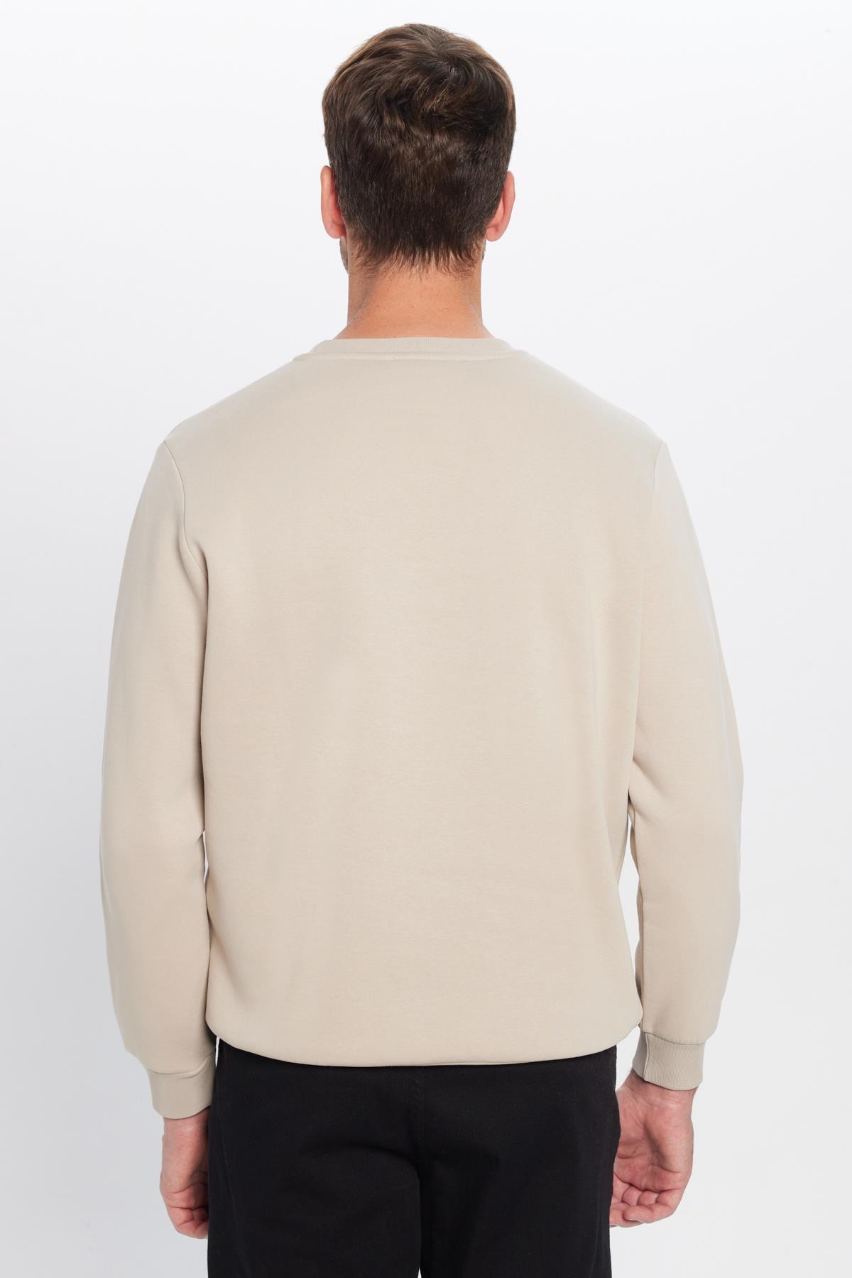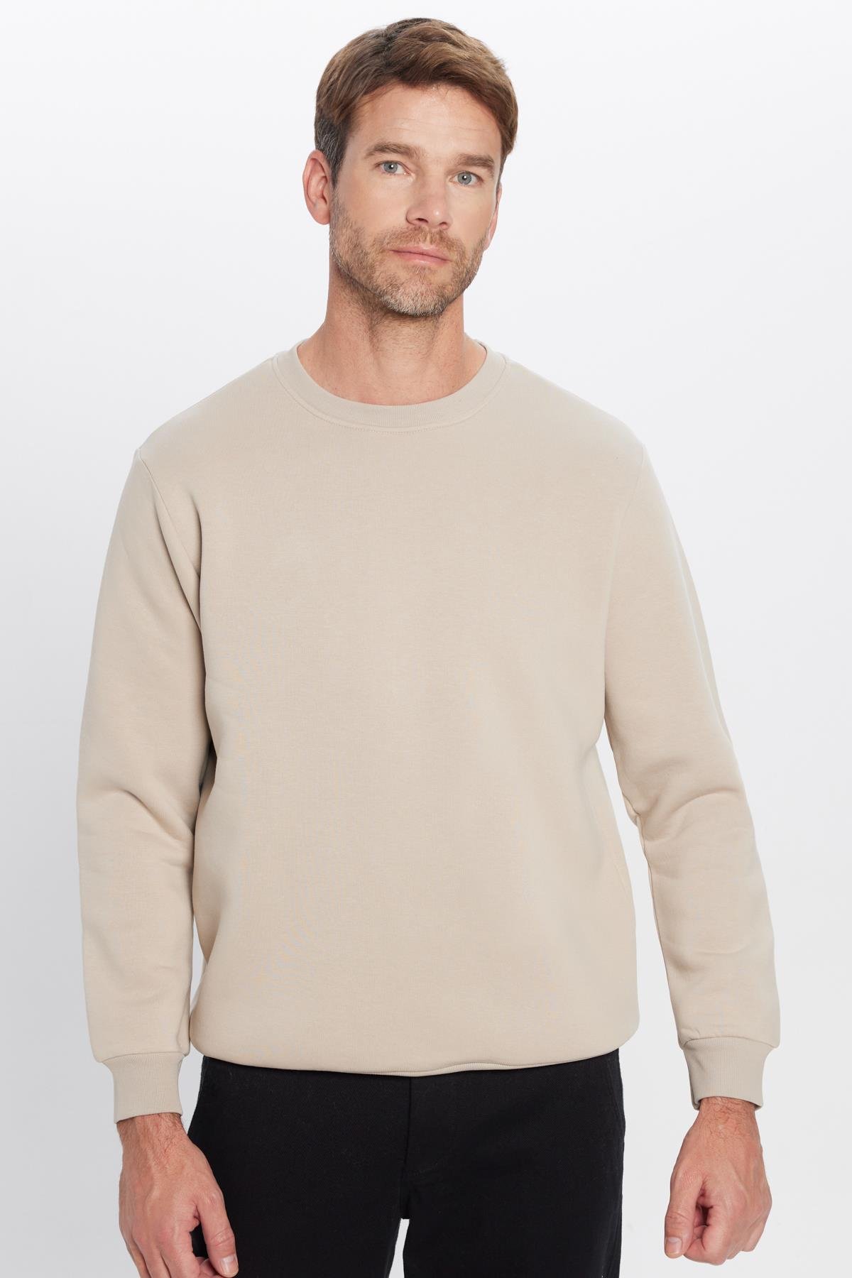 Unisex Relax Fit Rahat Kesim Pamuklu Yumuşak Dokulu Polarlı Basic Taş Renk Bisiklet Yaka Sweatshirt (SW220005-STN)