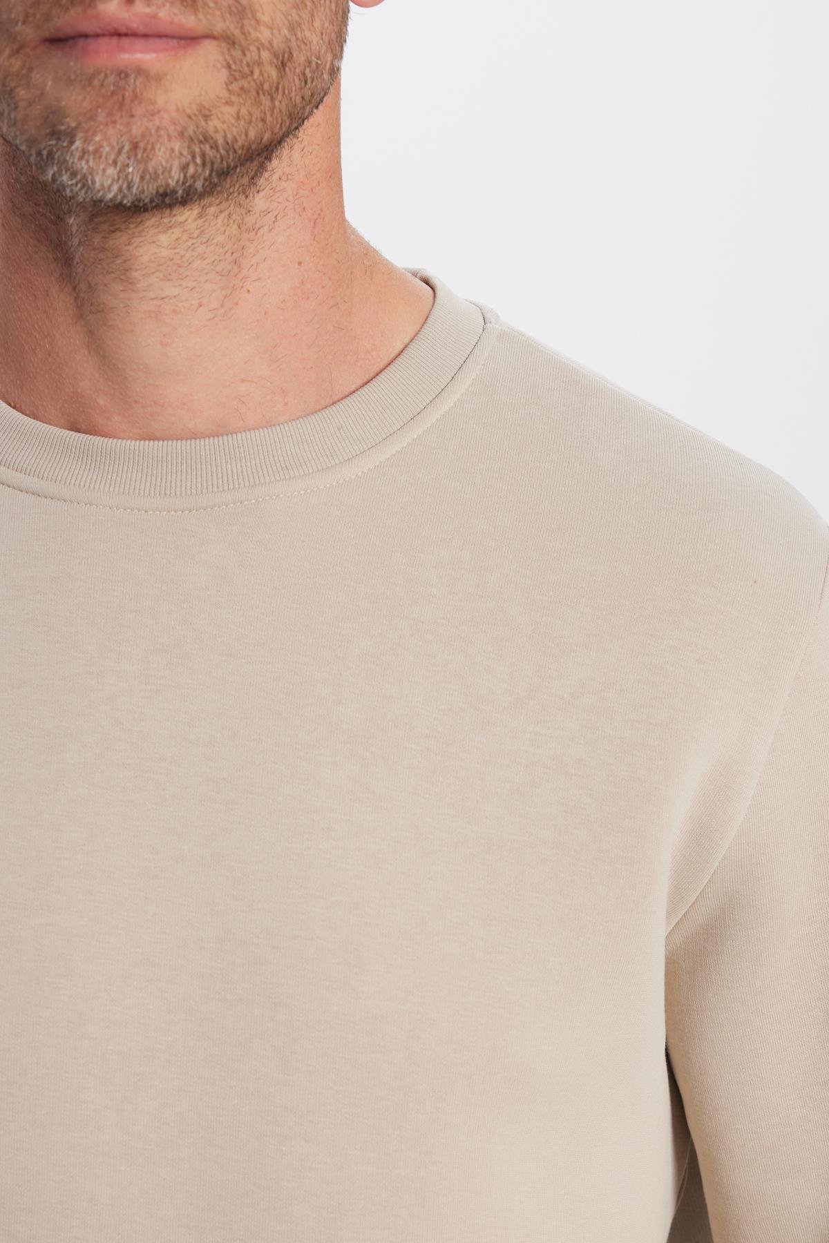 Unisex Relax Fit Rahat Kesim Pamuklu Yumuşak Dokulu Polarlı Basic Taş Renk Bisiklet Yaka Sweatshirt