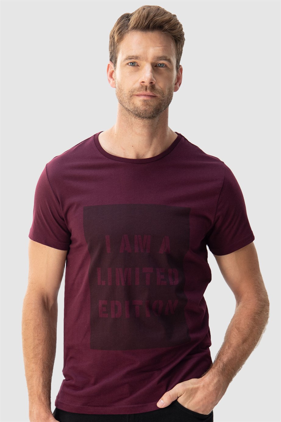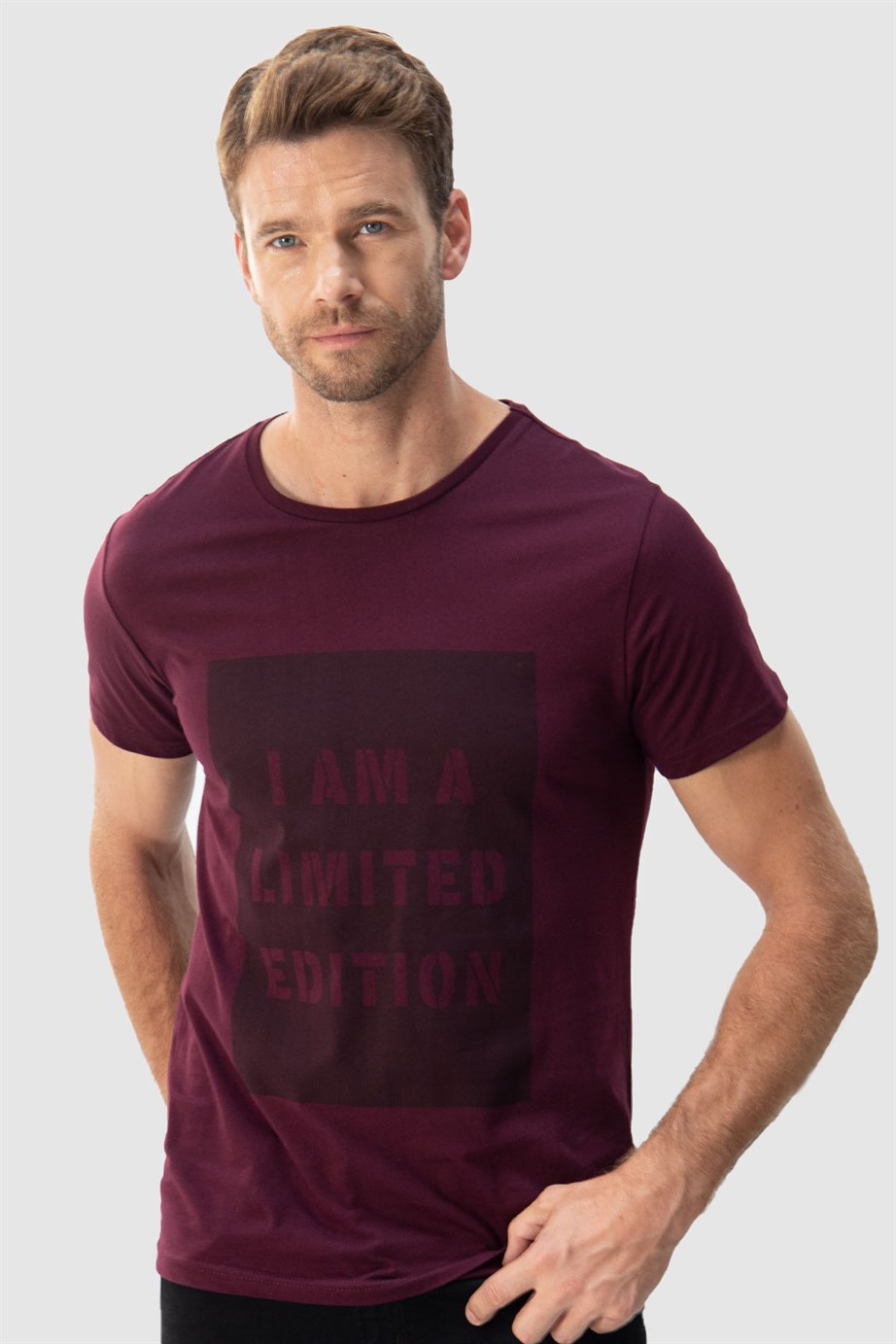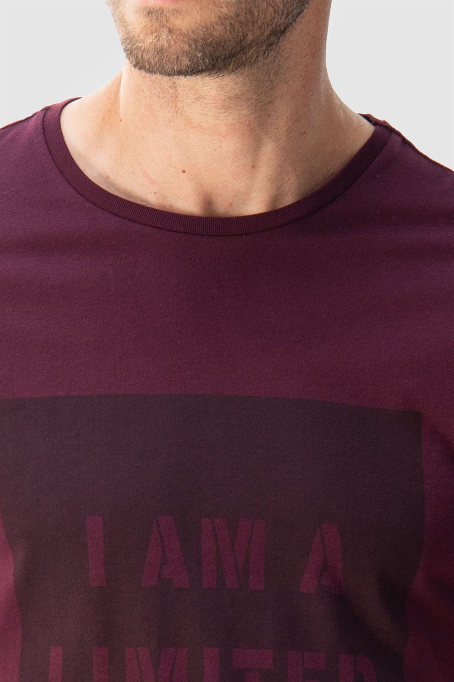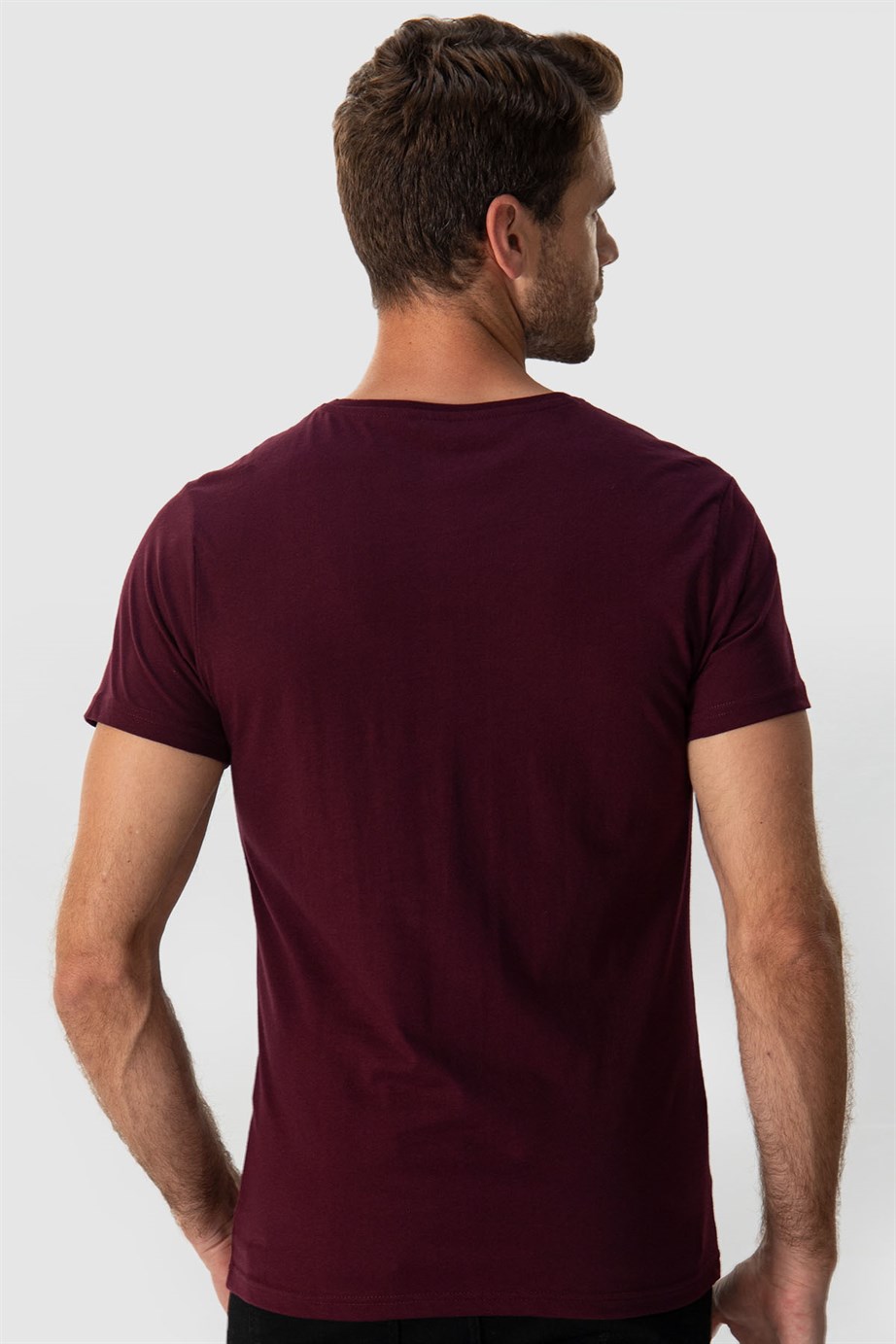 Erkek Slim Fit Dar Kesim %100 Pamuk Yumuşak Dokulu Baskılı Bordo Bisiklet Yaka Tişört (TS220016-302)