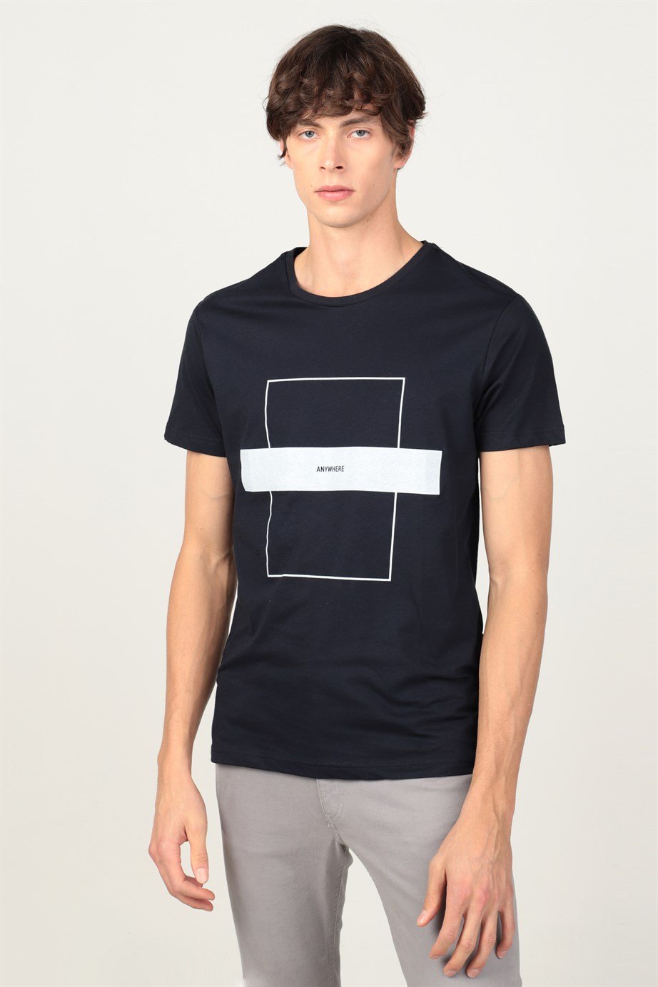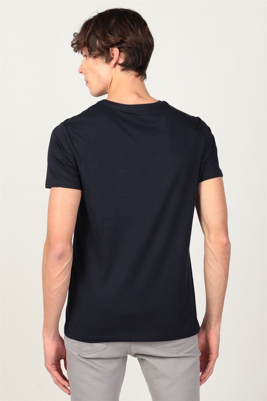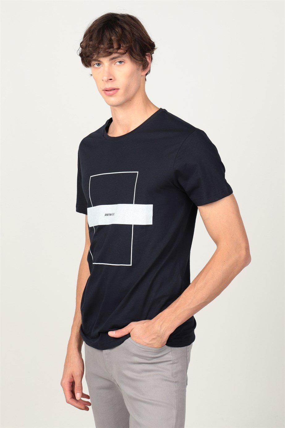Erkek Slim Fit Dar Kesim %100 Pamuk Yumuşak Dokulu Baskılı Lacivert Bisiklet Yaka Tişört (TS220016-304)