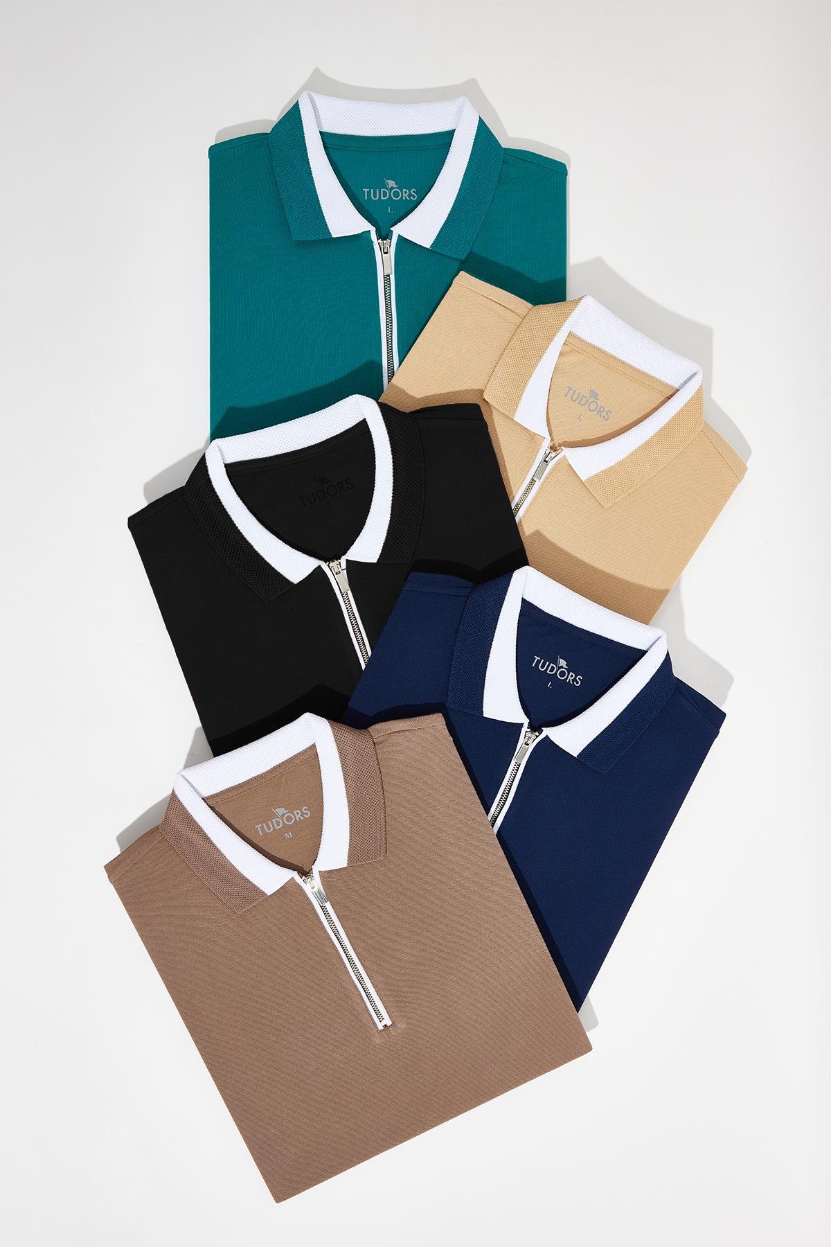 Erkek 5'li Paket Lacivert-Siyah-Vizon-Yeşil-Kum Slim Fit Pamuklu Düz Fermuarlı Pike Polo Yaka Tişört (TS230029-6002)
