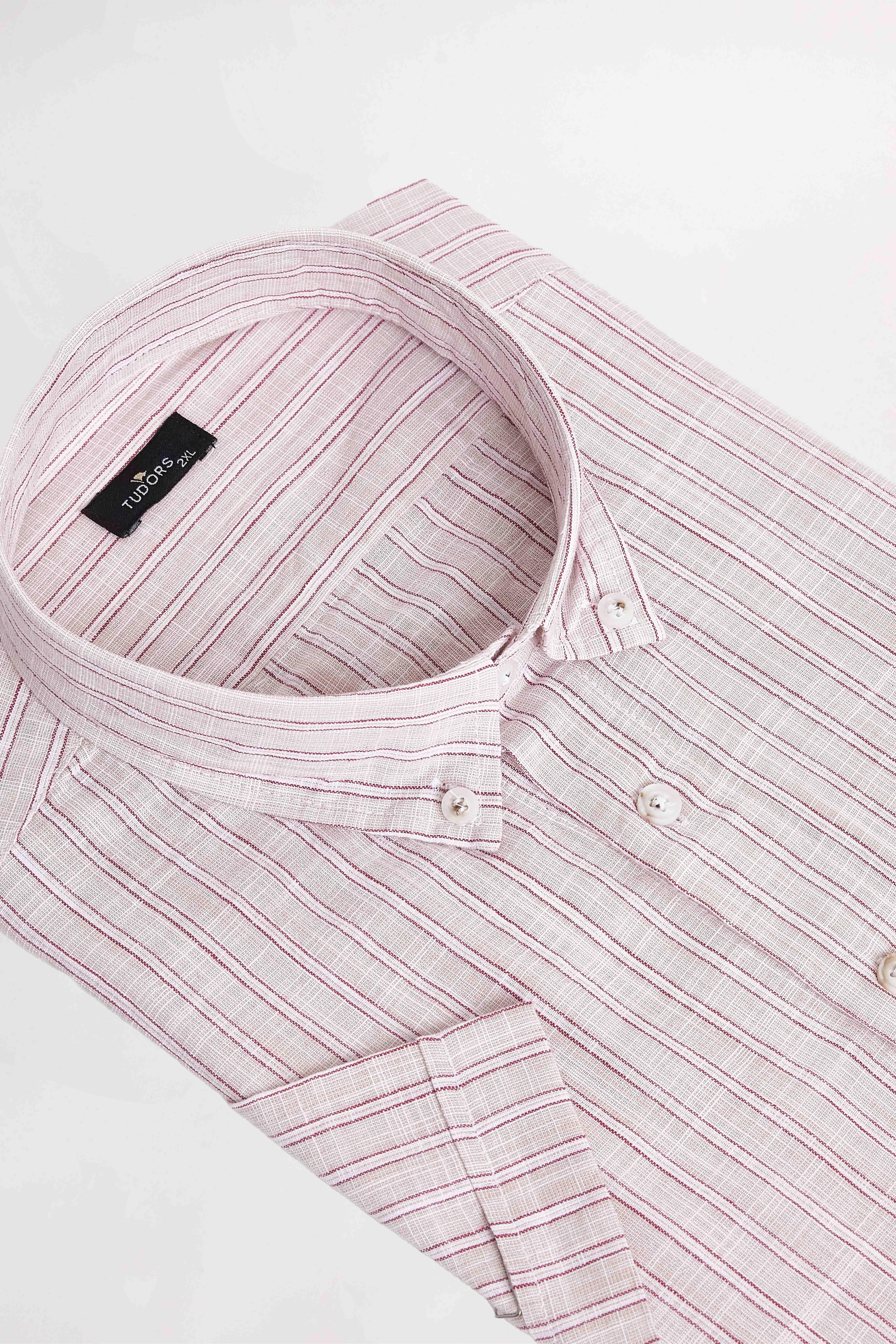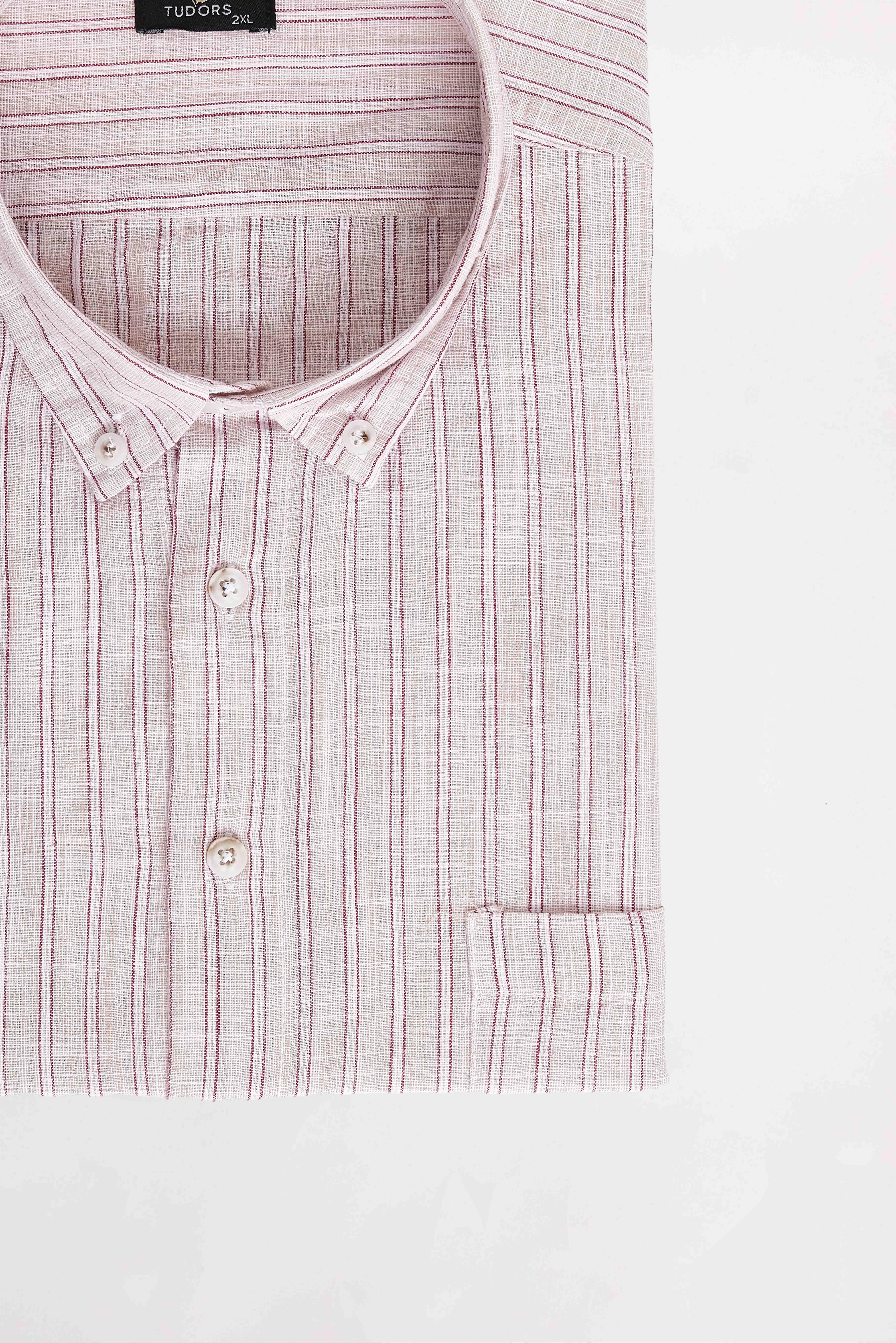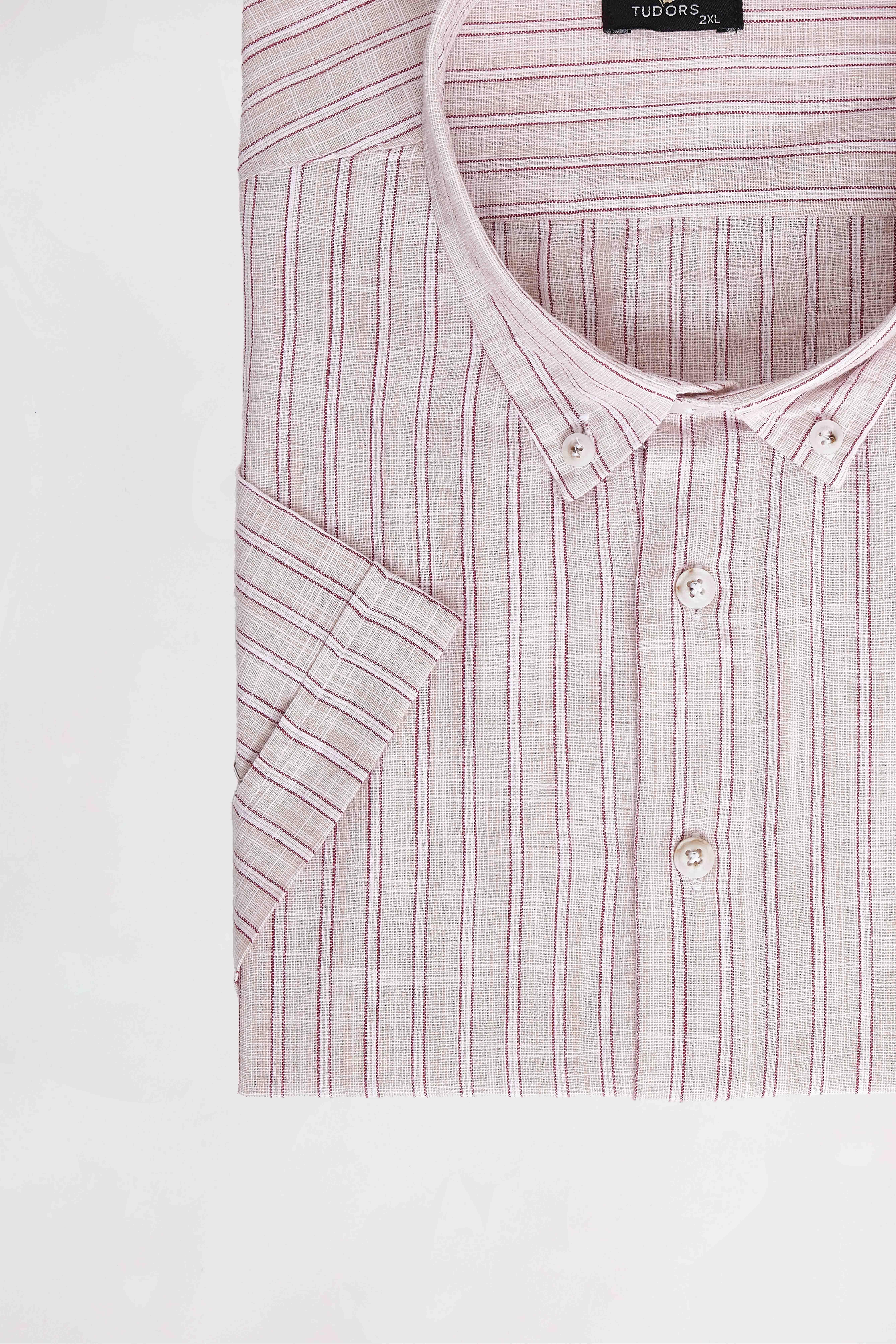 Erkek Big Size Büyük Beden %100 Pamuk Yaka Düğmeli Keten Doku Cepli Çizgili Kısa Kollu Bordo Gömlek (BT250006-3309)