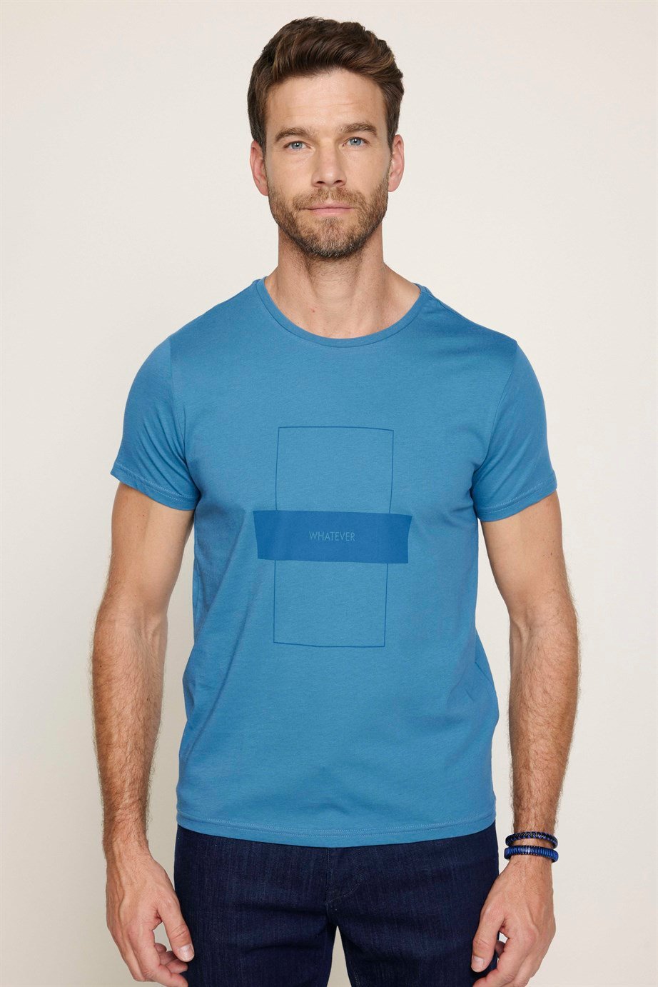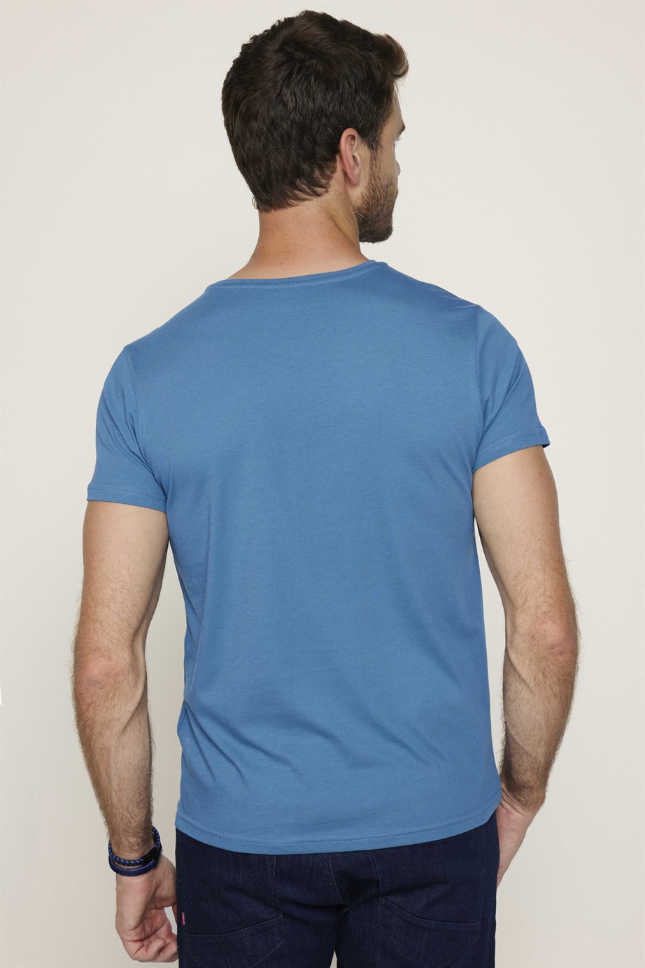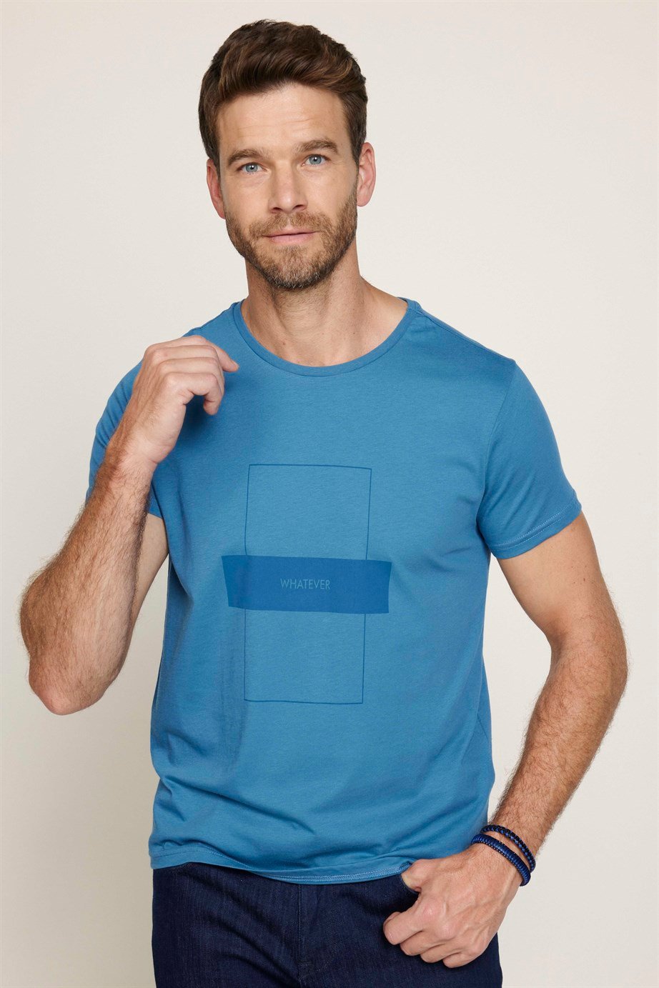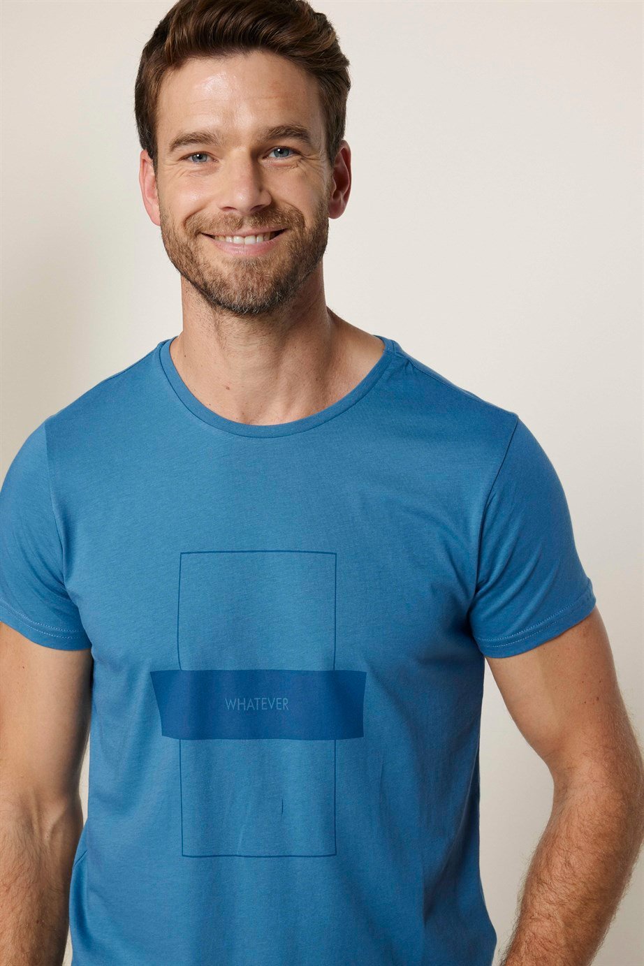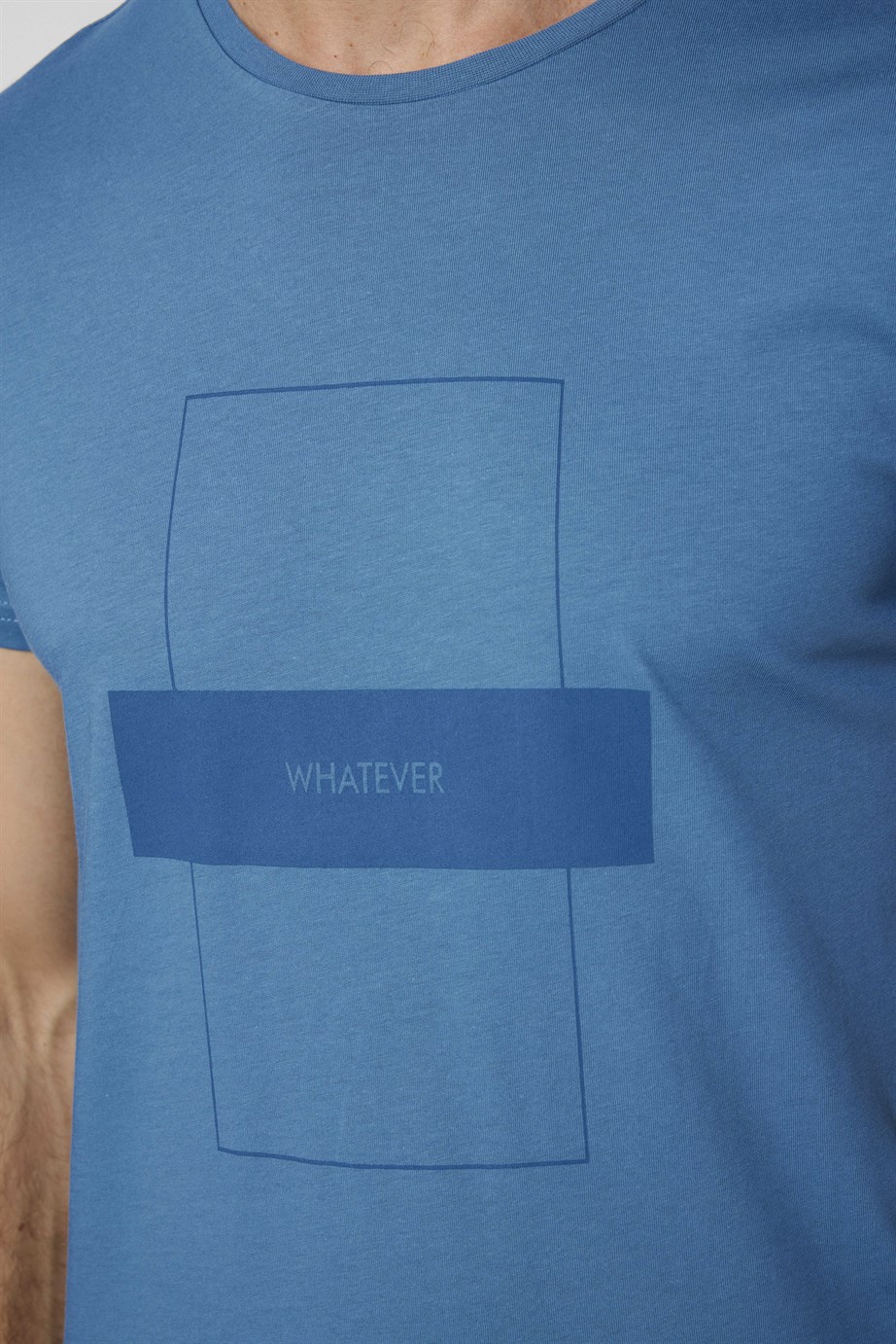 Erkek Slim Fit Dar Kesim %100 Pamuk Yumuşak Dokulu Baskılı Mavi Bisiklet Yaka Tişört (TS230019-516)
