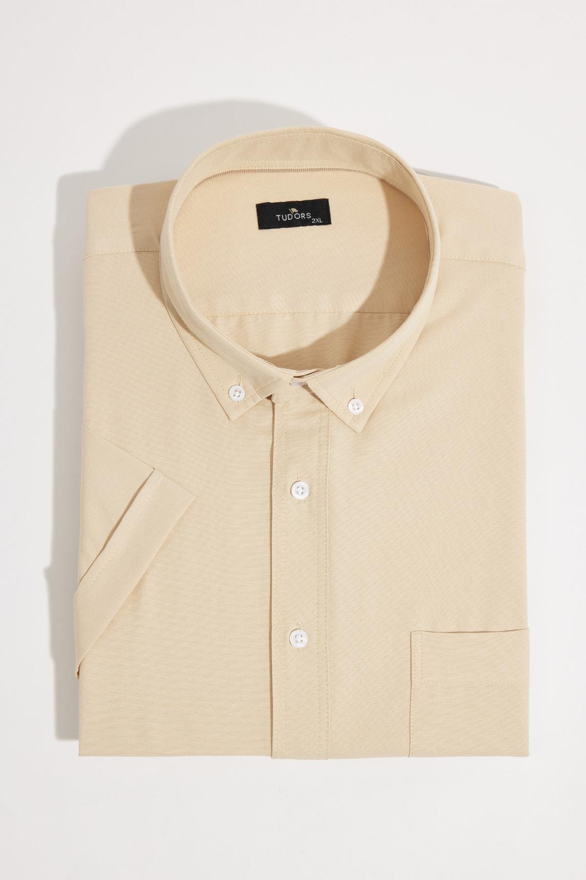 Erkek Büyük Beden Kısa Kol  Yaka Düğmeli Pamuklu Cepli Düz Bej Gömlek