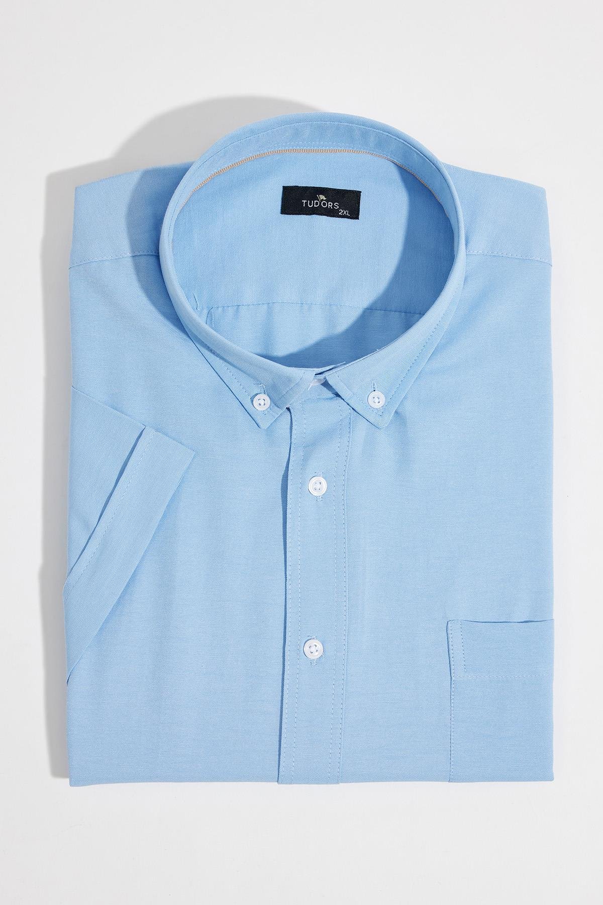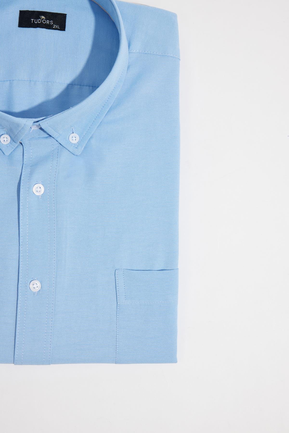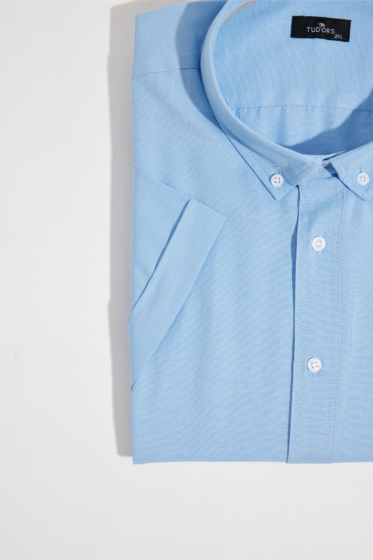 Erkek Büyük Beden Kısa Kol  Yaka Düğmeli Pamuklu Cepli Düz Mavi Gömlek