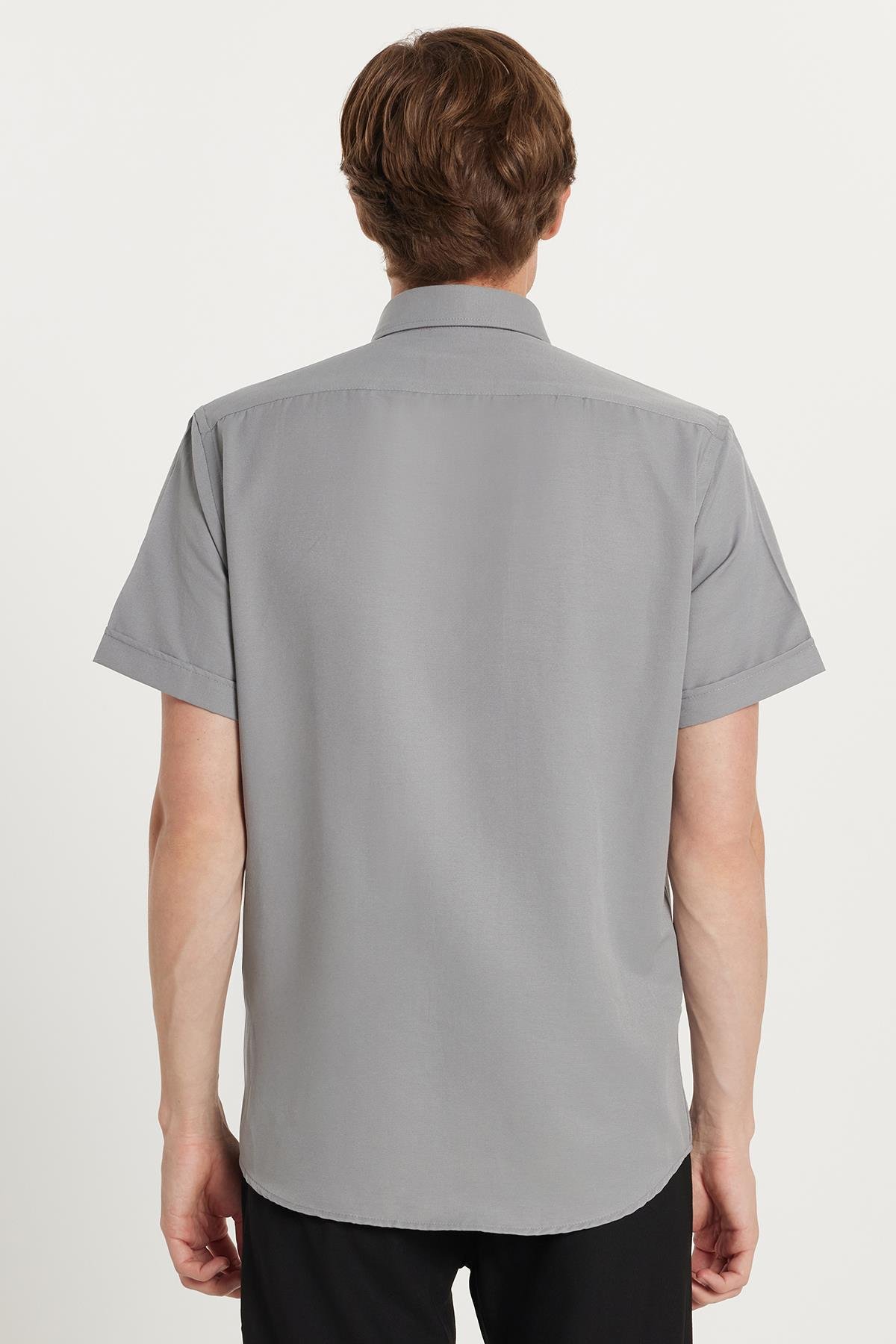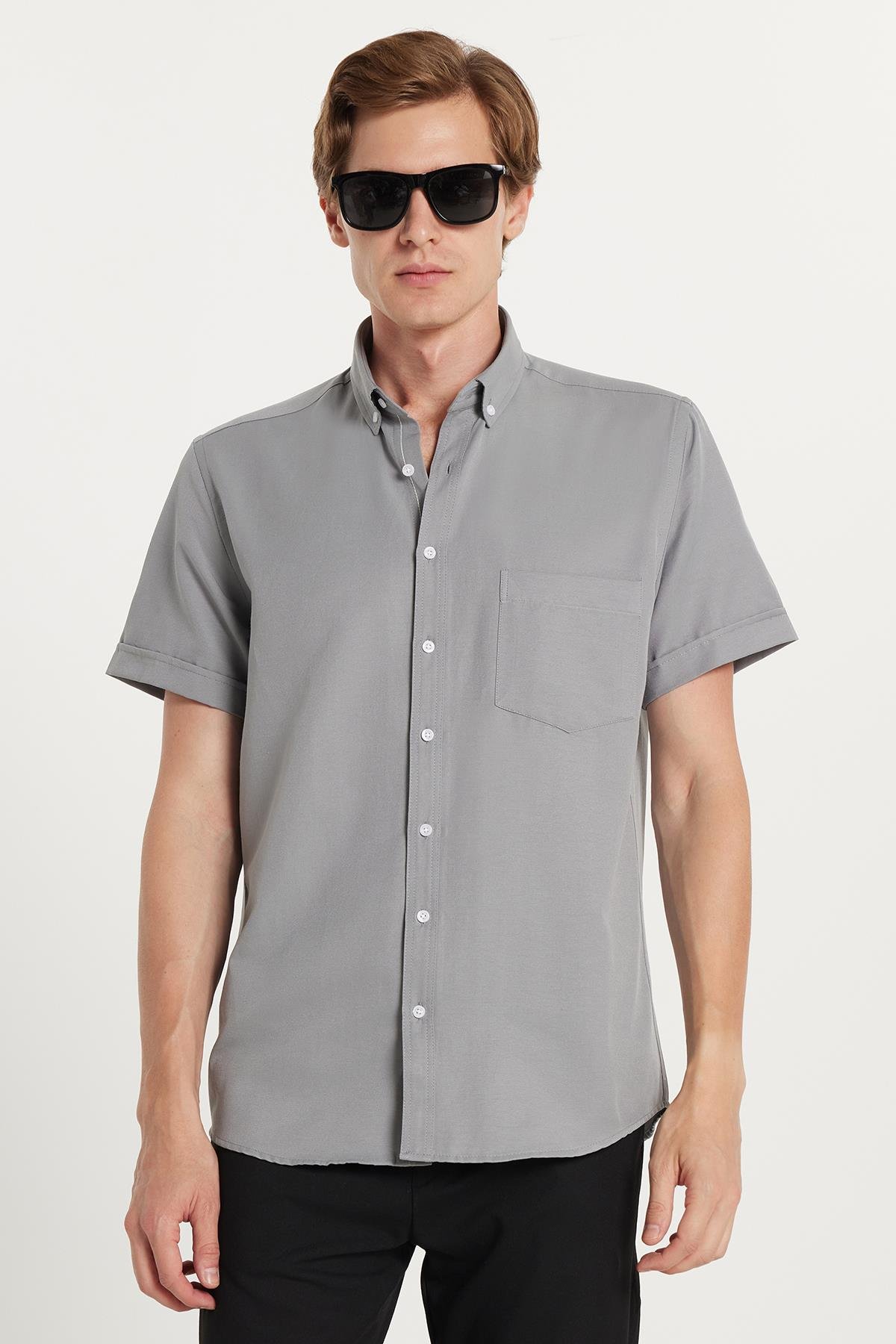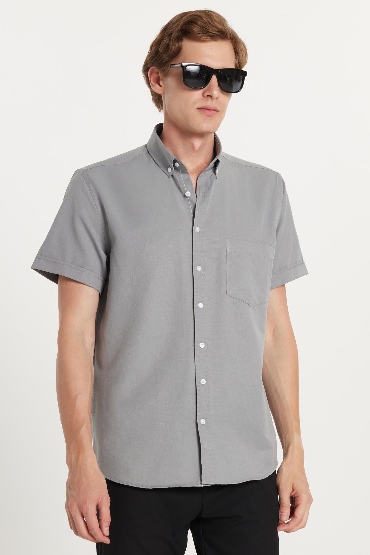 Erkek Klasik Regular Fit Rahat Kesim Düğmeli Spor Yaka Oxford Pamuklu Kısa Kol Gri Gömlek (KL250009-785)