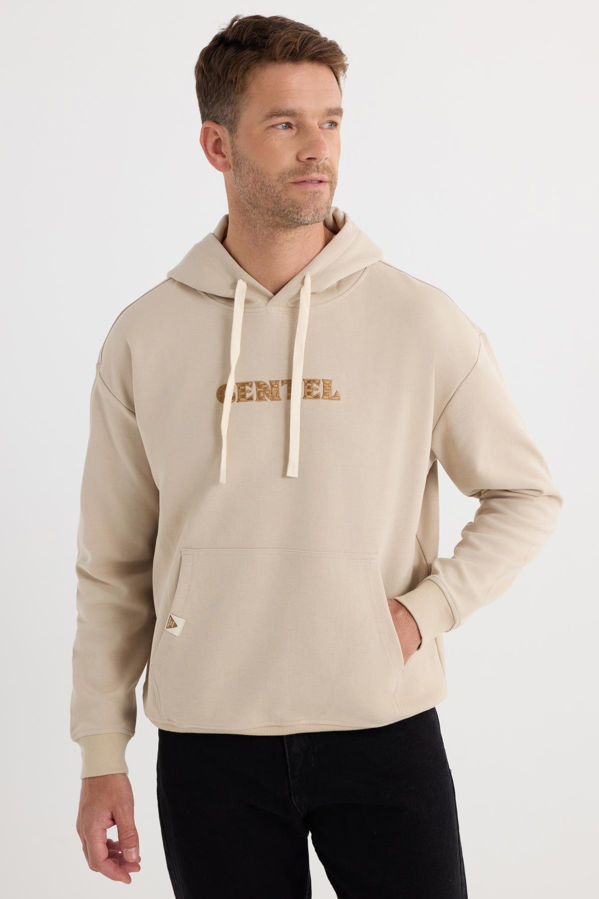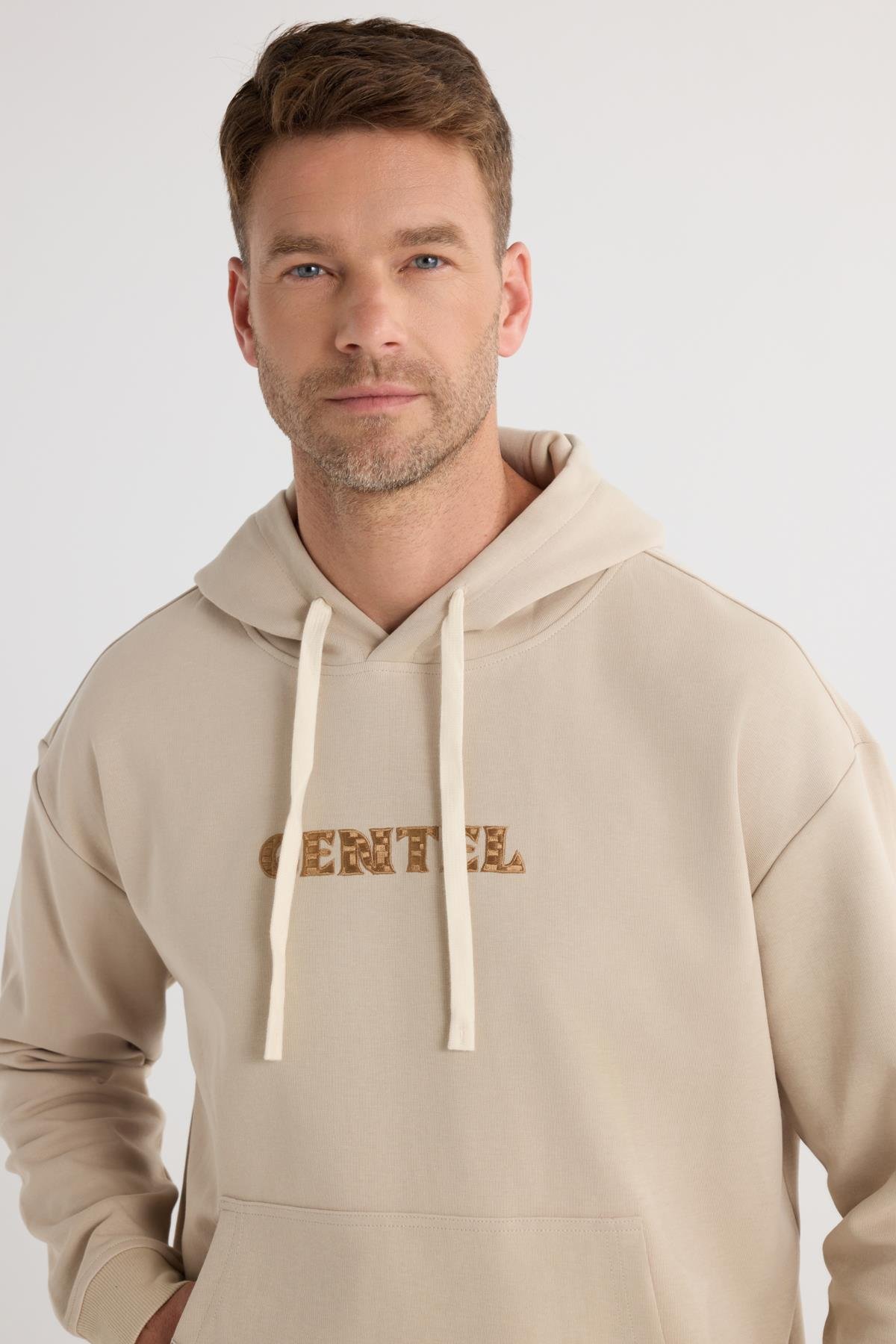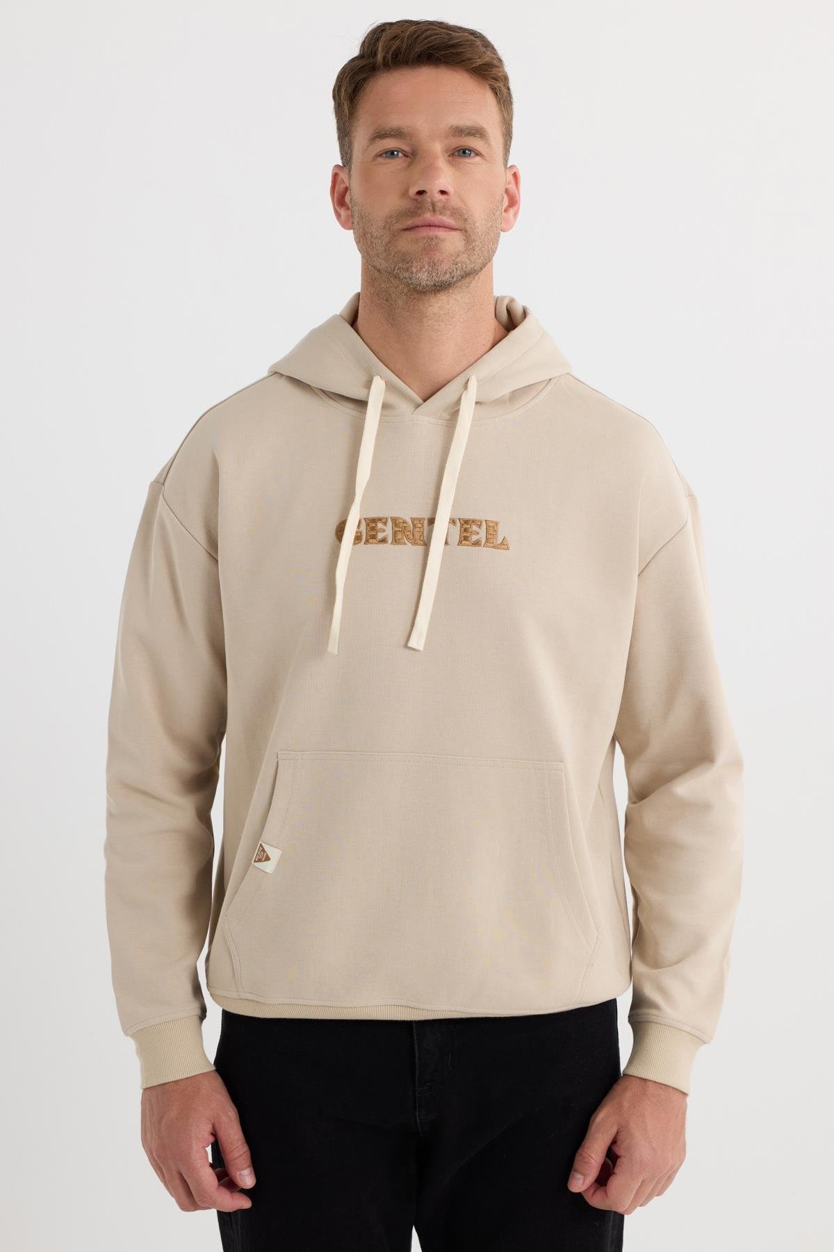 Erkek Oversize Geniş Kesim Pamuklu Baskılı Bej Kapüşonlu Sweatshirt (SW250010-71)