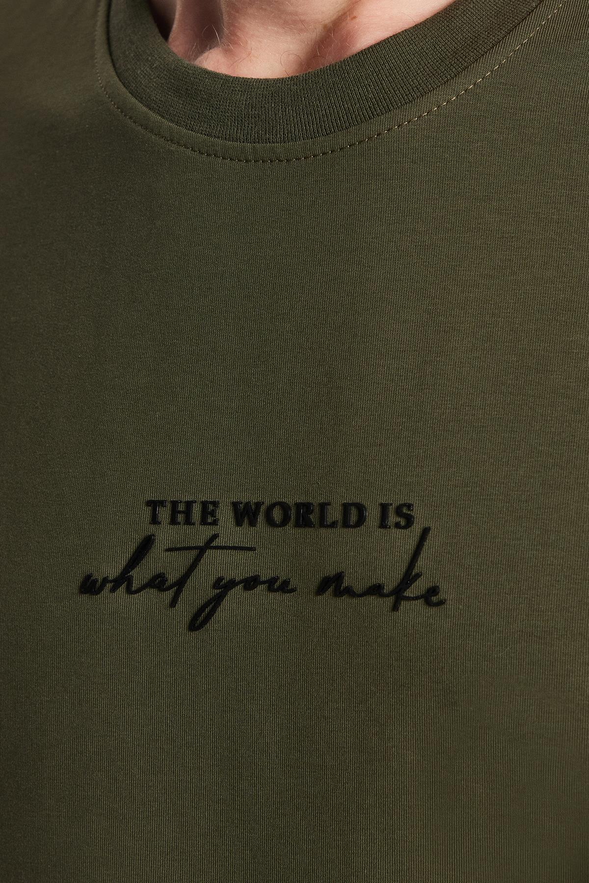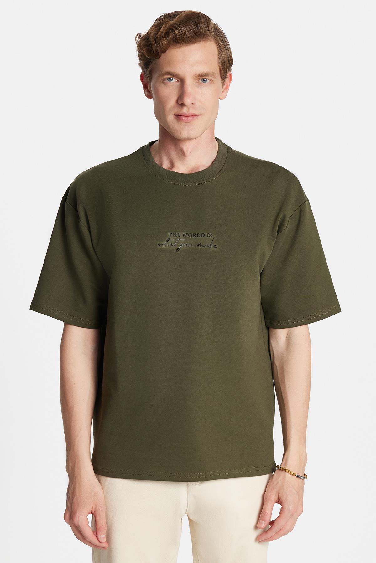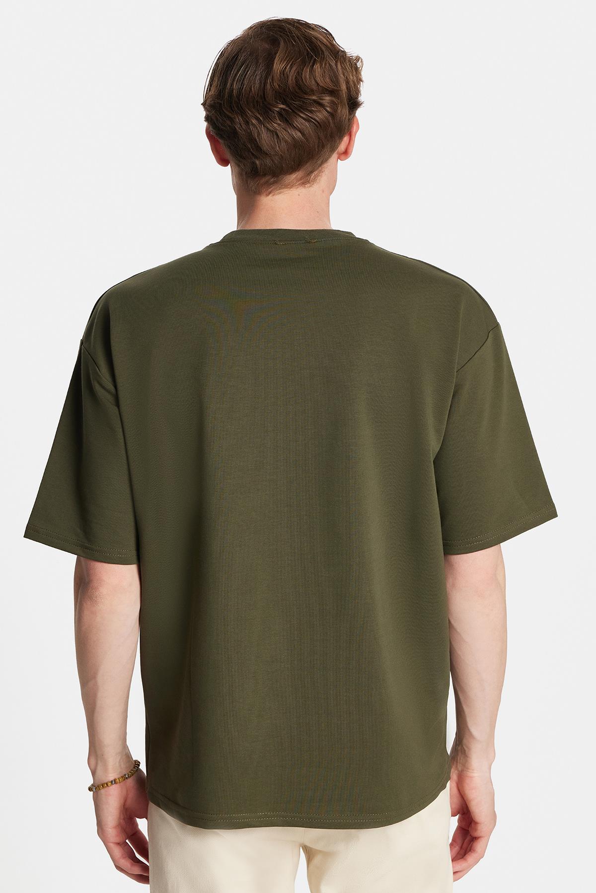 Erkek Oversize Geniş Kesim Pamuklu Baskılı Bisiklet Yaka Haki Tişört (TS250027-4041)