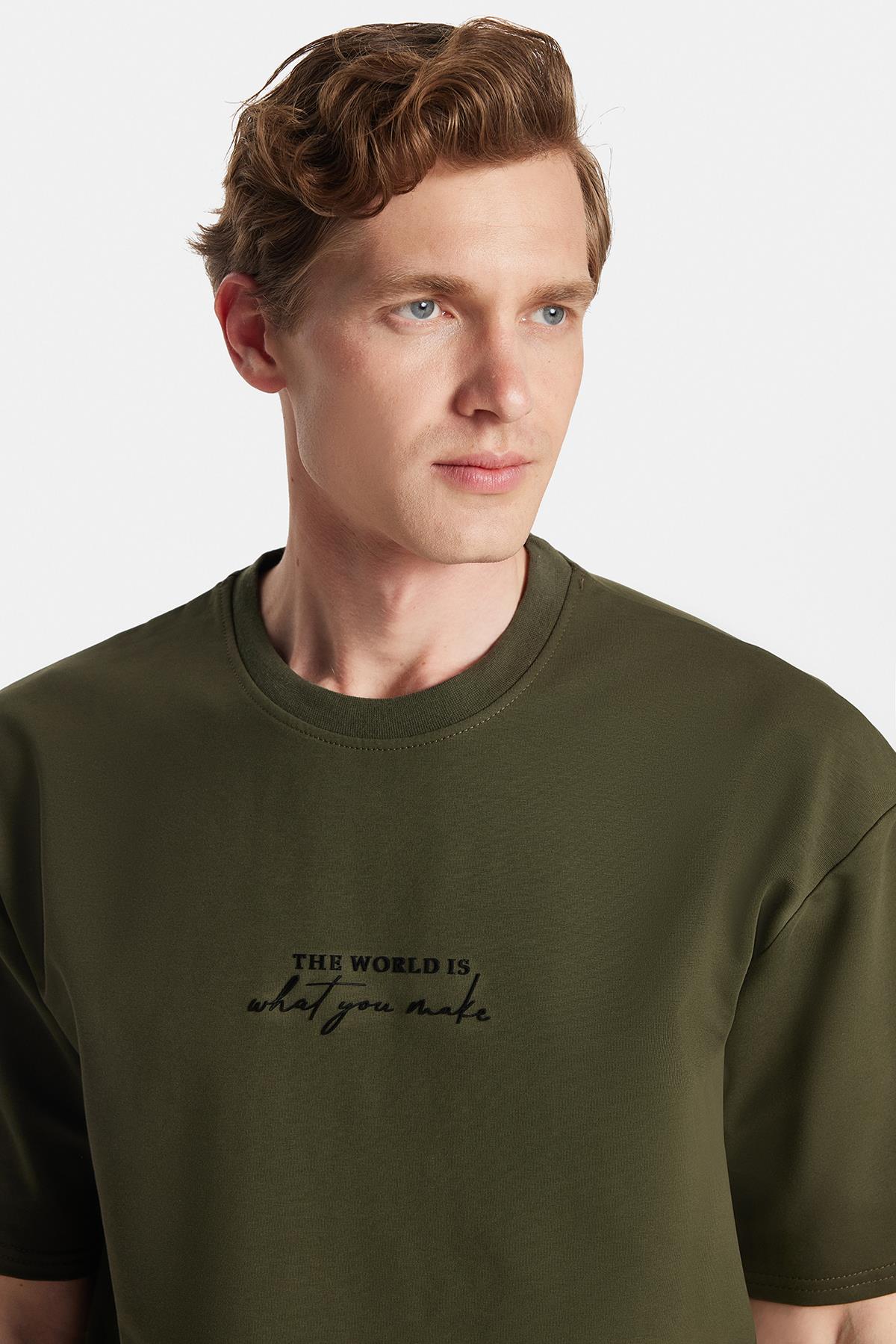Erkek Oversize Geniş Kesim Pamuklu Baskılı Bisiklet Yaka Haki Tişört