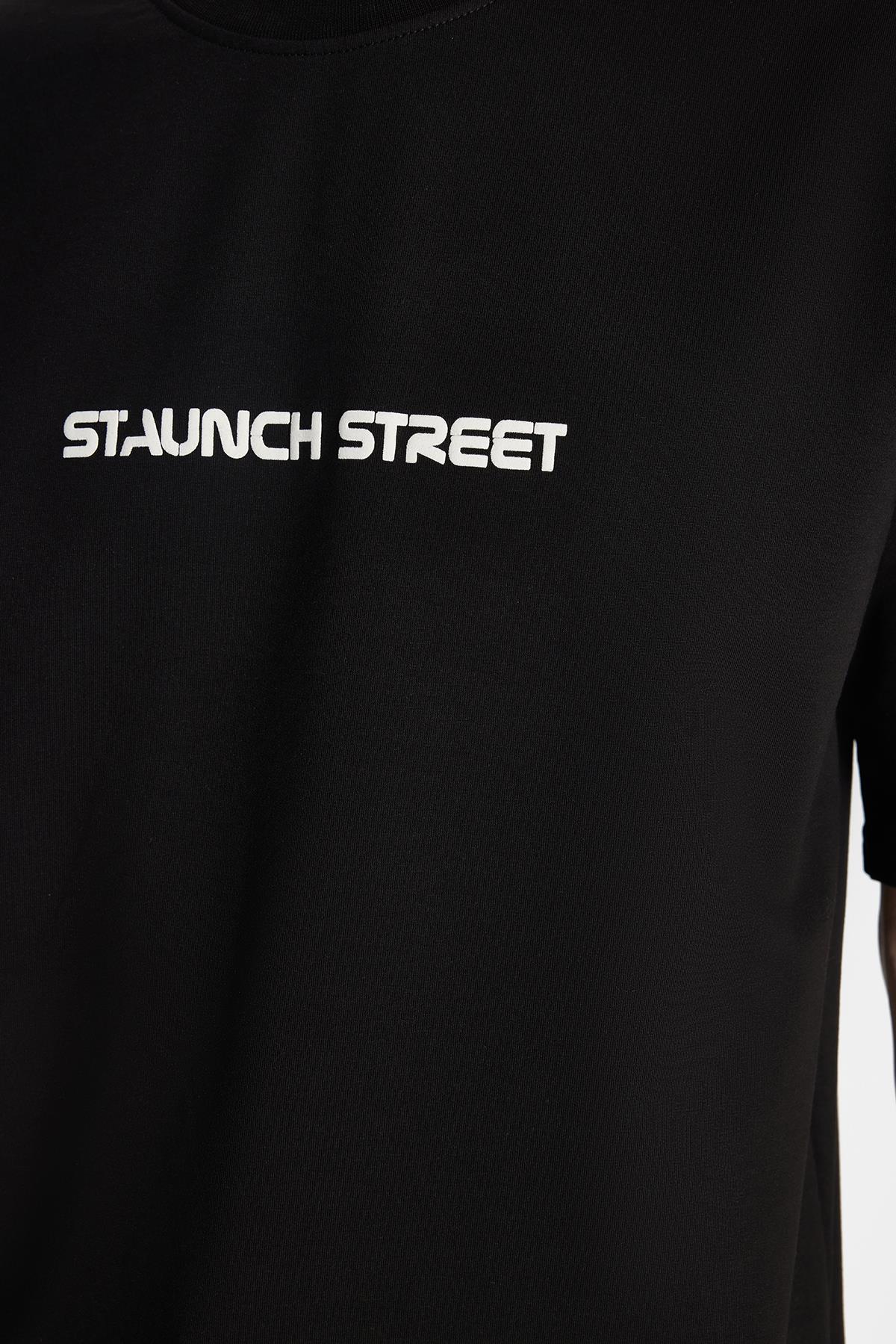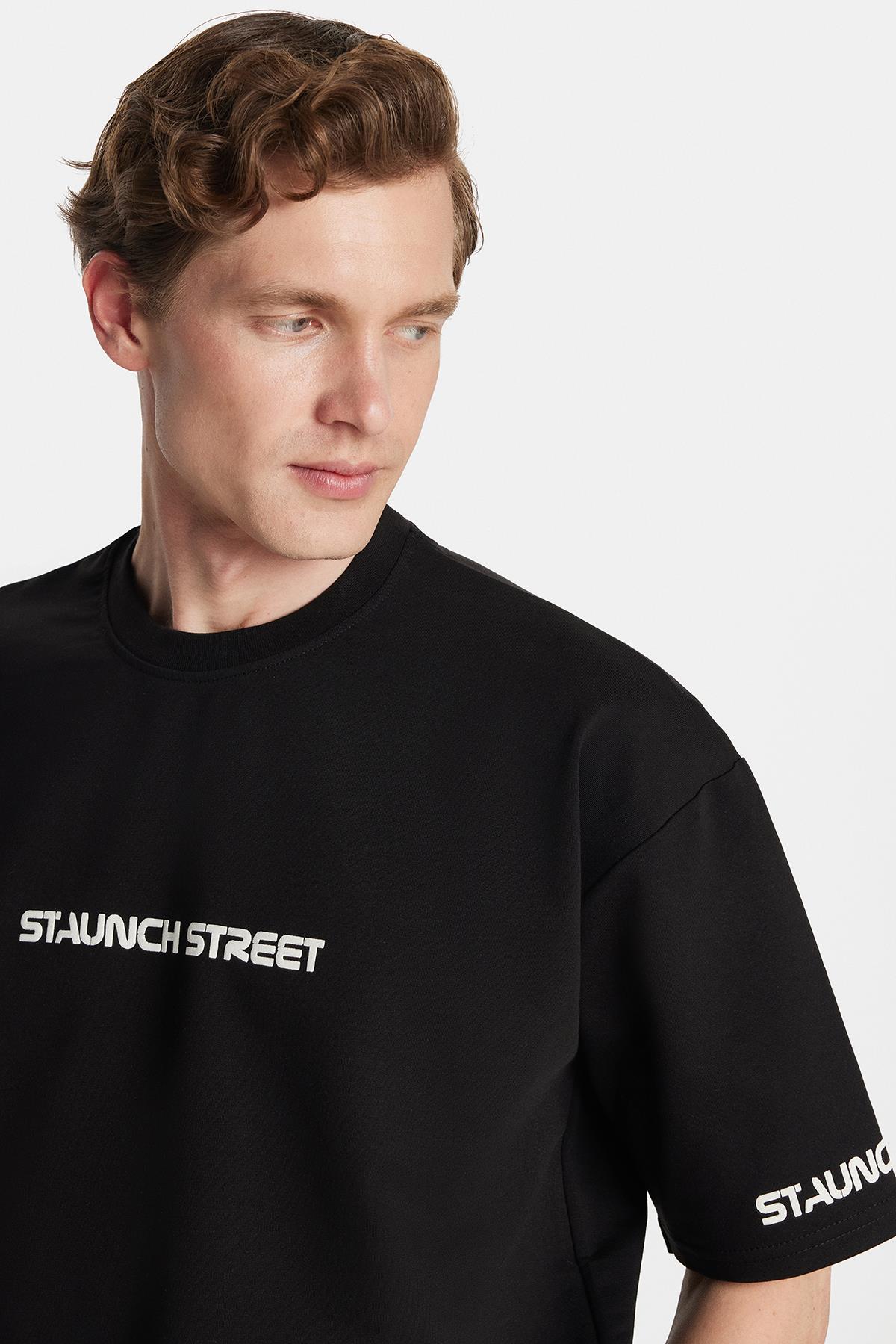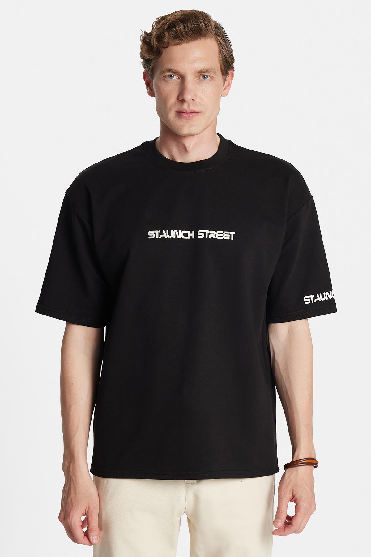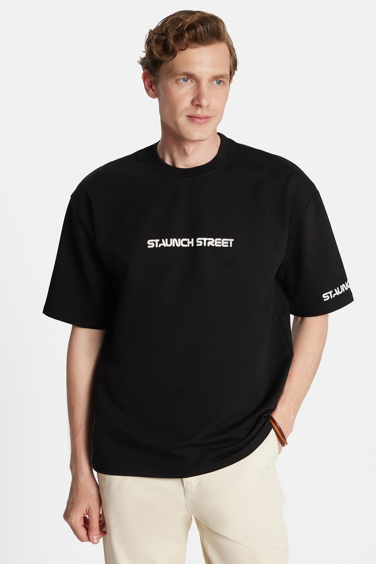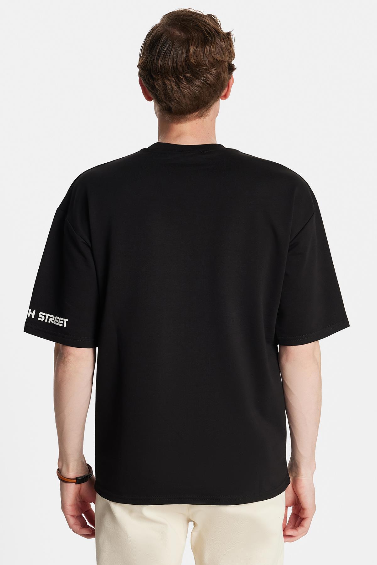 Erkek Oversize Geniş Kesim Pamuklu Baskılı Bisiklet Yaka Siyah Tişört