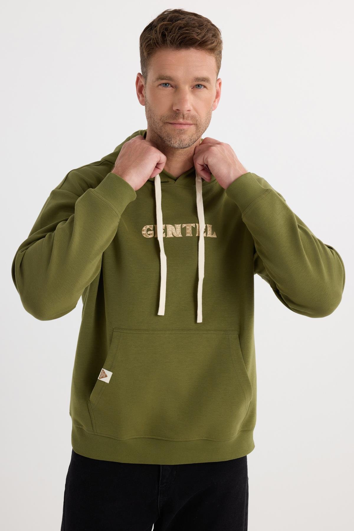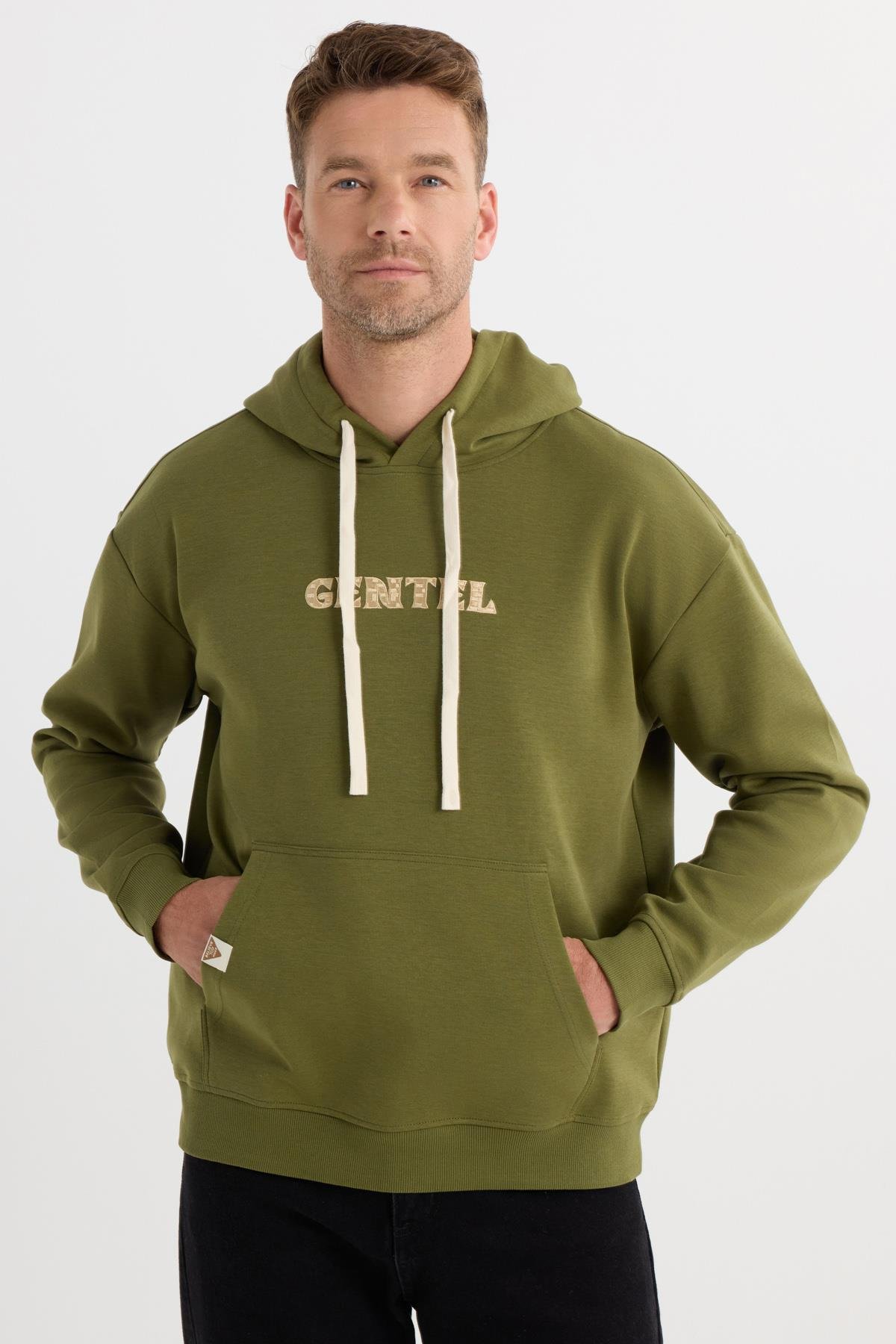 Erkek Oversize Geniş Kesim Pamuklu Baskılı Yeşil Kapüşonlu Sweatshirt