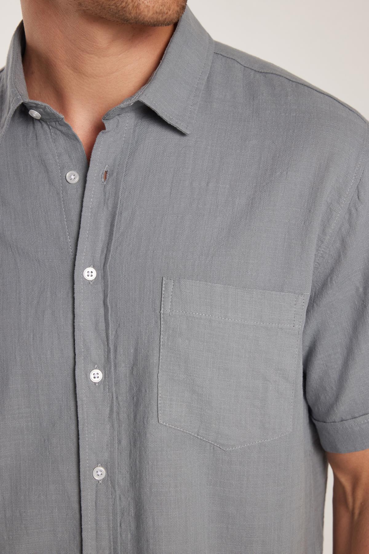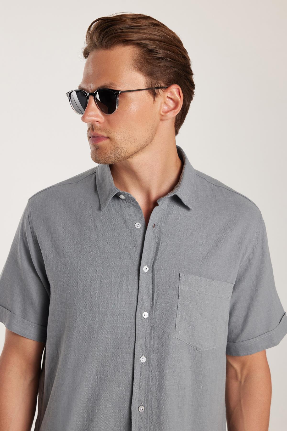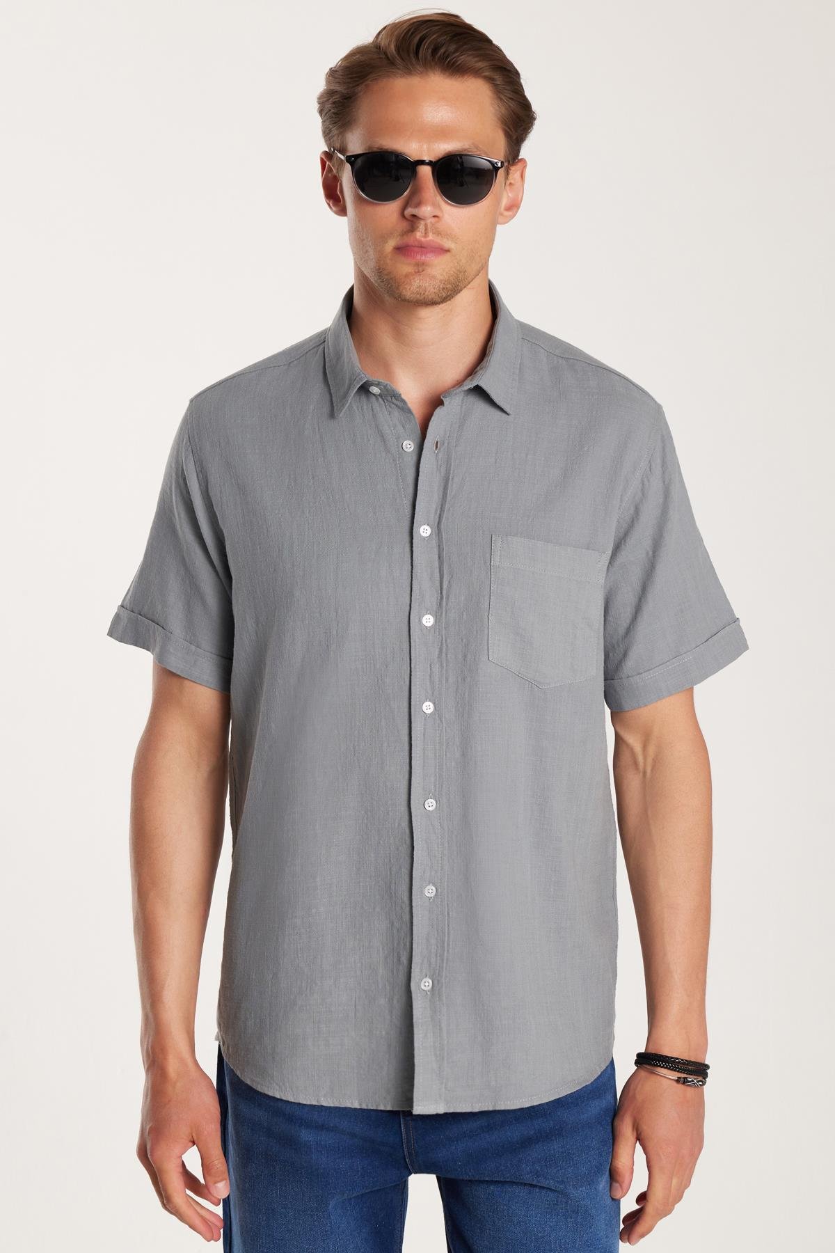 Erkek Regular Fit Klasik Kesim %100 Pamuk Keten Doku Cepli Gri Gömlek