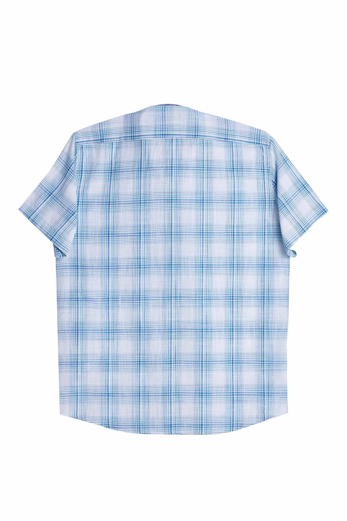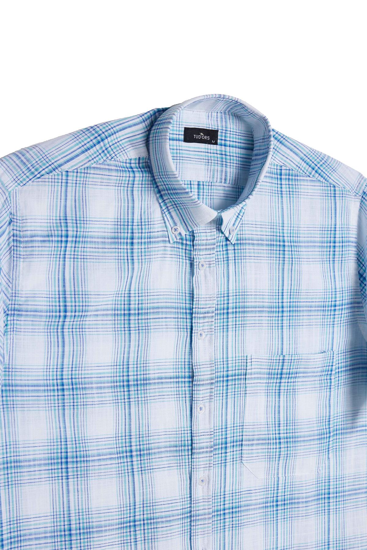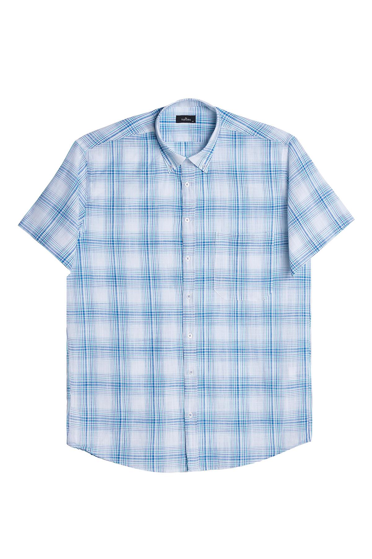 Erkek Regular Fit Klasik Kesim %100 Pamuk Keten Doku Cepli Kareli Kısa Kollu Düğmeli Yaka Gömlek