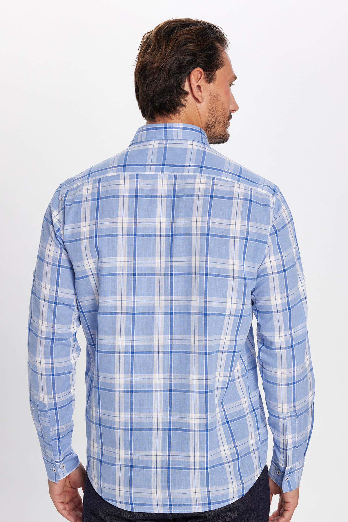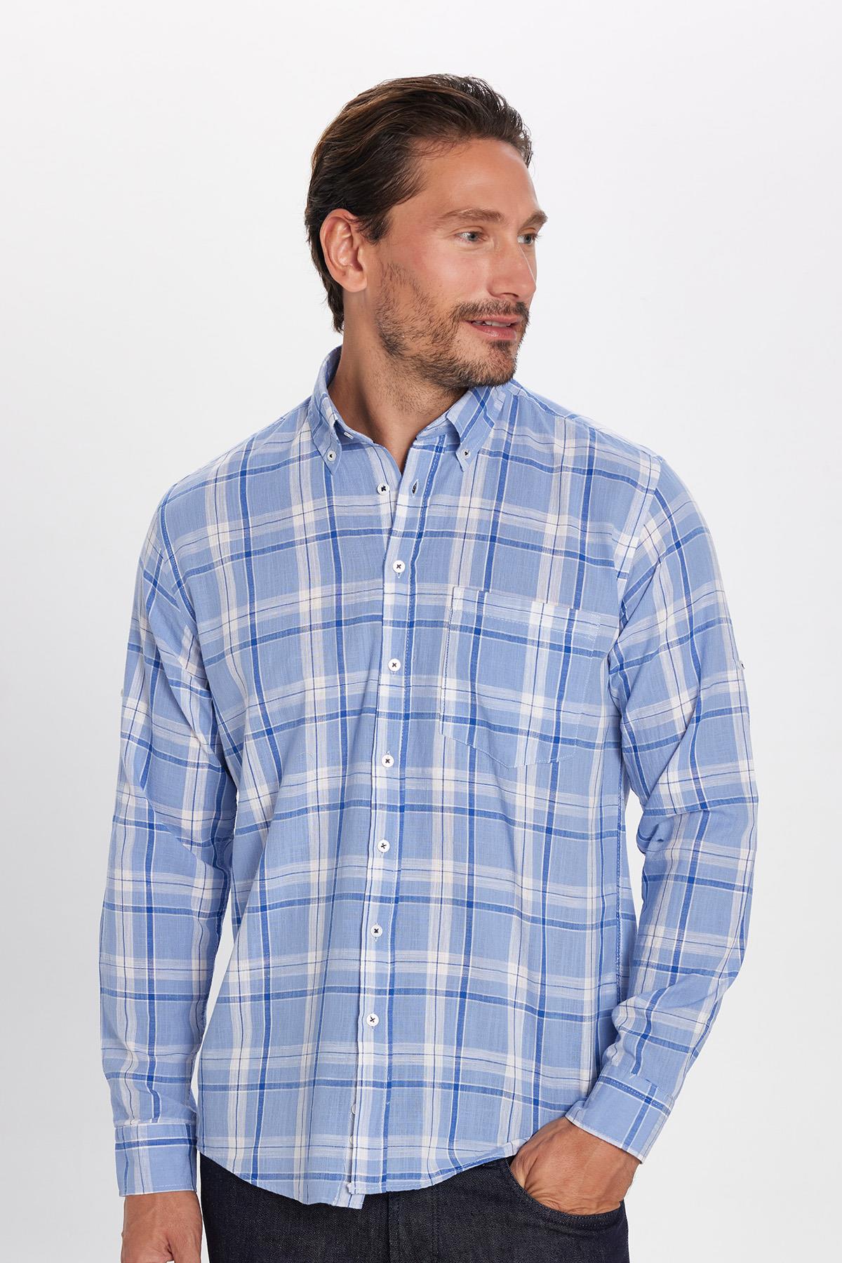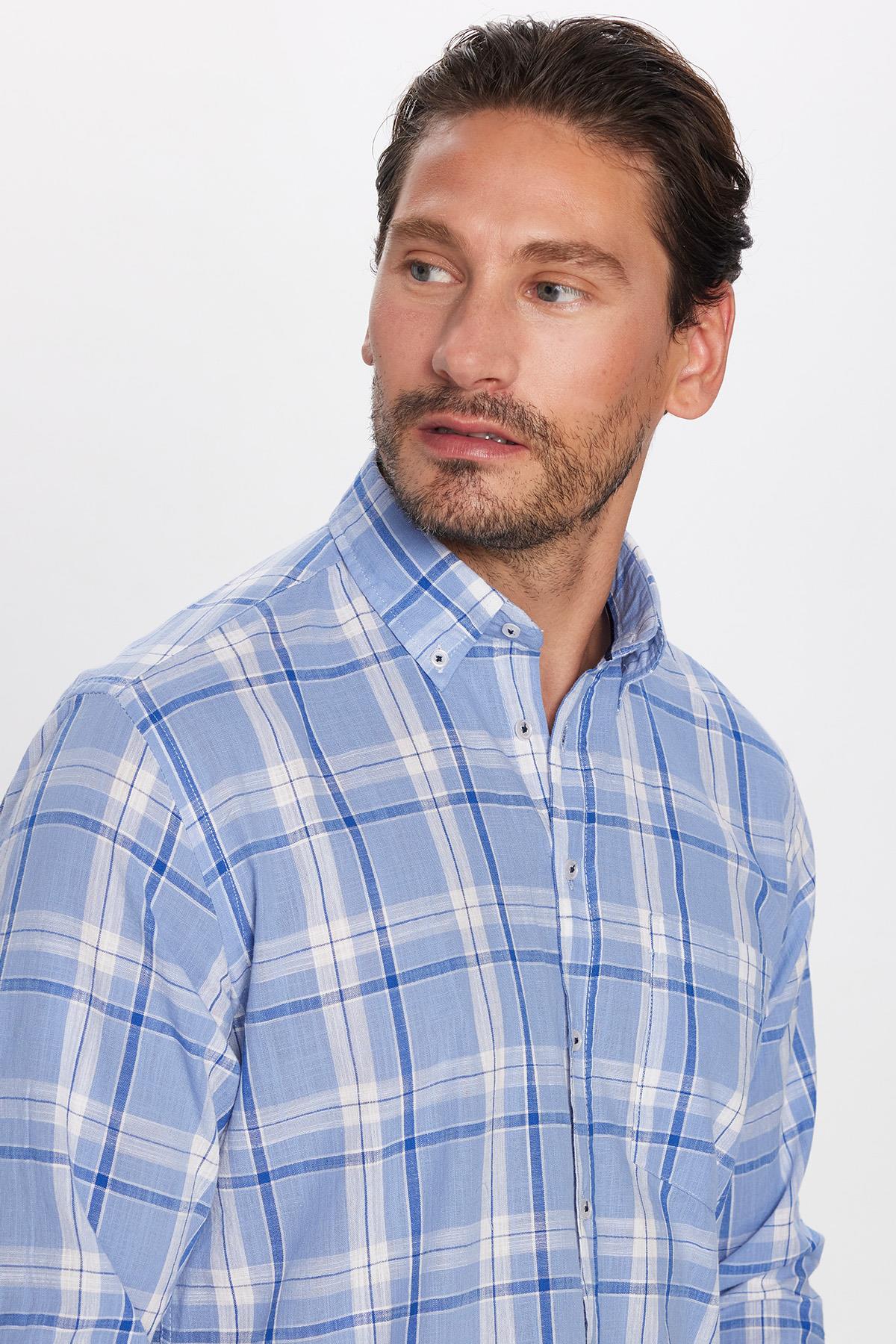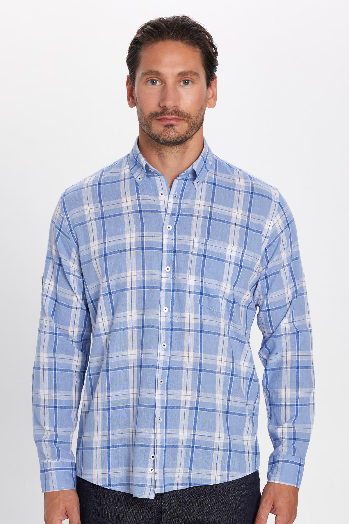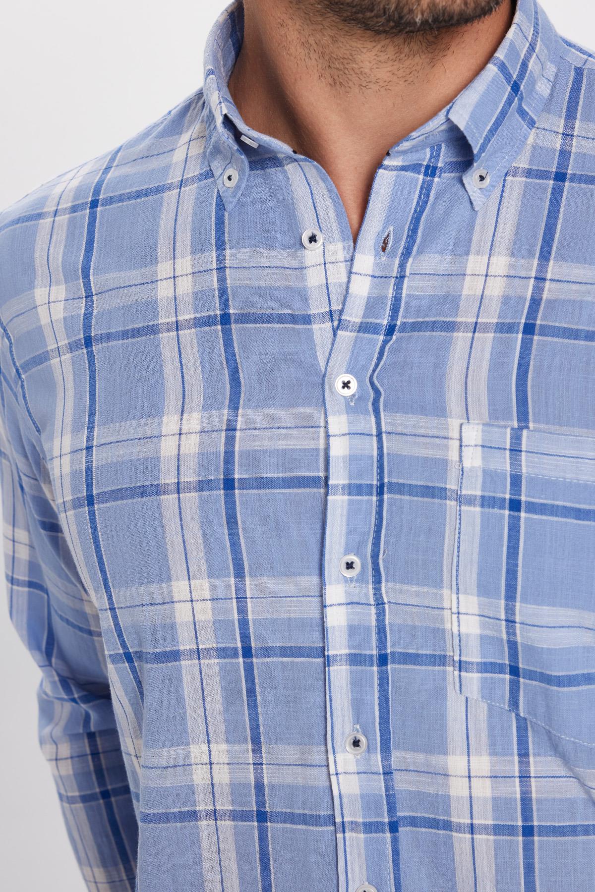 Erkek Regular Fit Klasik Kesim %100 Pamuk Keten Doku Tek Cep Kareli Düğmeli Yaka Gömlek