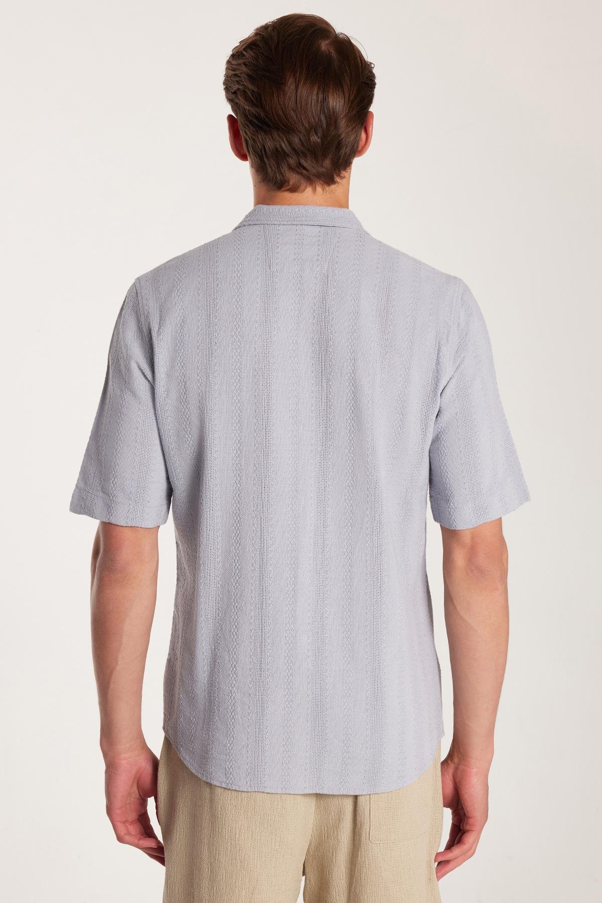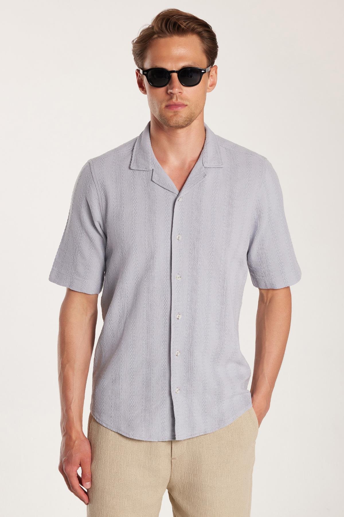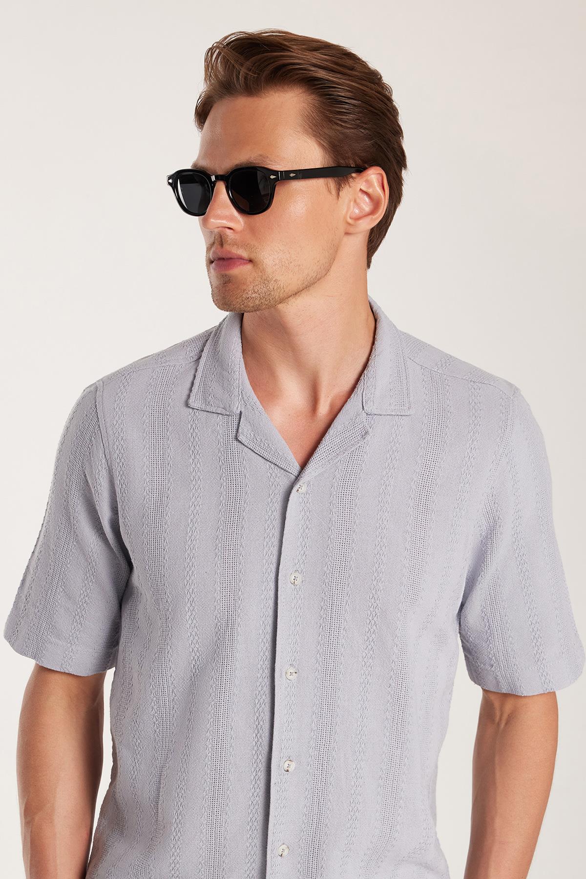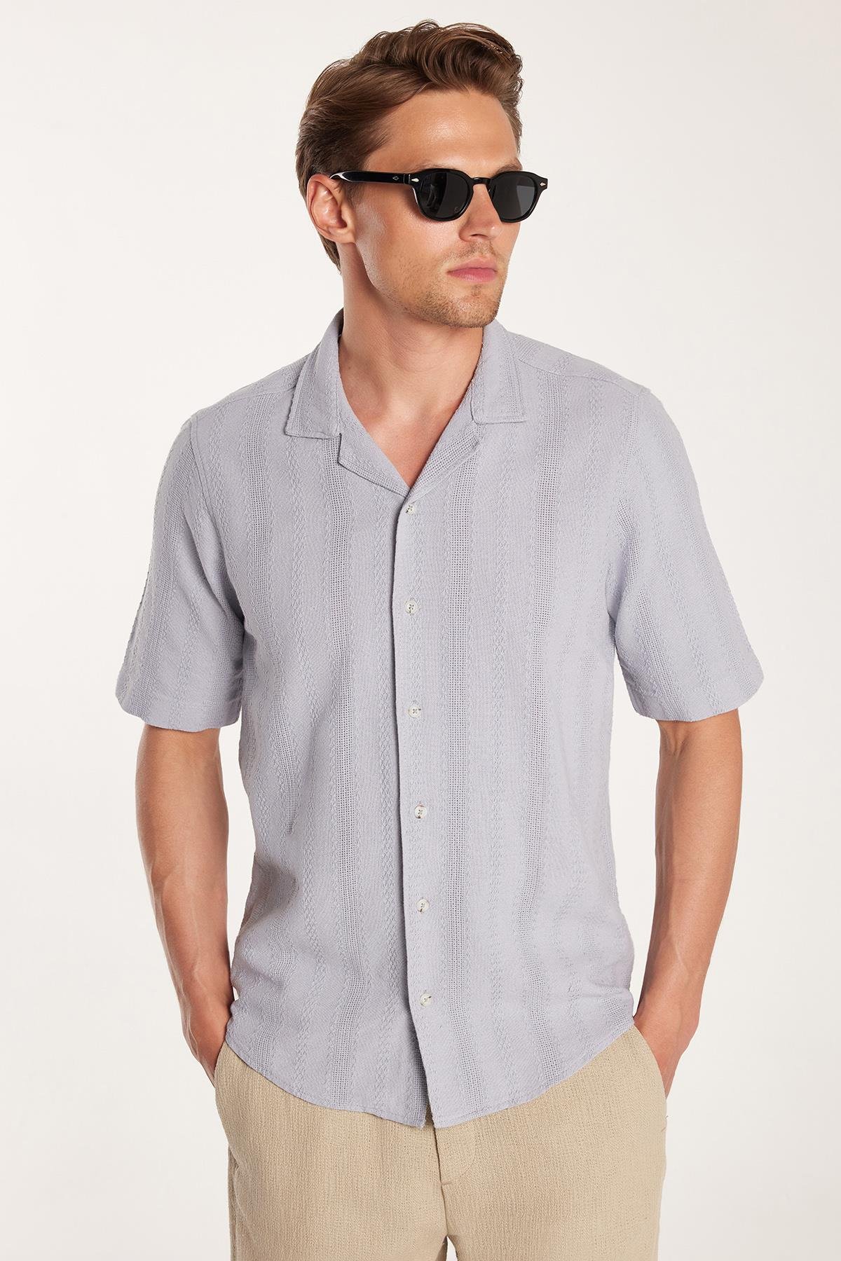 Erkek Regular Fit Klasik Kesim %100 Pamuk Keten Efekt Kısa Kollu Spor Apaş Yaka Gri Gömlek (RG250010-11)