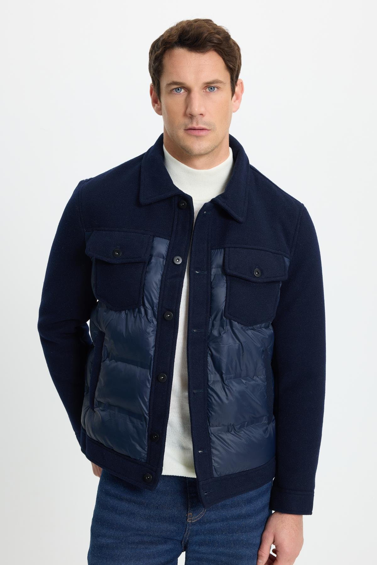Erkek Regular Fit Klasik Kesim Çift Cepli Klasik Yaka Sıcak Tutan Lacivert Kaşe Mont (MT250011-47)