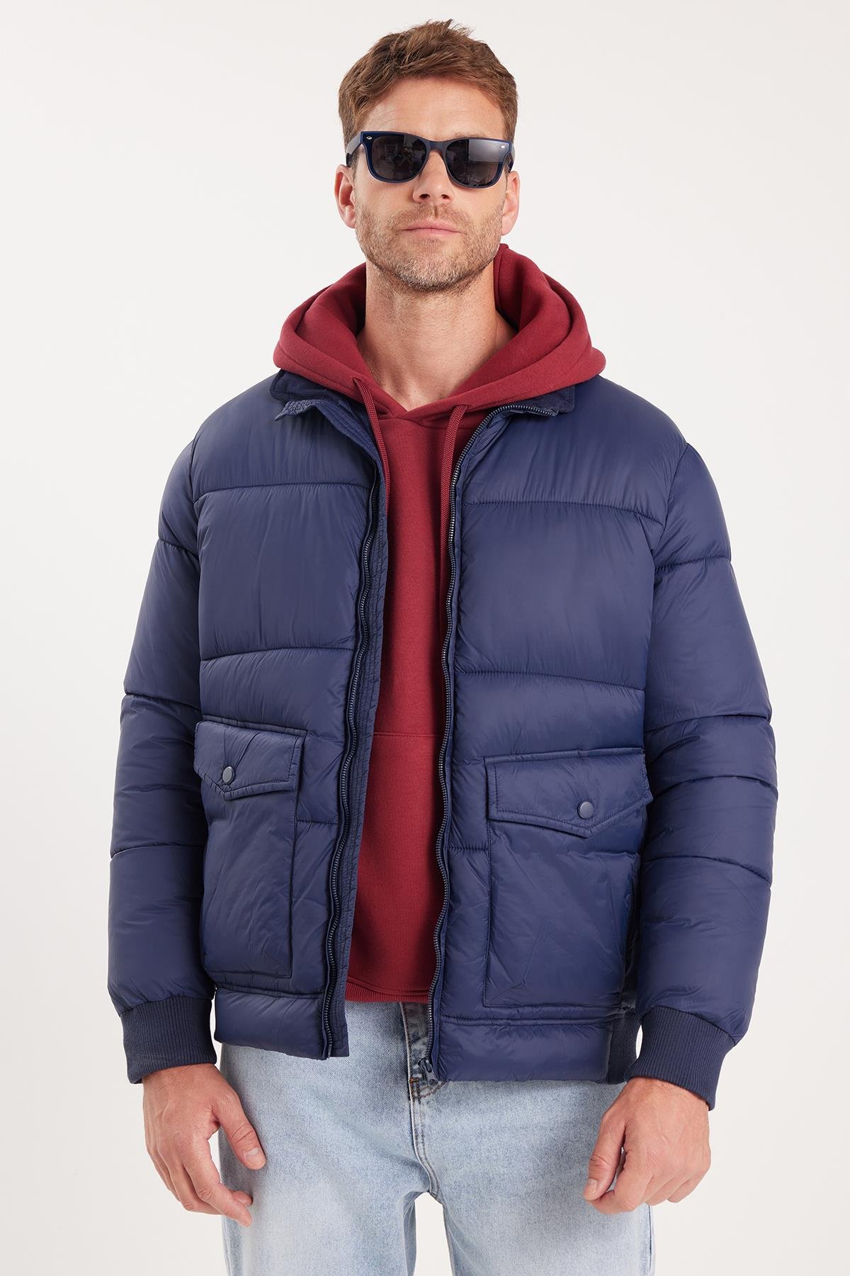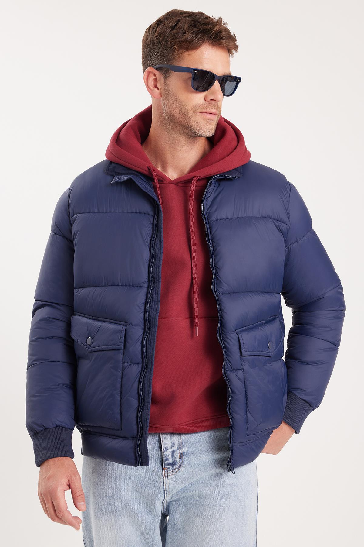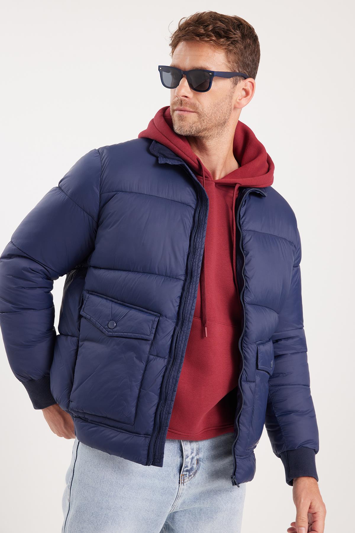 Erkek Regular Fit Klasik Kesim Çift Cepli Lastikli Sıcak Tutan Dik Yaka Lacivert Mont