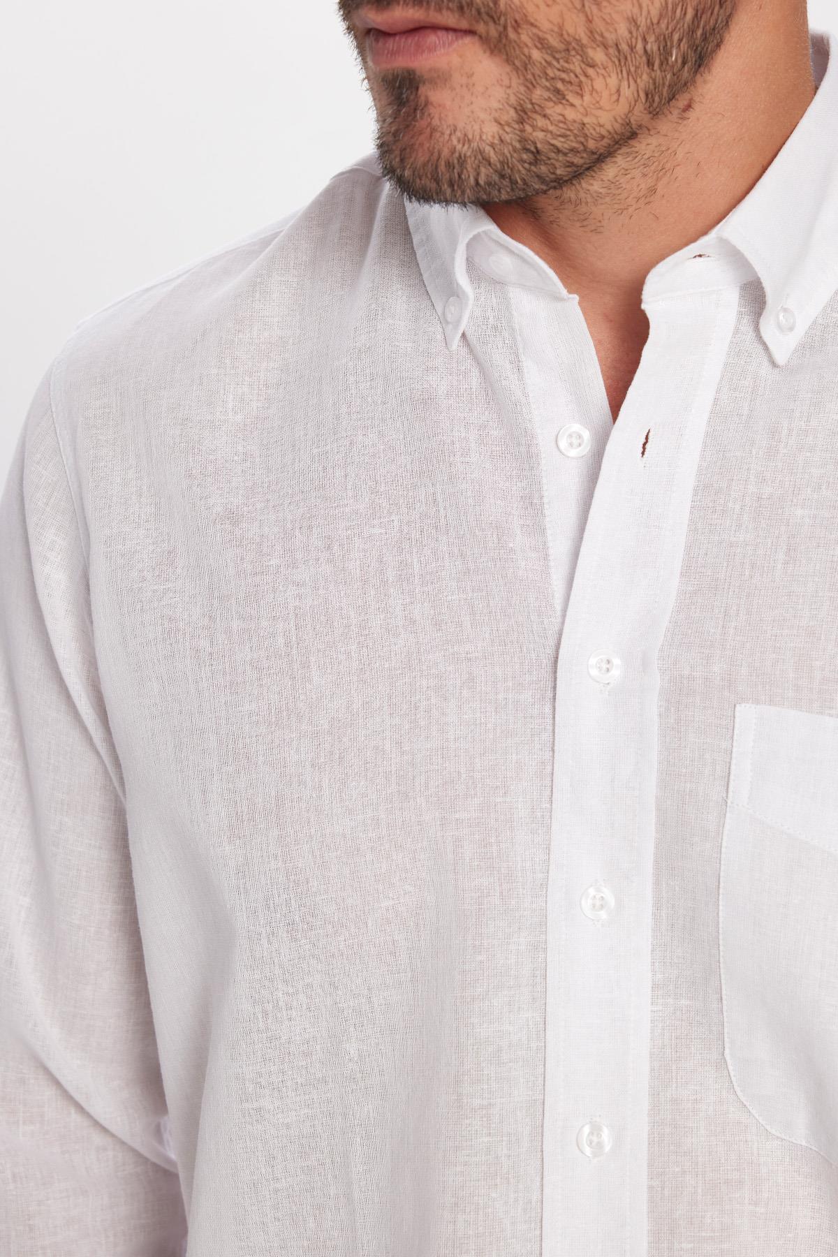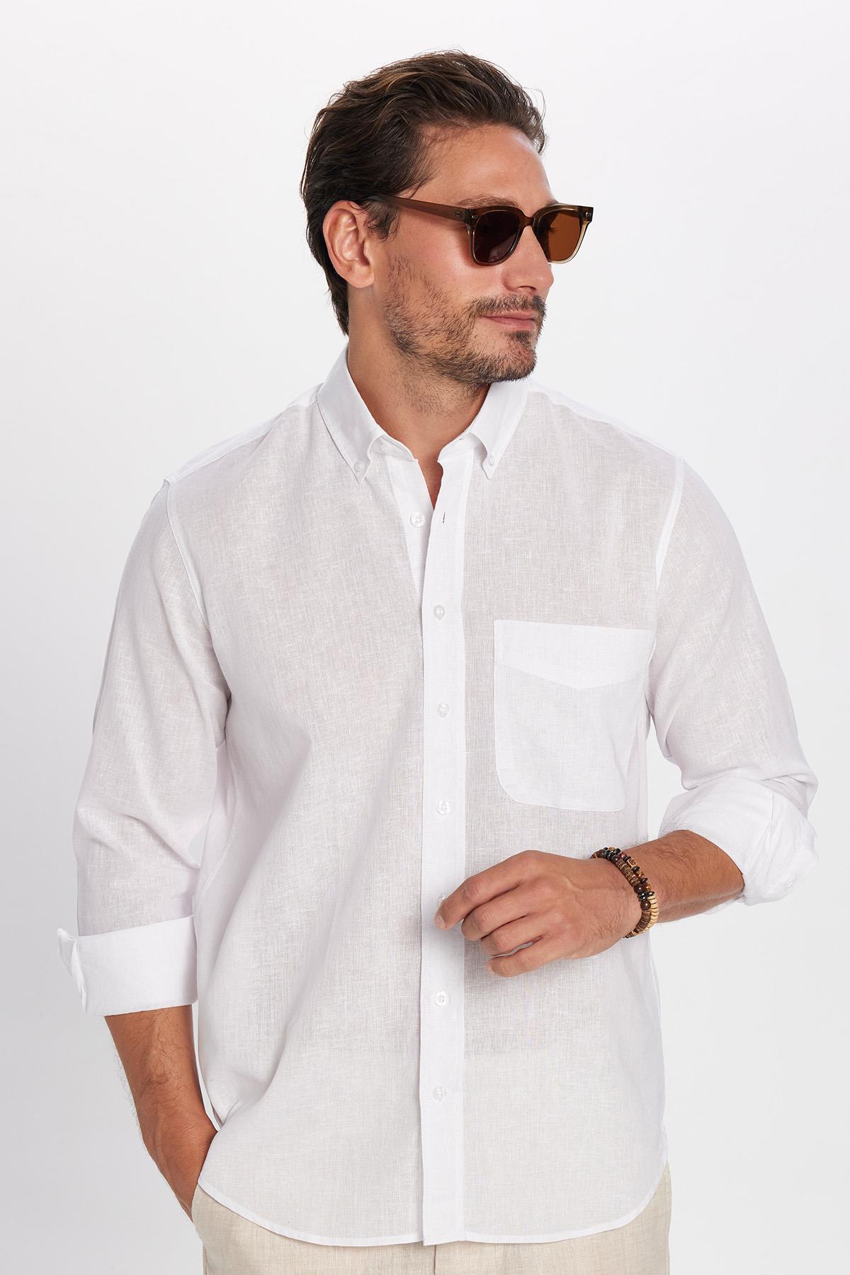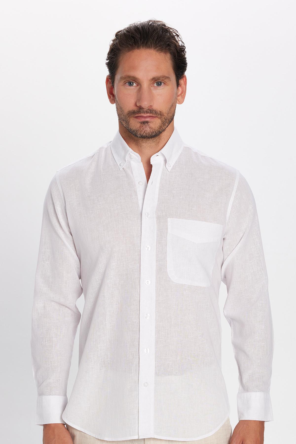 Erkek Regular Fit Klasik Kesim Pamuklu Keten Doku Düğmeli Yaka Beyaz Gömlek