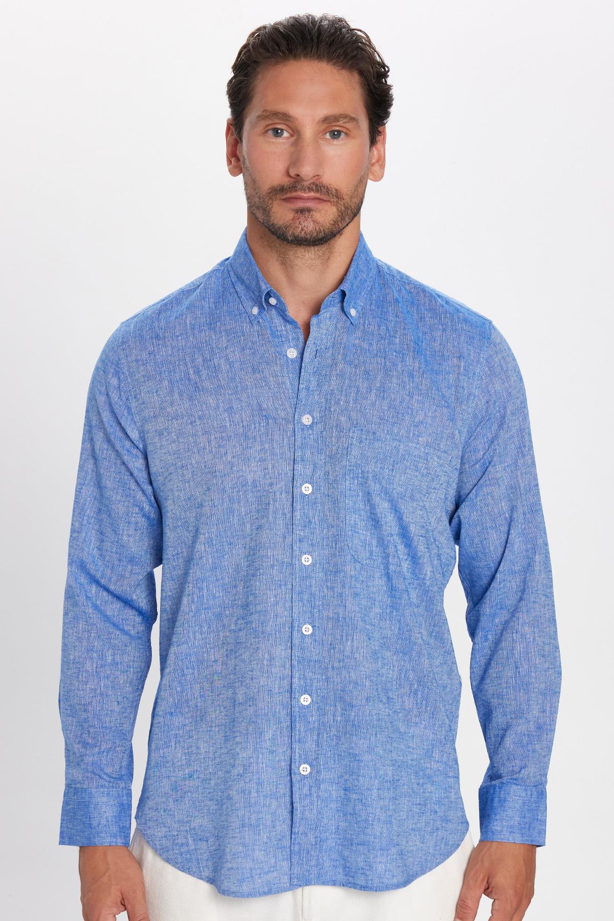Erkek Regular Fit Klasik Kesim Pamuklu Keten Doku Düğmeli Yaka Koyu Mavi Gömlek (RG250002-5059)