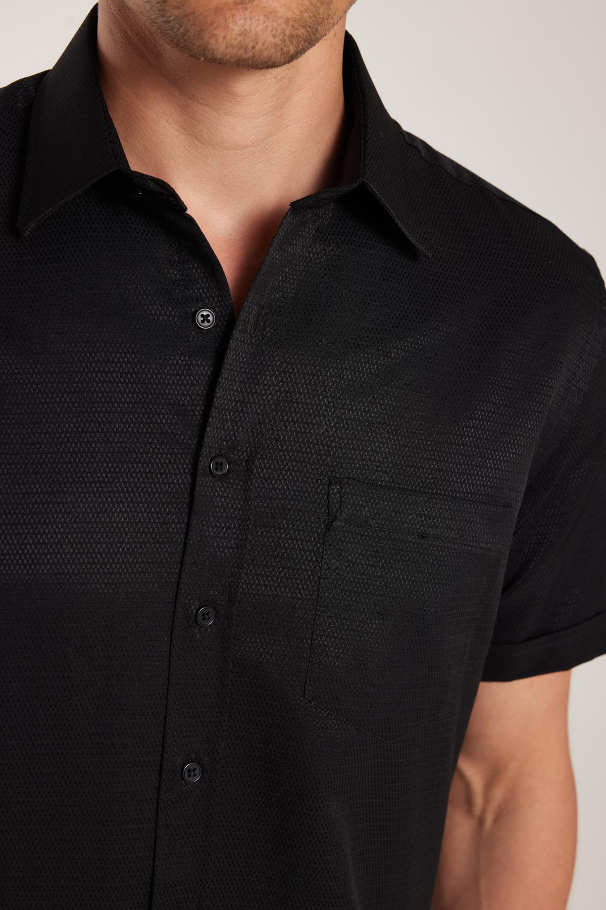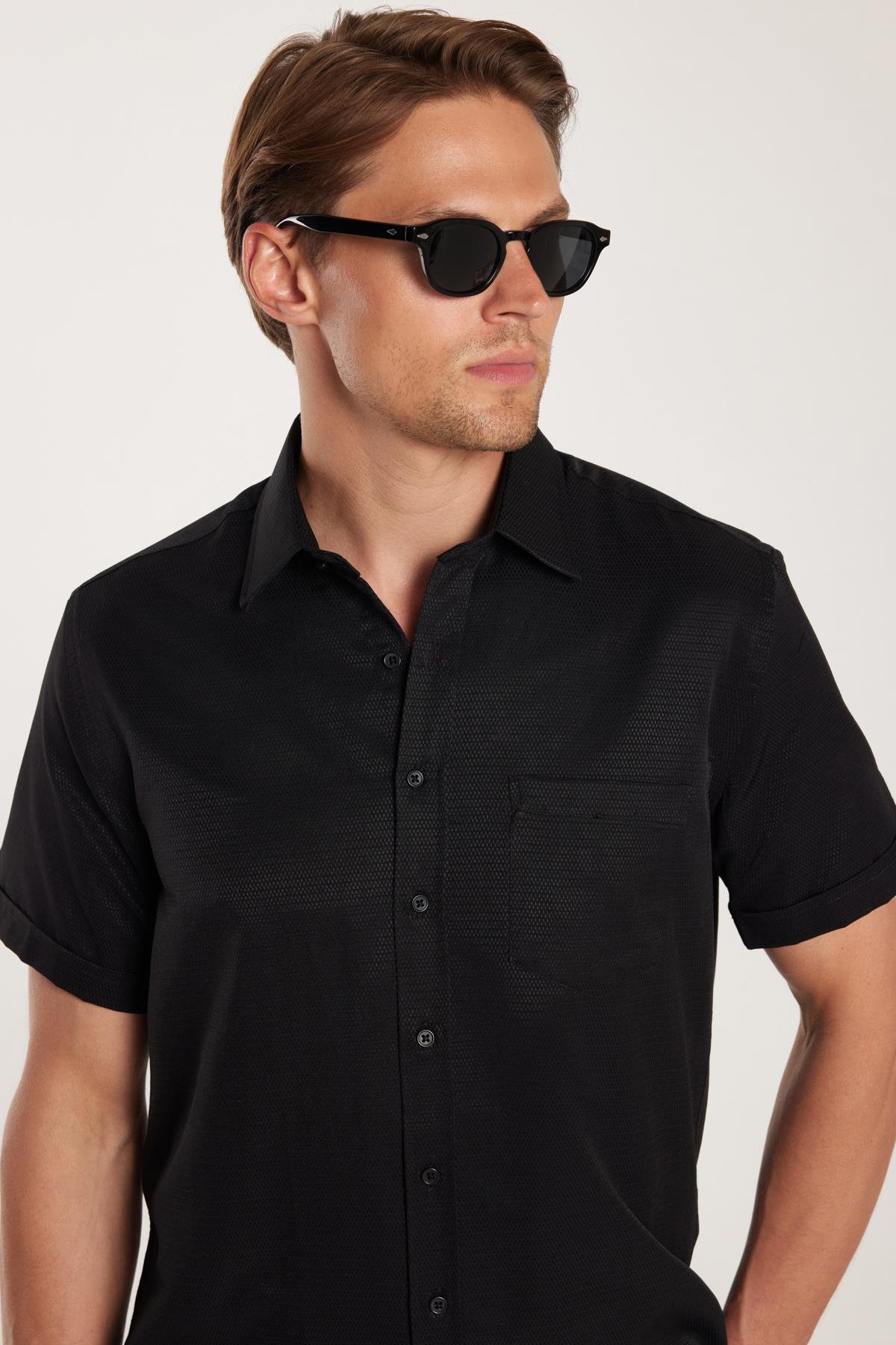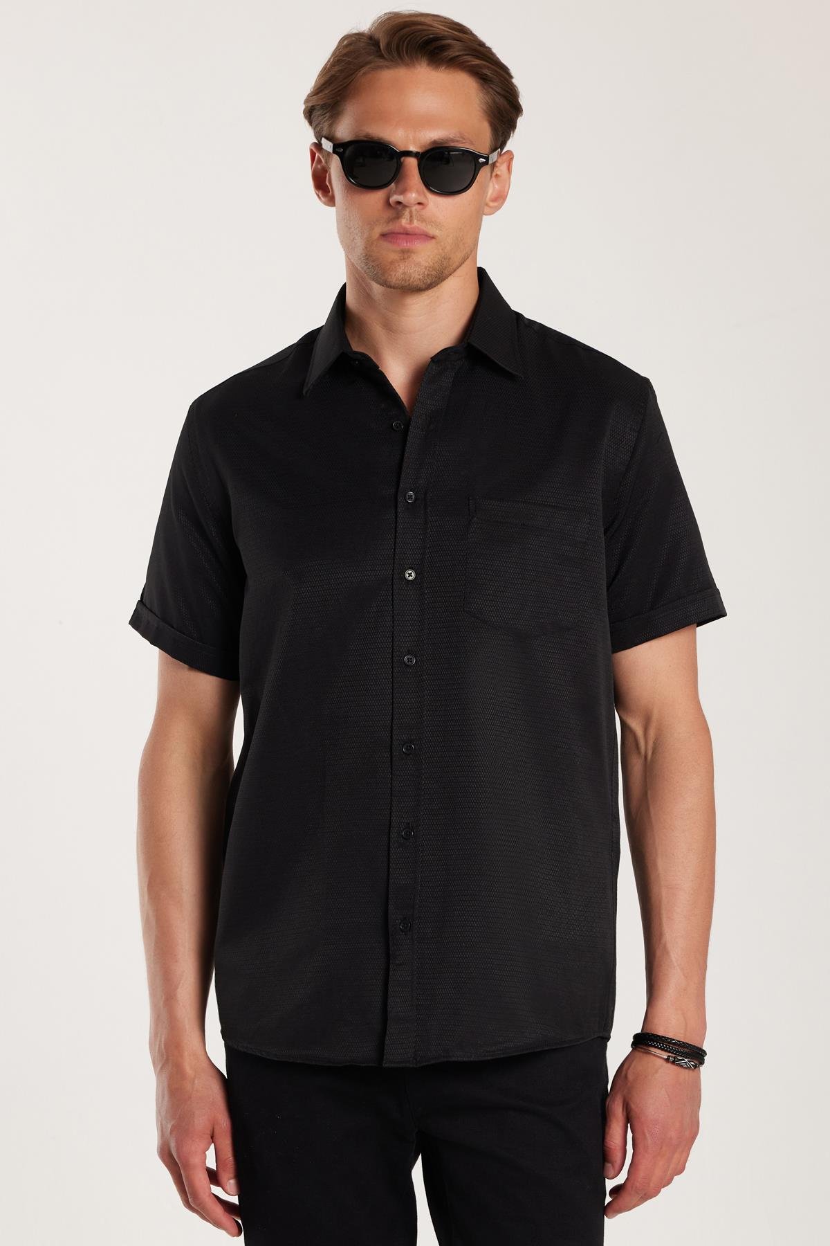 Erkek Regular Fit Klasik Kesim Kısa Kollu Pamuklu Tek Cepli Armürlü Siyah Gömlek