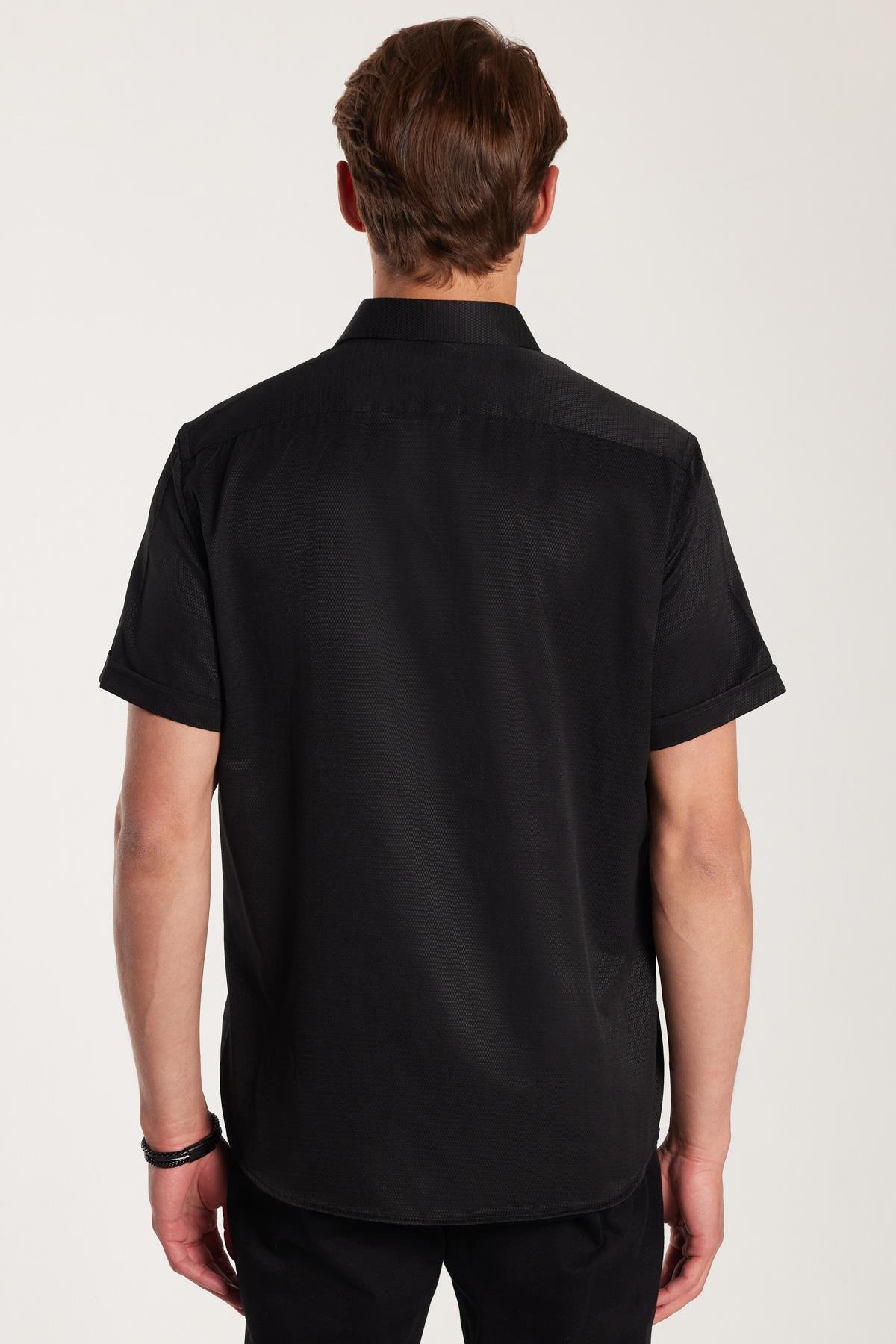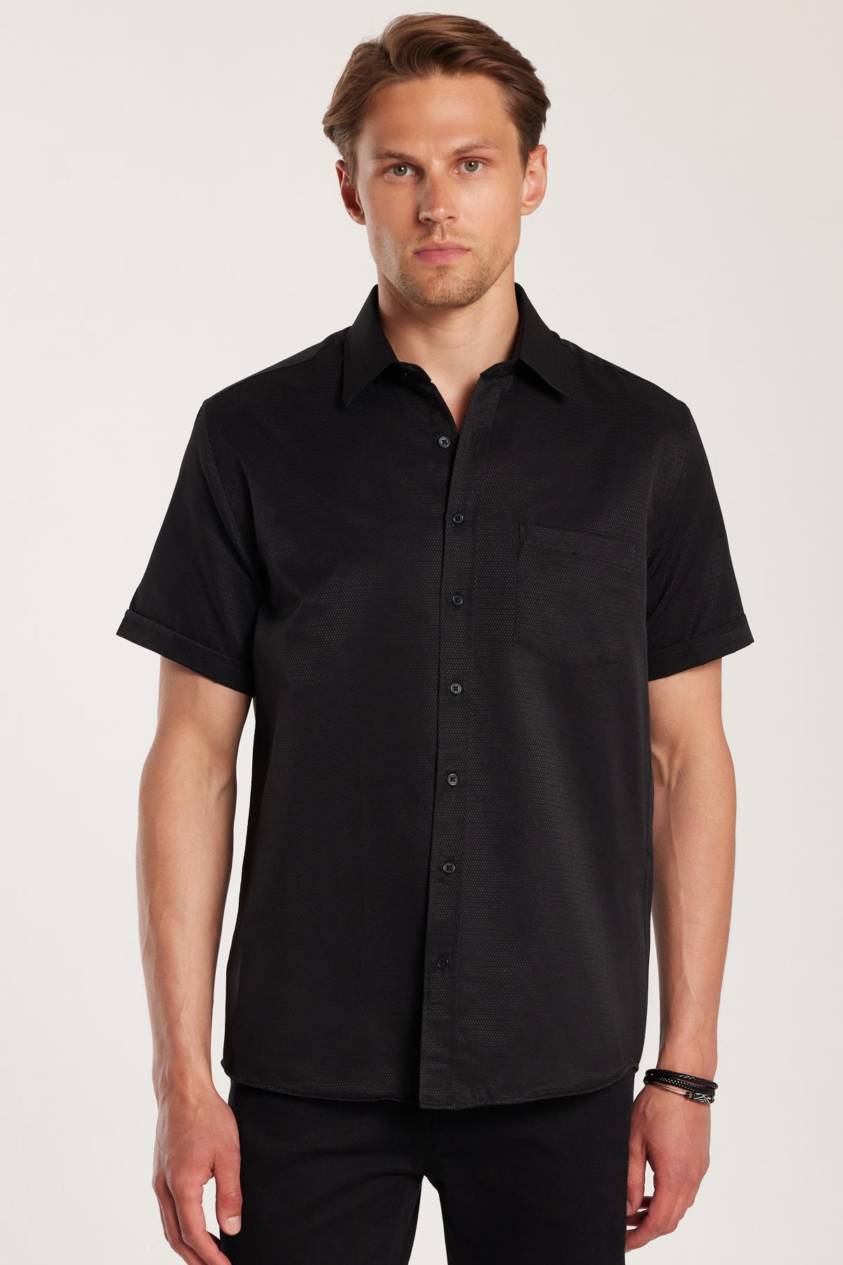 Erkek Regular Fit Klasik Kesim Kısa Kollu Pamuklu Tek Cepli Armürlü Siyah Gömlek (KL250007-2017)