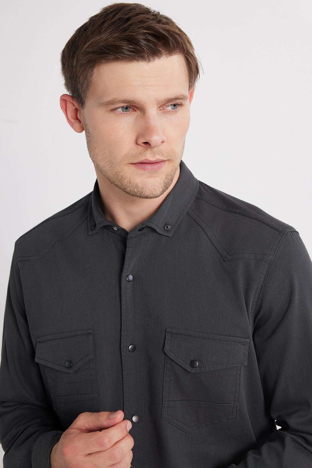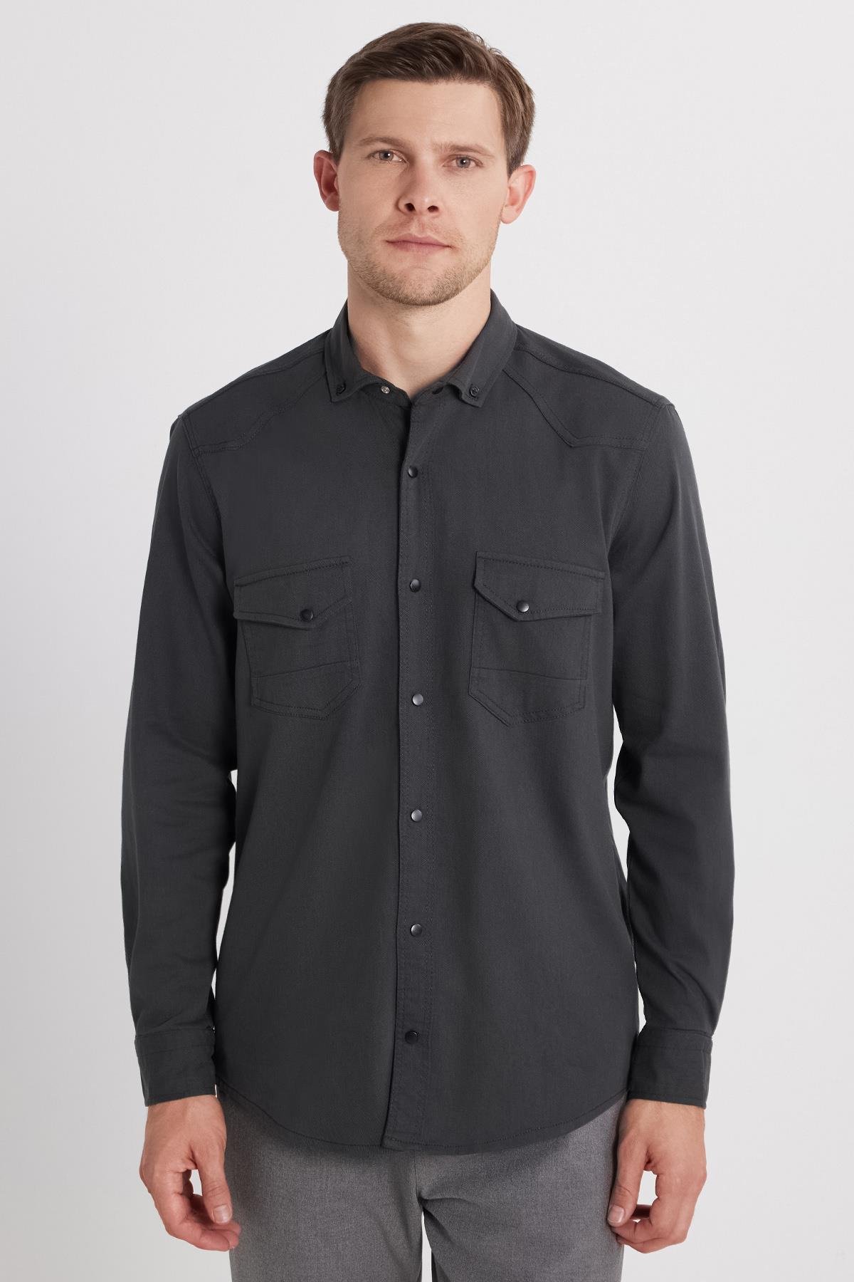 Erkek Regular Fit Rahat Kesim Çift Cepli Spor Yaka Denim Haki Gömlek (RG250012-7776)