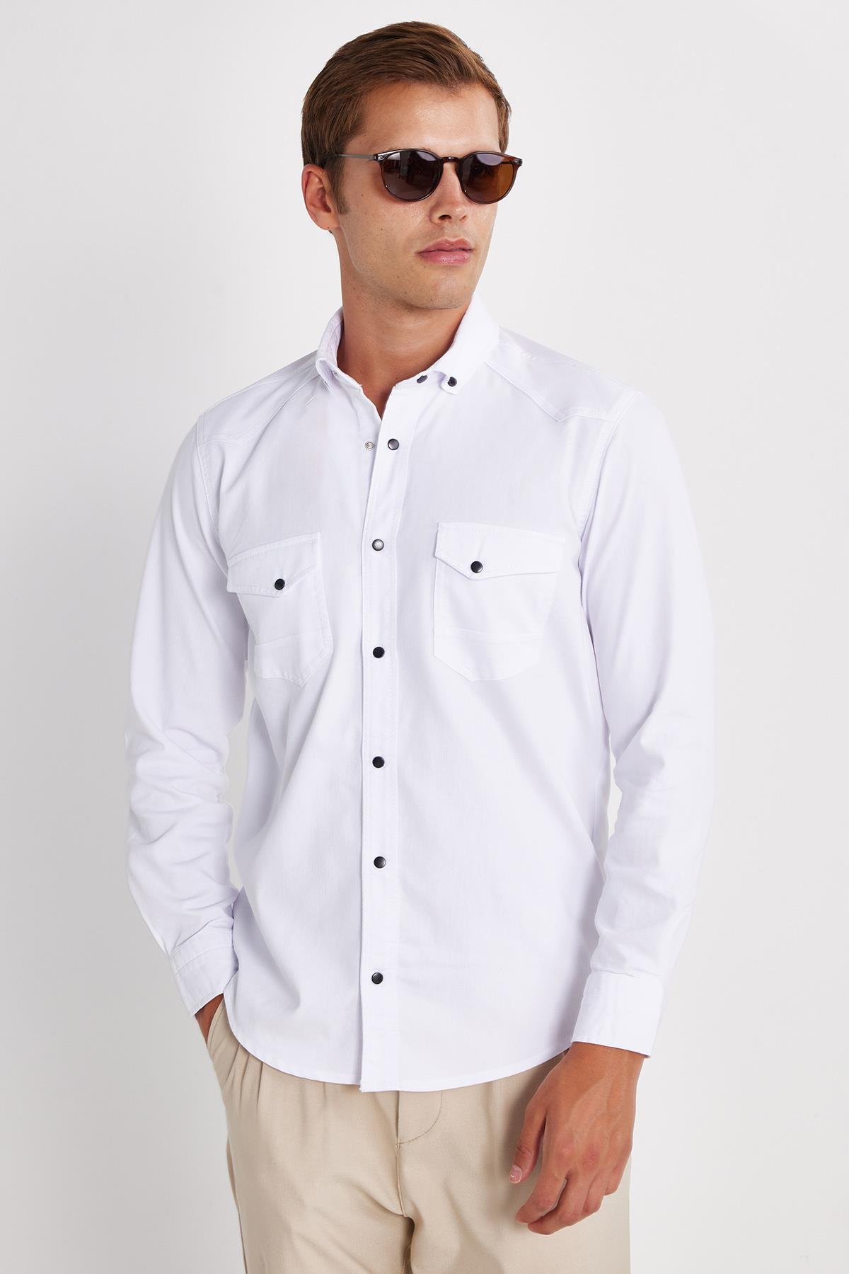 Erkek Regular Fit Rahat Kesim Çift Cepli Spor Yaka Denim Kırık Beyaz Gömlek