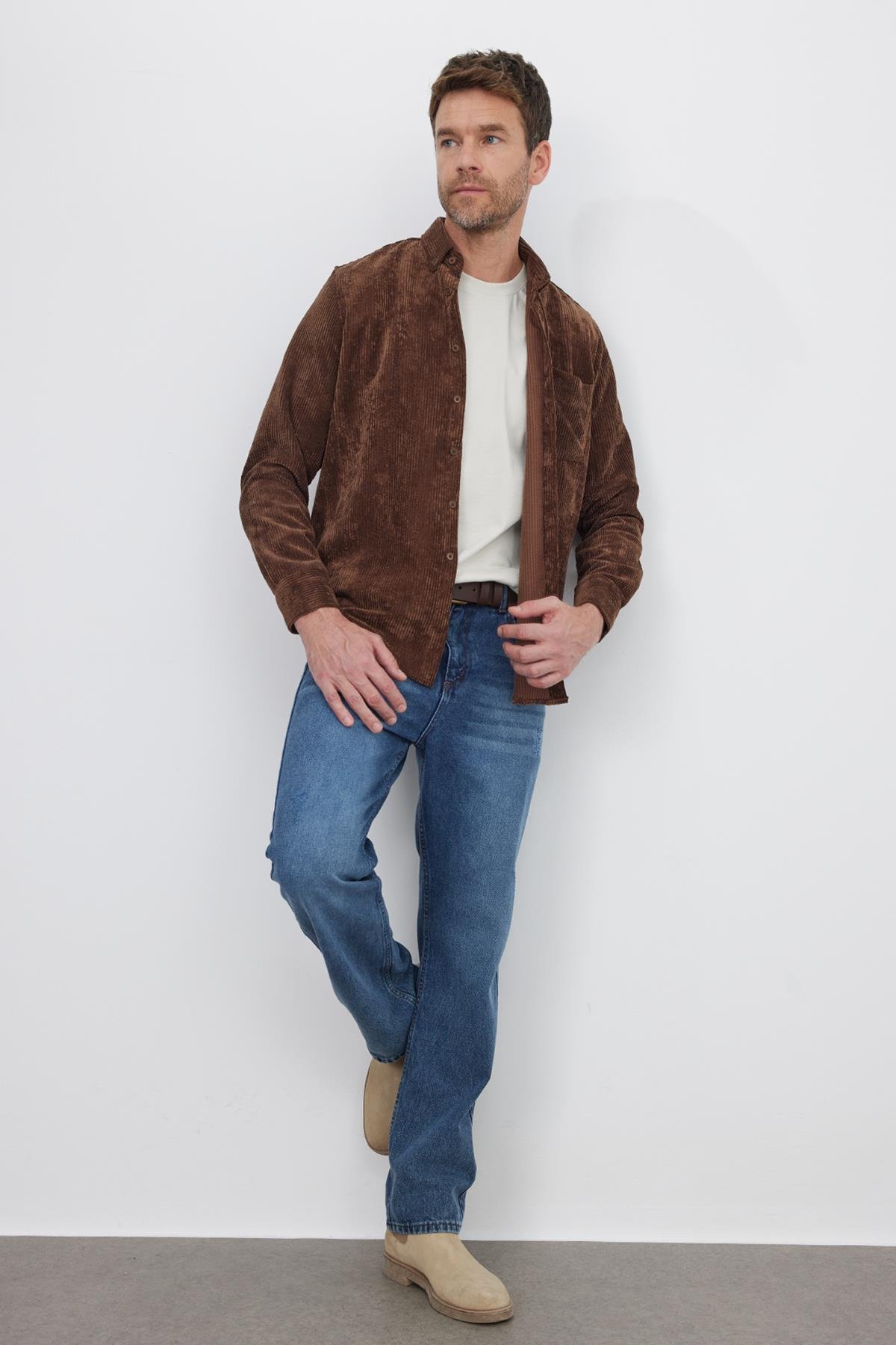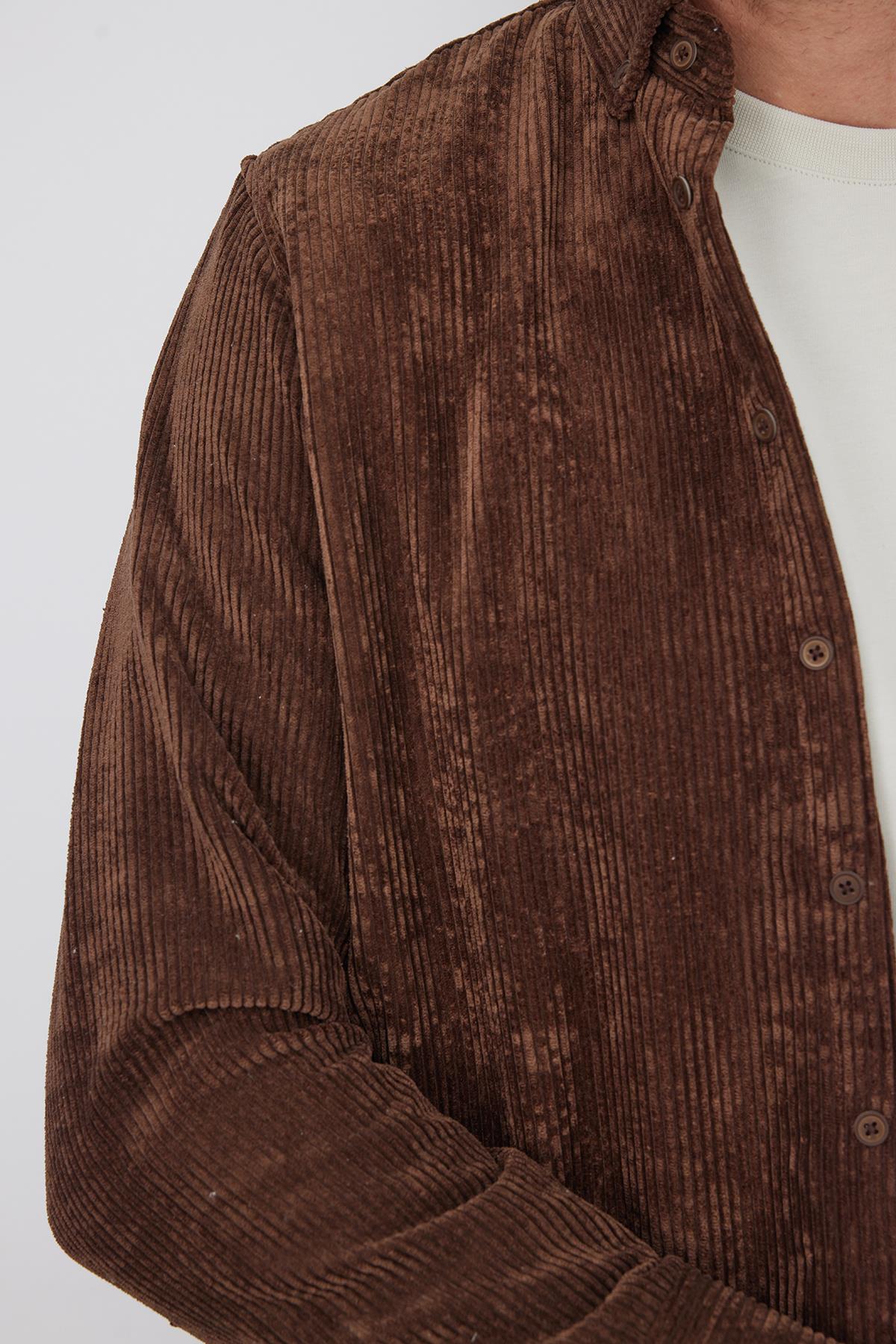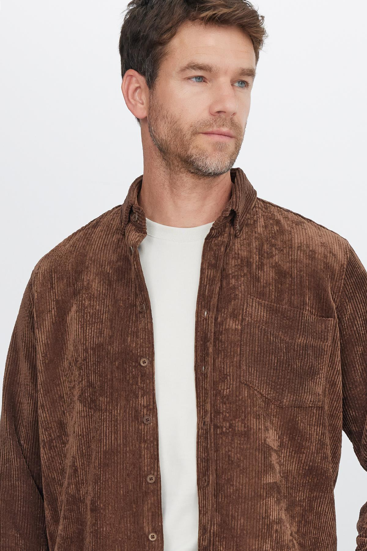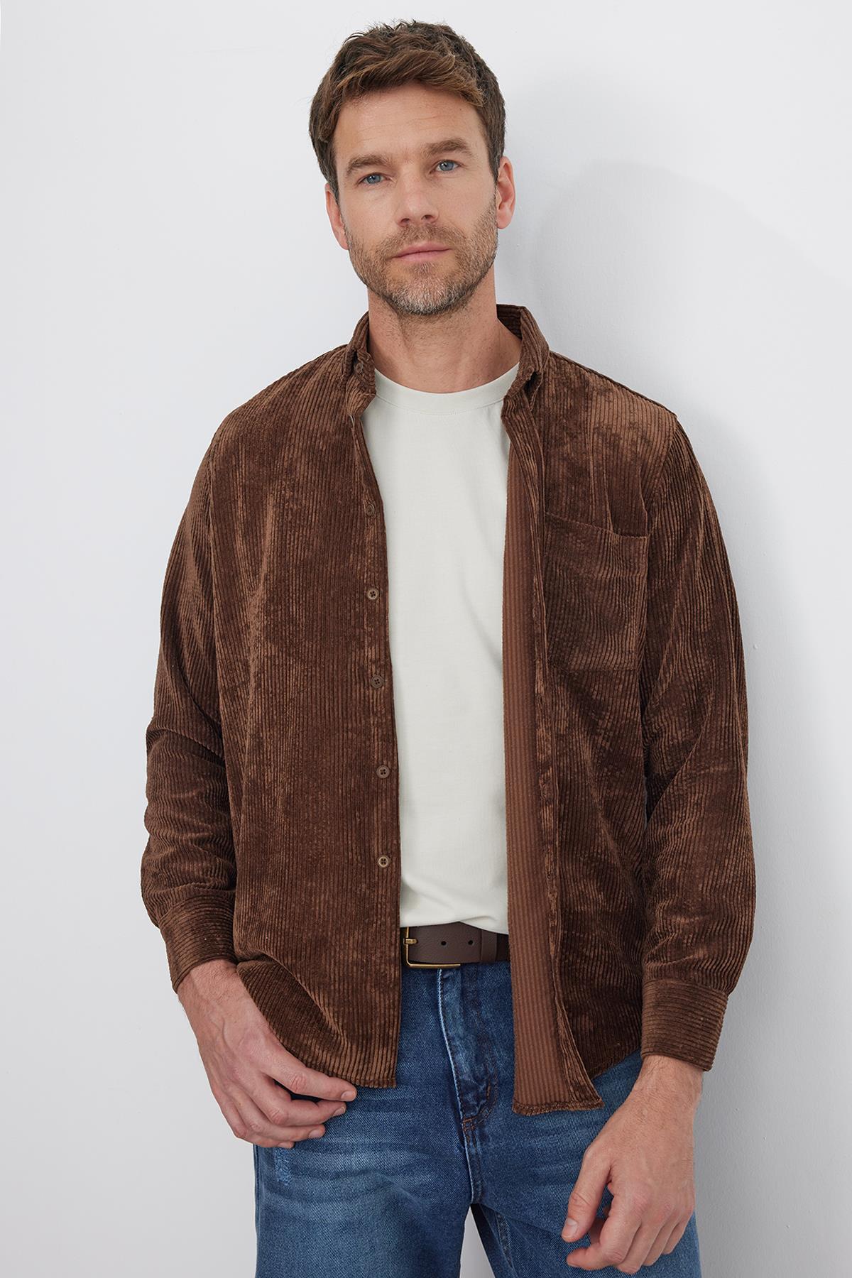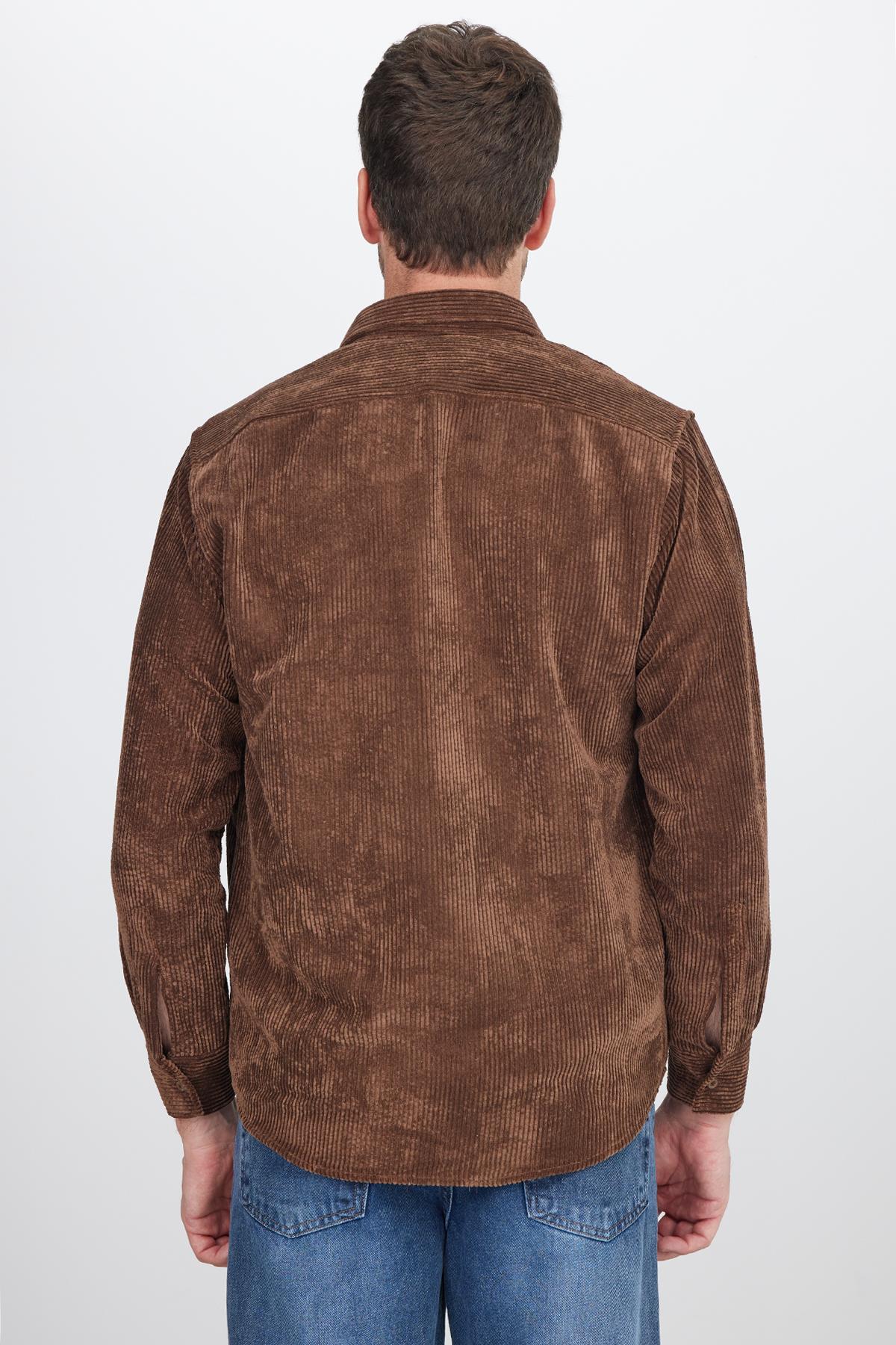 Erkek Regular Fit Rahat Kesim Fitilli Kadife Görünüm Düğmeli Yaka Koyu Kahve Ceket Gömlek