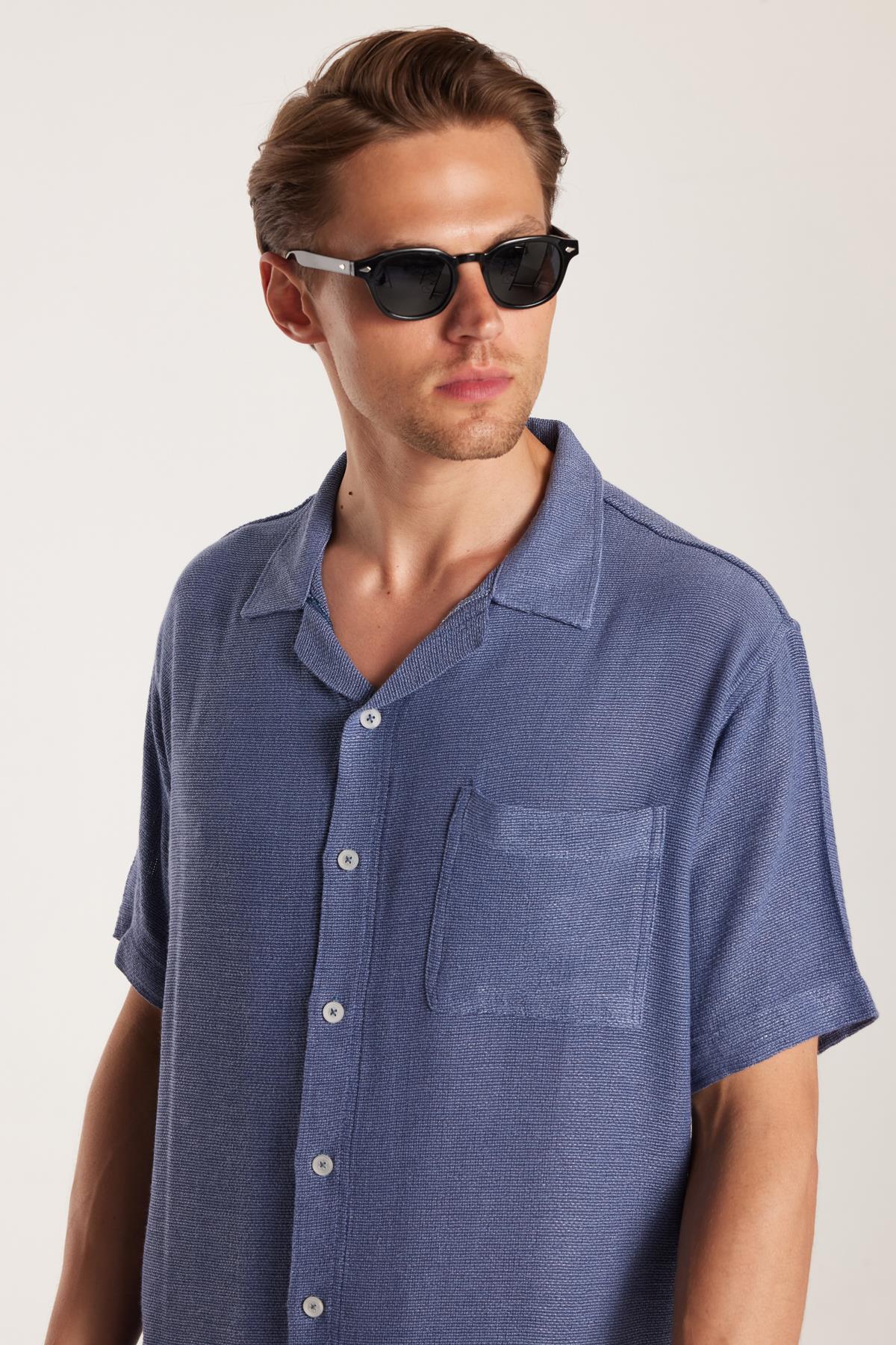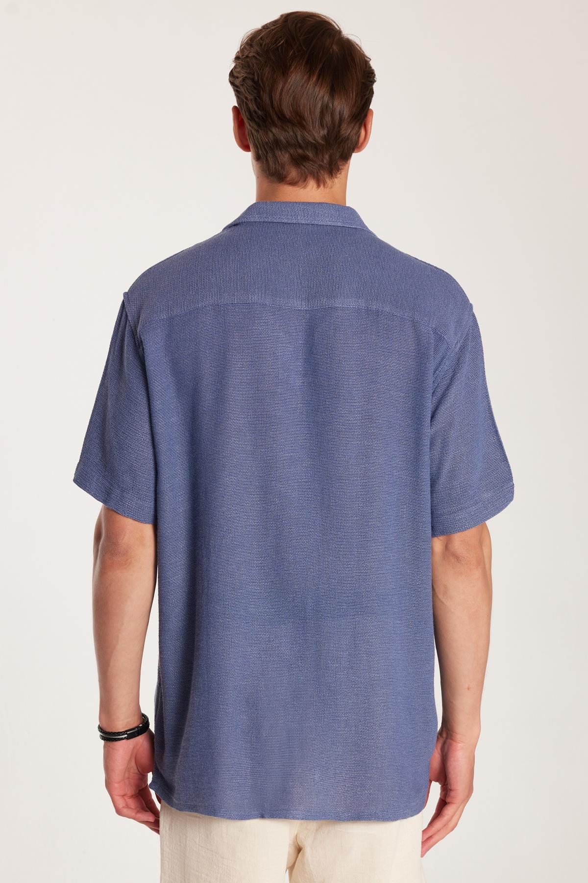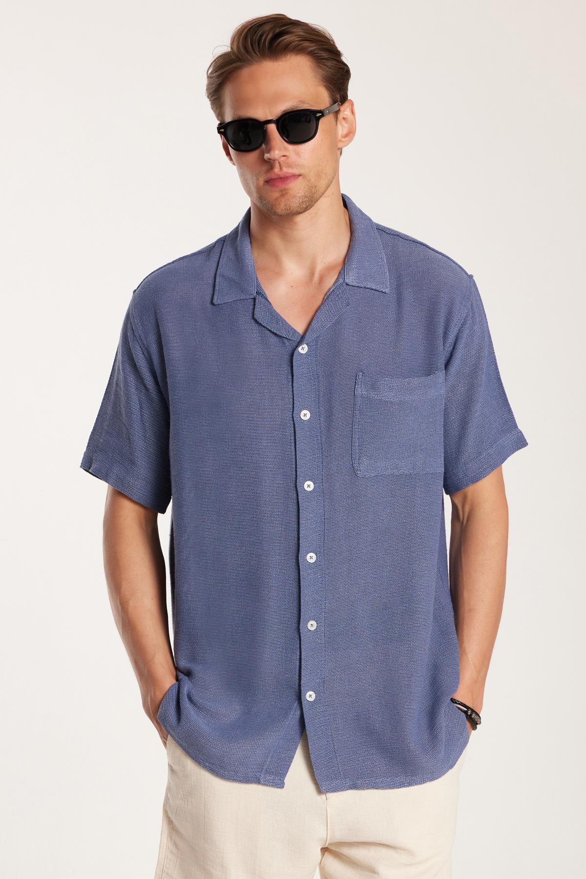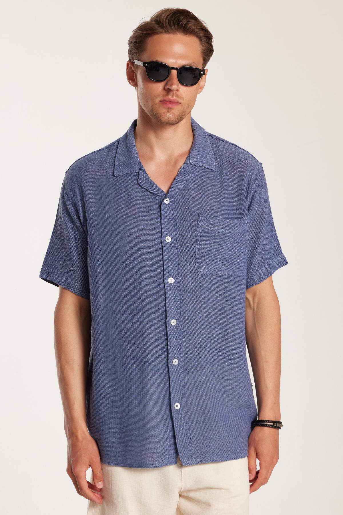 Erkek Relax Fit Apaş Yaka Rustik Kumaş Viskon Pamuk Yandan Açmalı Cepli Rahat Kesim Mavi Gömlek