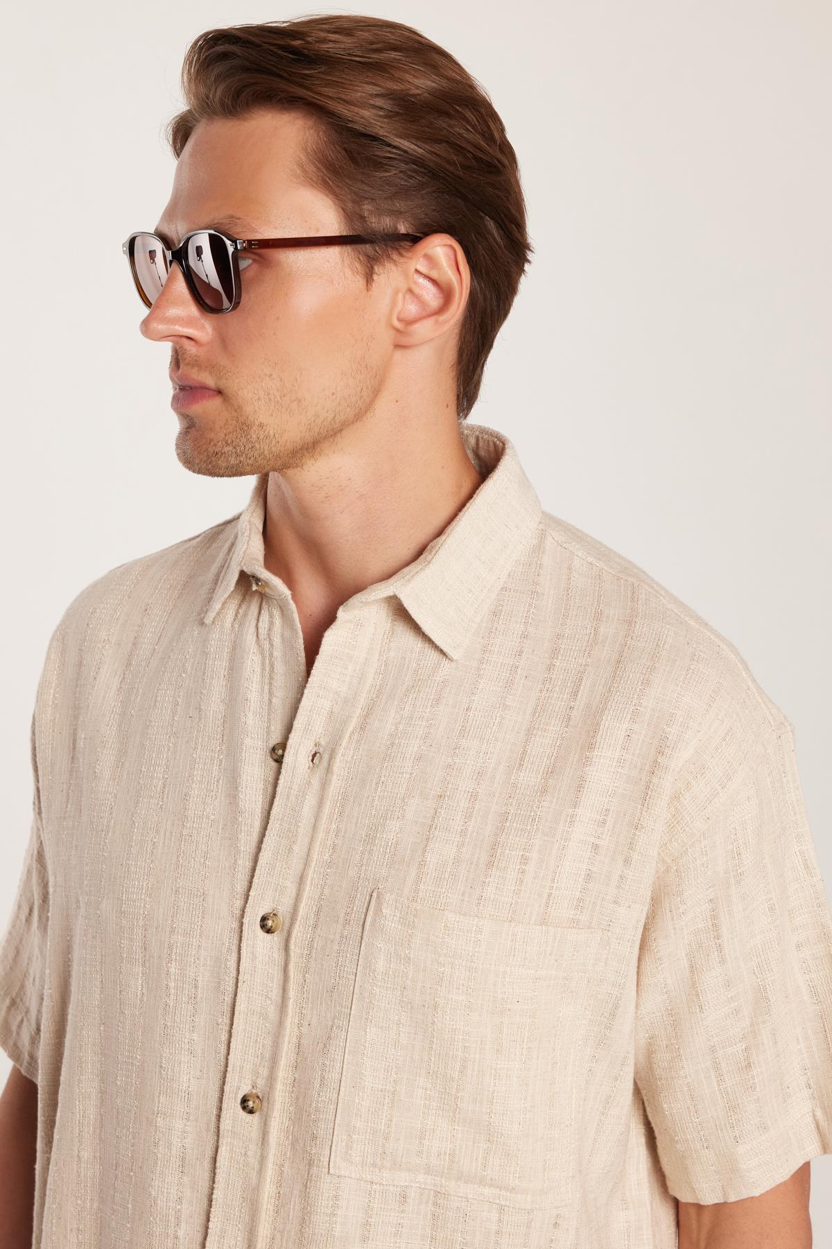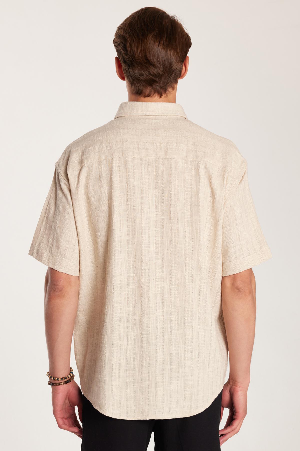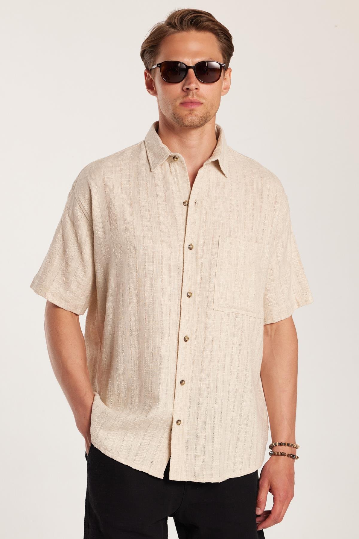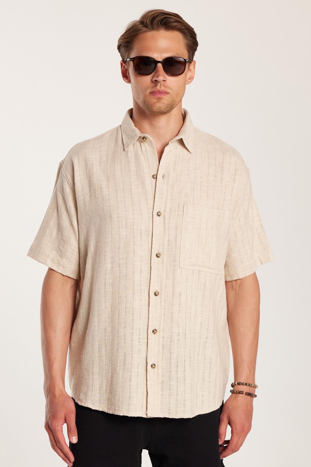 Erkek Relax Fit Premium Seri Pamuklu Keten Kısa Kollu Cepli Spor Yaka Taş Gömlek