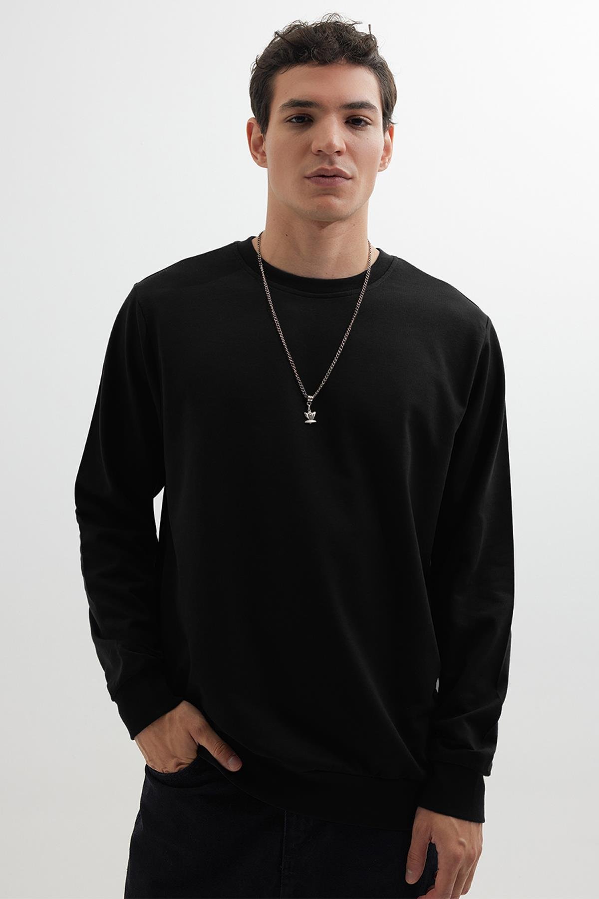 Erkek Relax Fit Rahat Kesim %100 Pamuk 2 İplik Bisiklet Yaka Siyah Sweatshirt