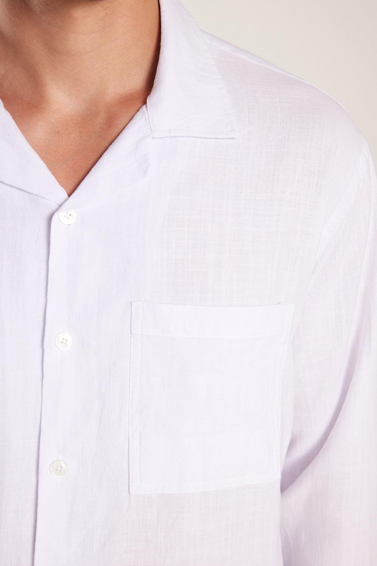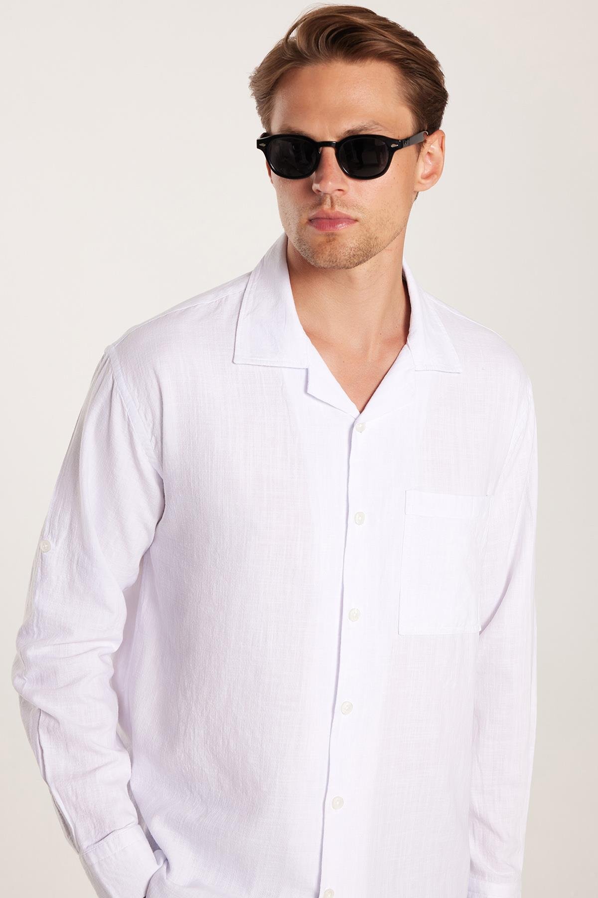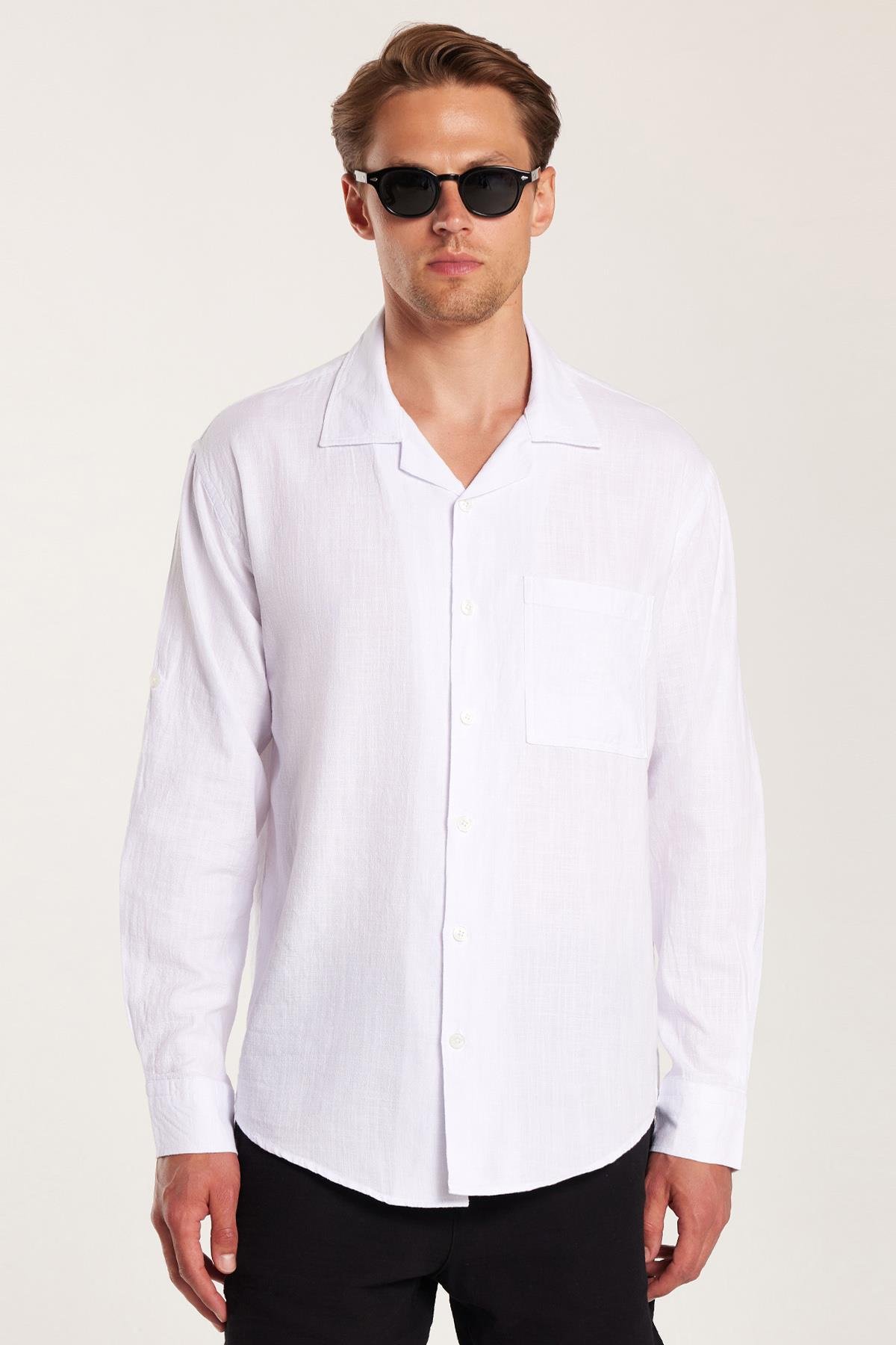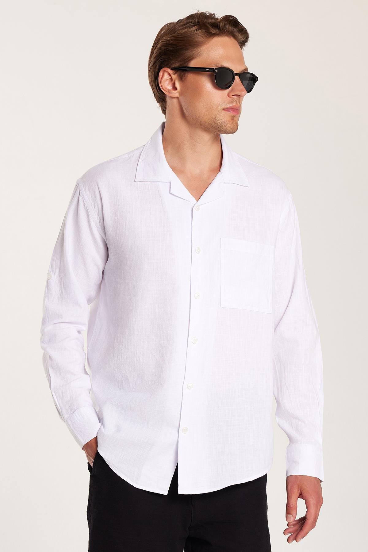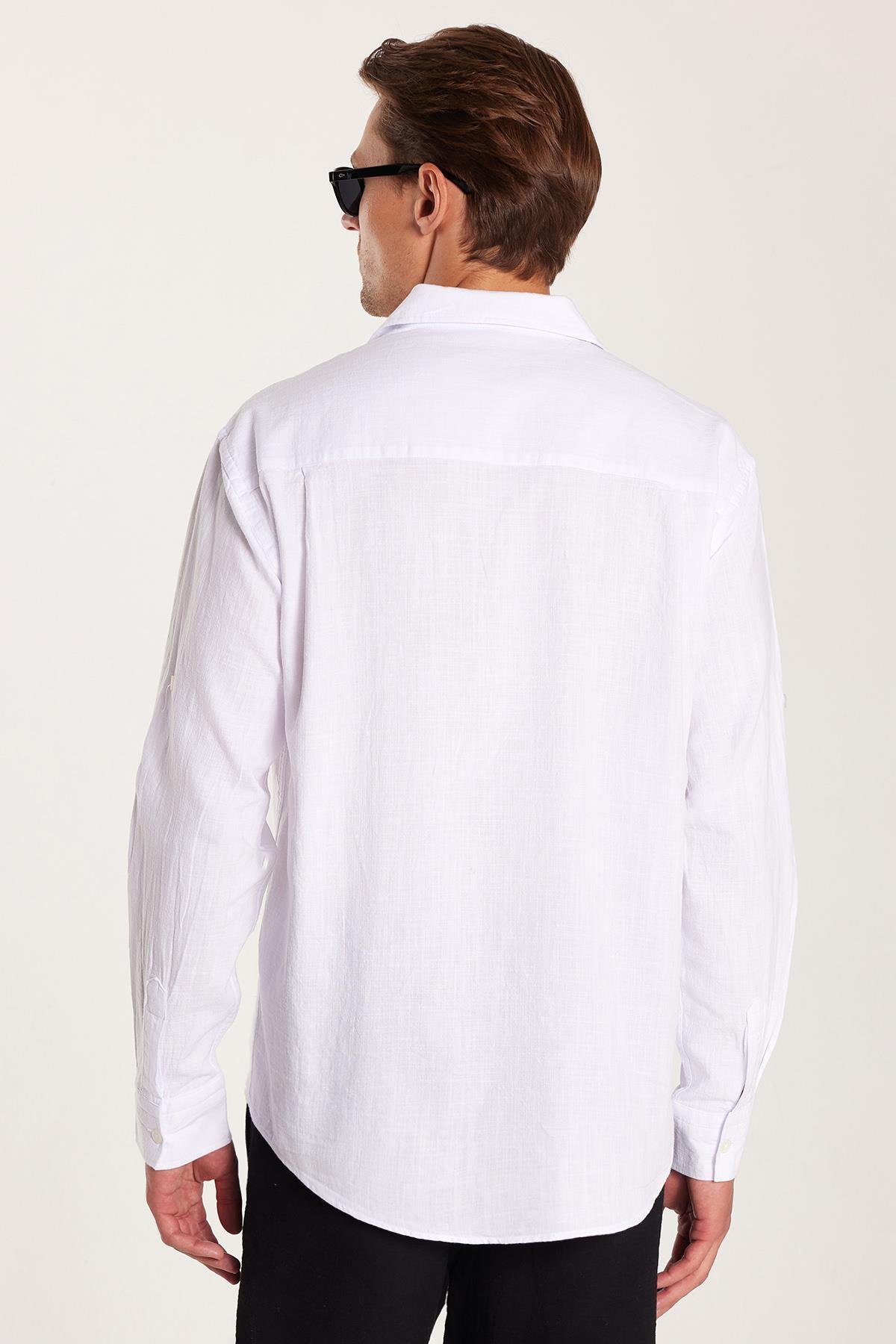 Erkek Relax Fit Rahat Kesim %100 Pamuk Keten Doku Apaş Yaka Beyaz Gömlek