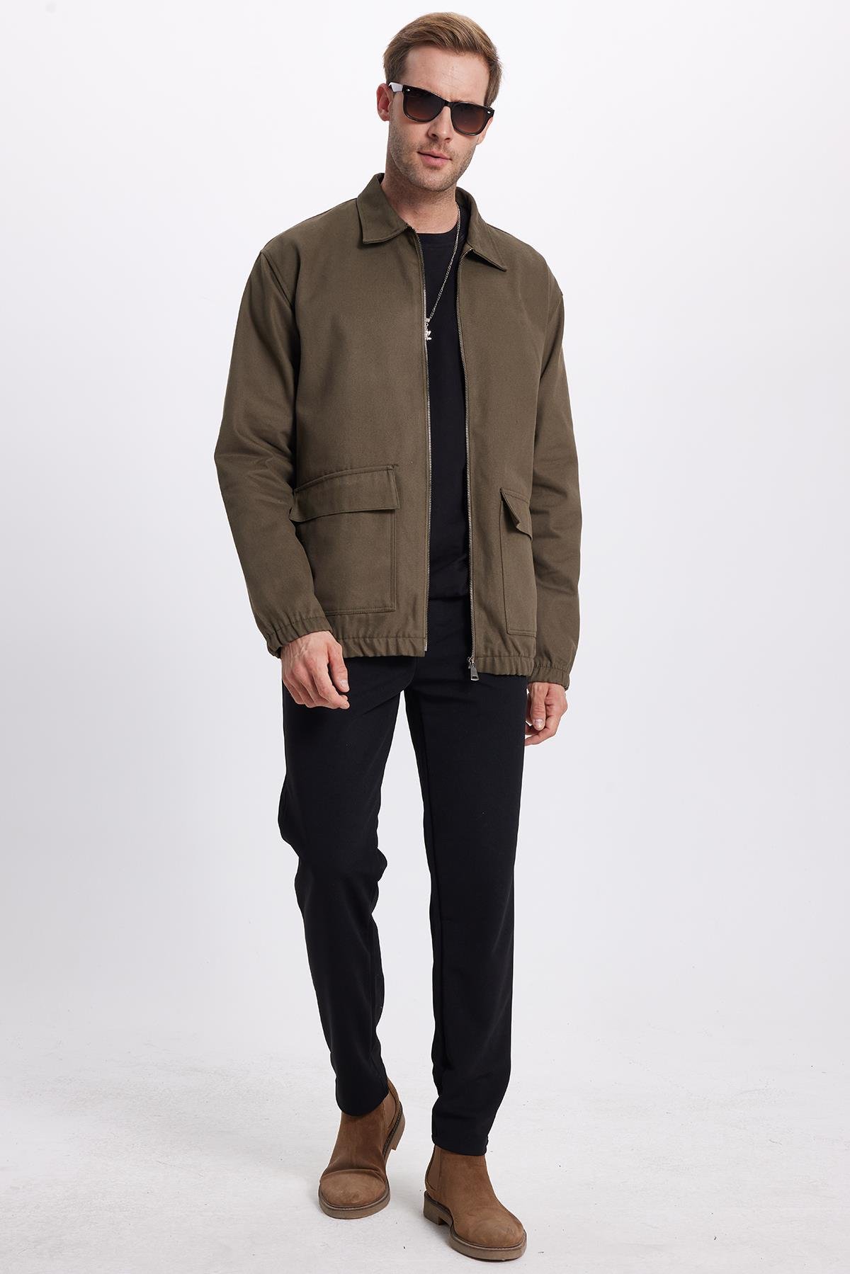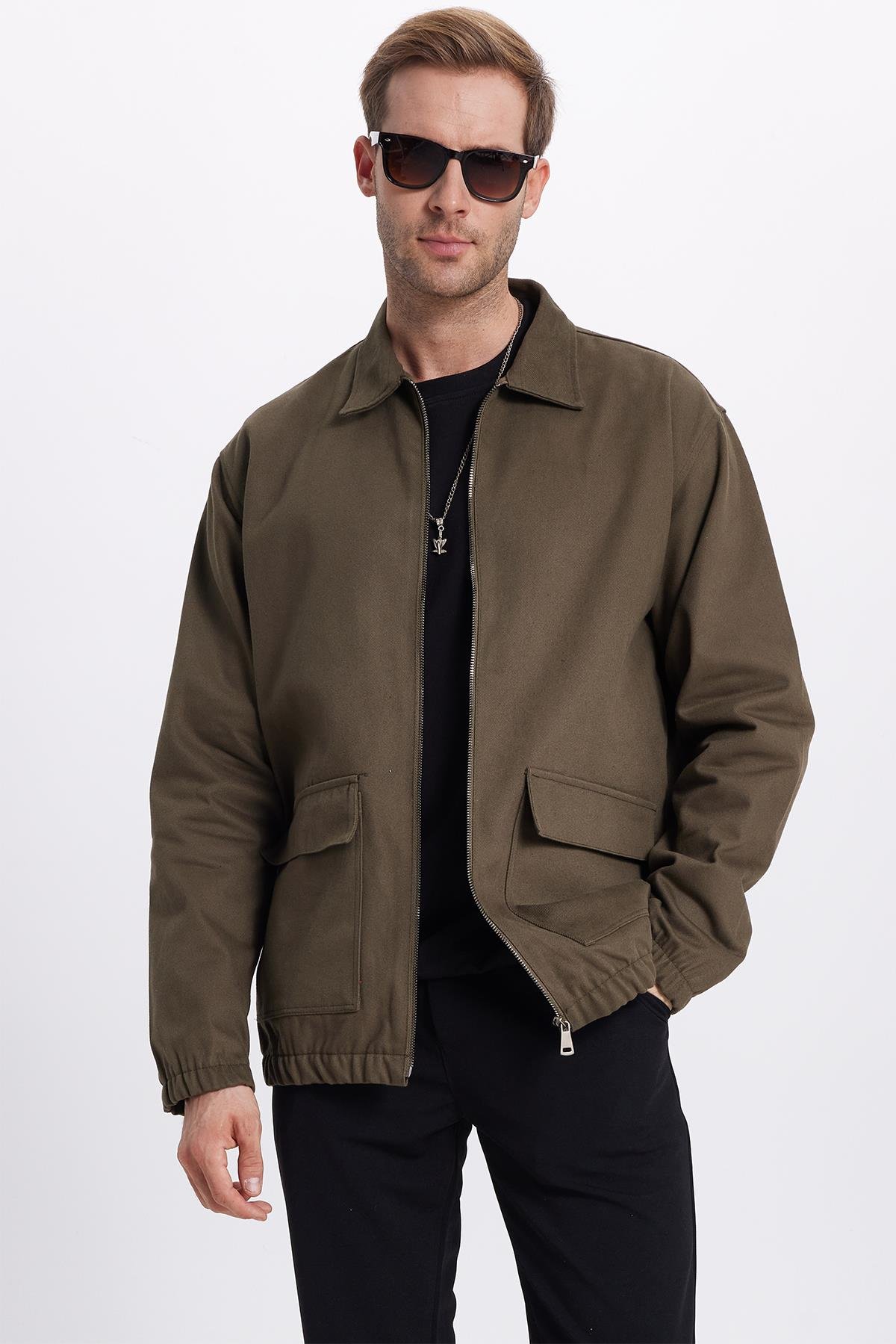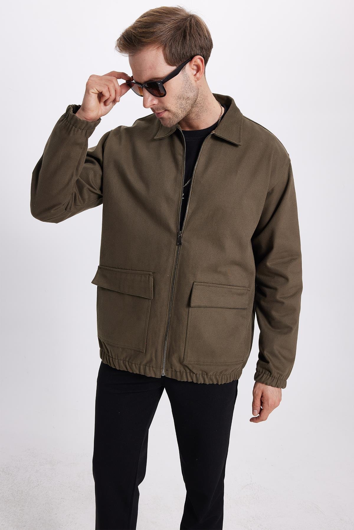 Erkek Relax Fit Rahat Kesim Çift Cep Kapaklı Fermuarlı Beli Lastikli Düz Haki Ceket Mont Gömlek
