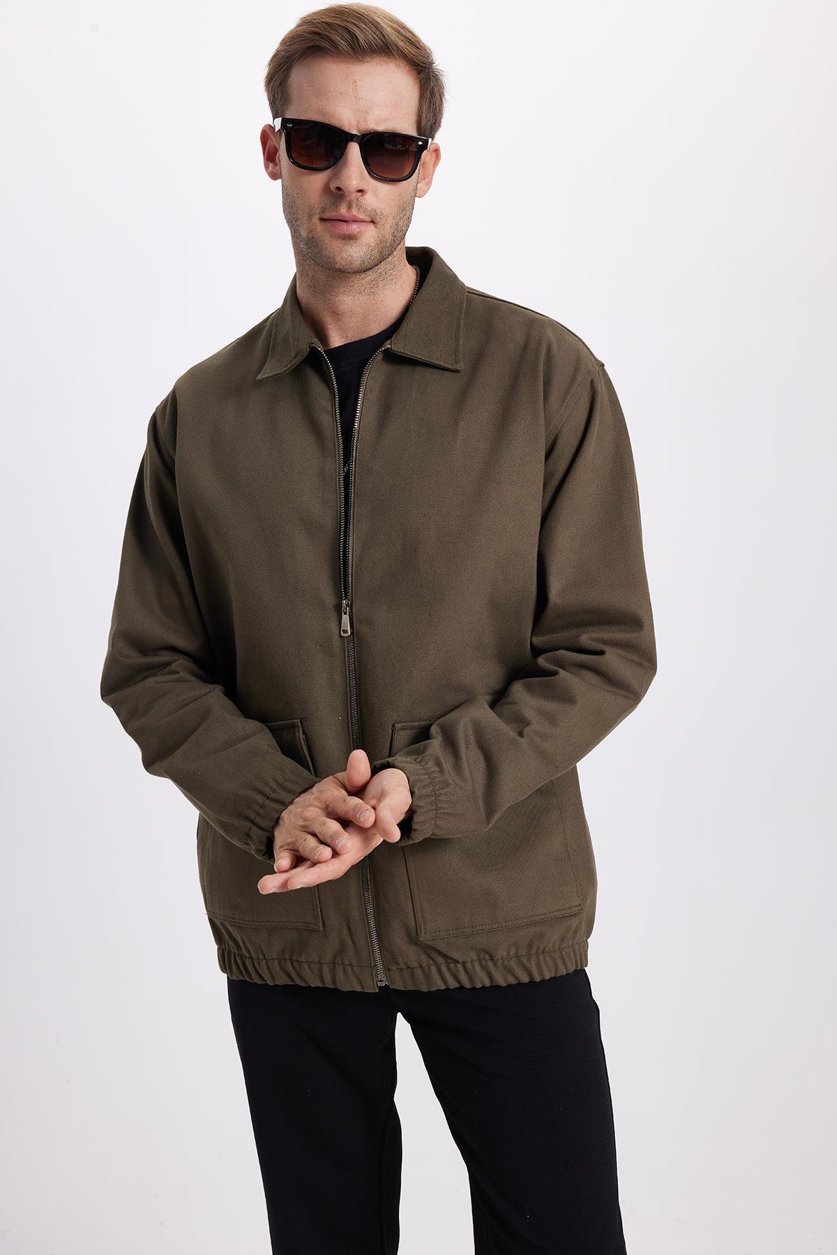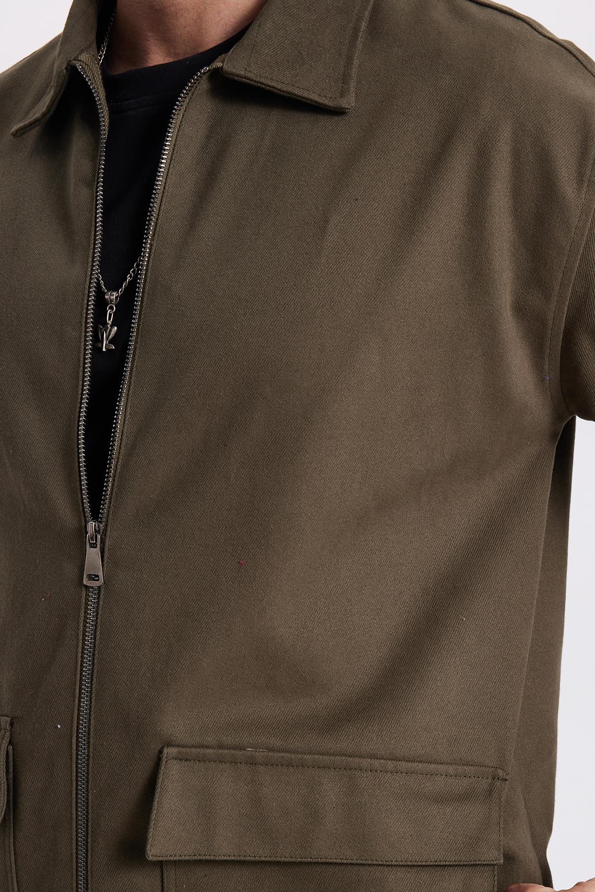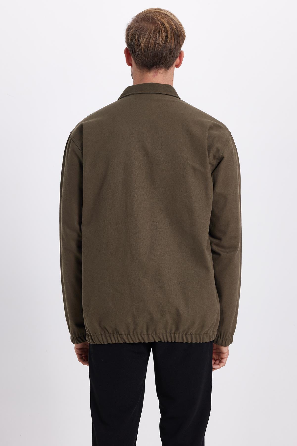 Erkek Relax Fit Rahat Kesim Çift Cep Kapaklı Fermuarlı Beli Lastikli Düz Haki Ceket Mont Gömlek