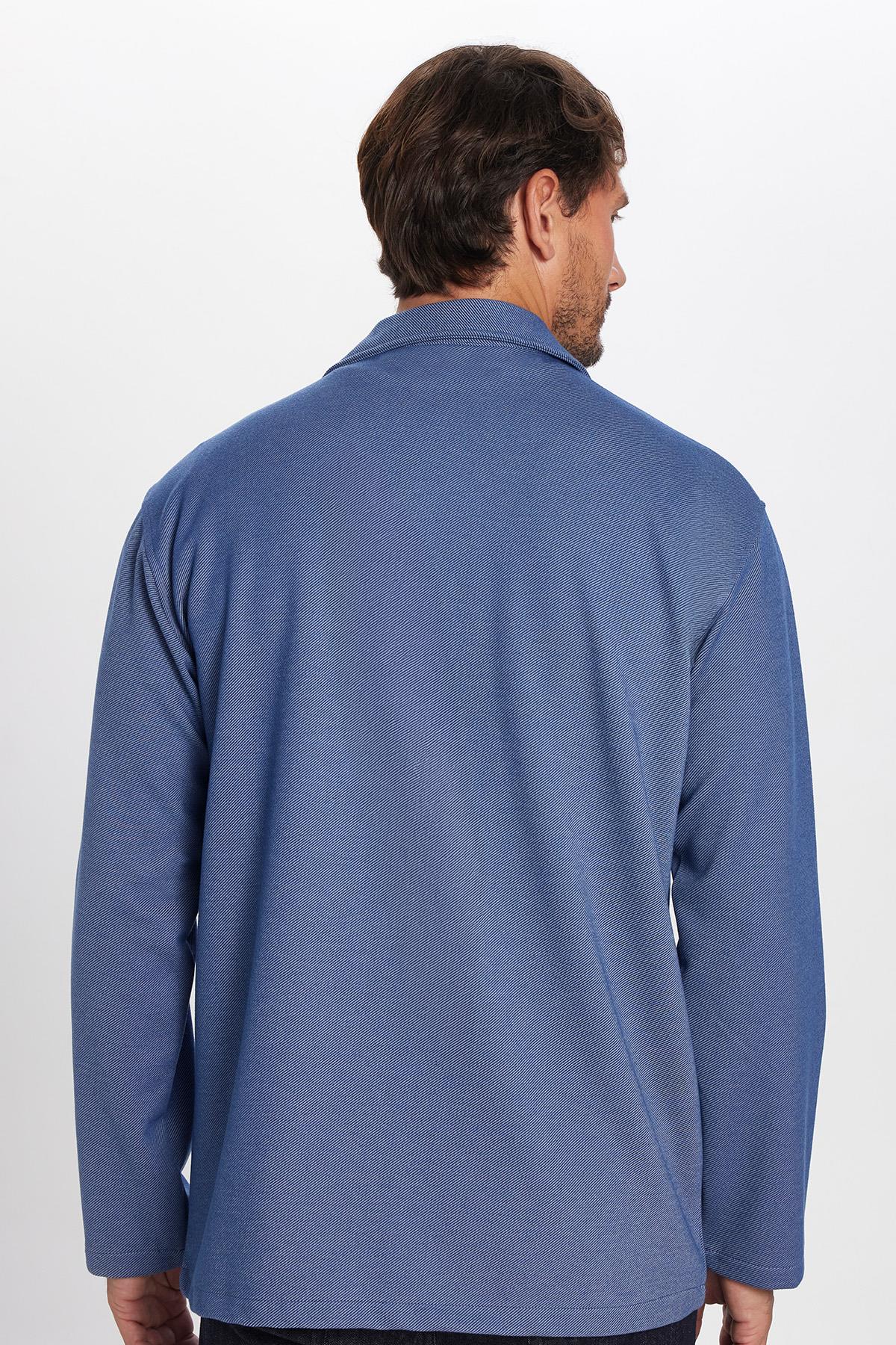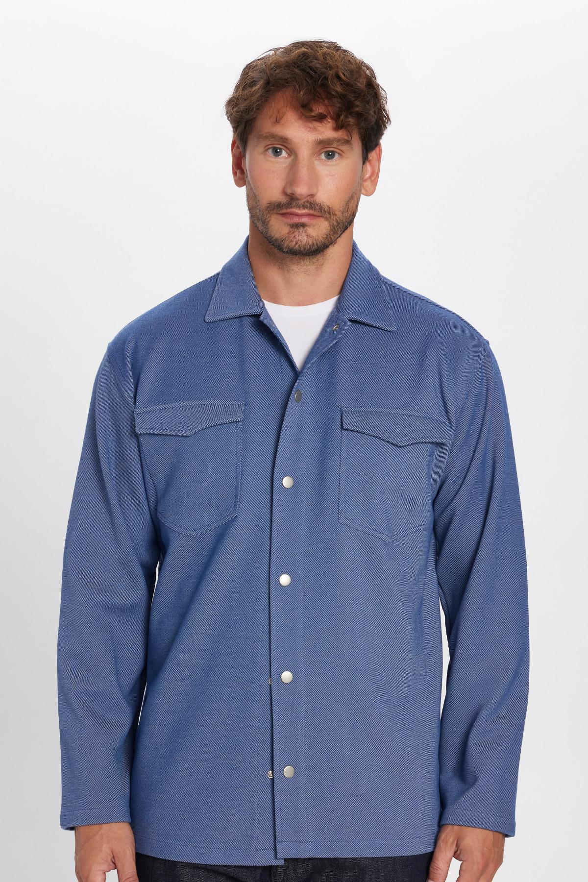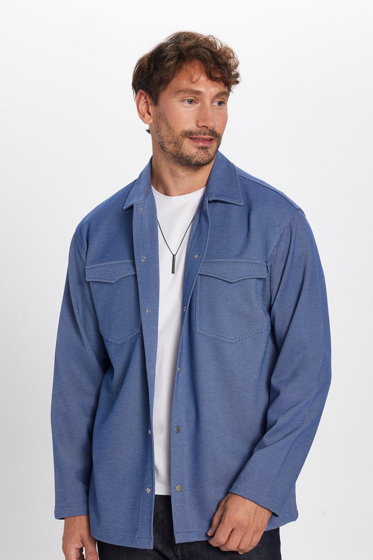Erkek Relax Fit Rahat Kesim Çift Cepli Örme İndigo Apaş Yaka Gömlek