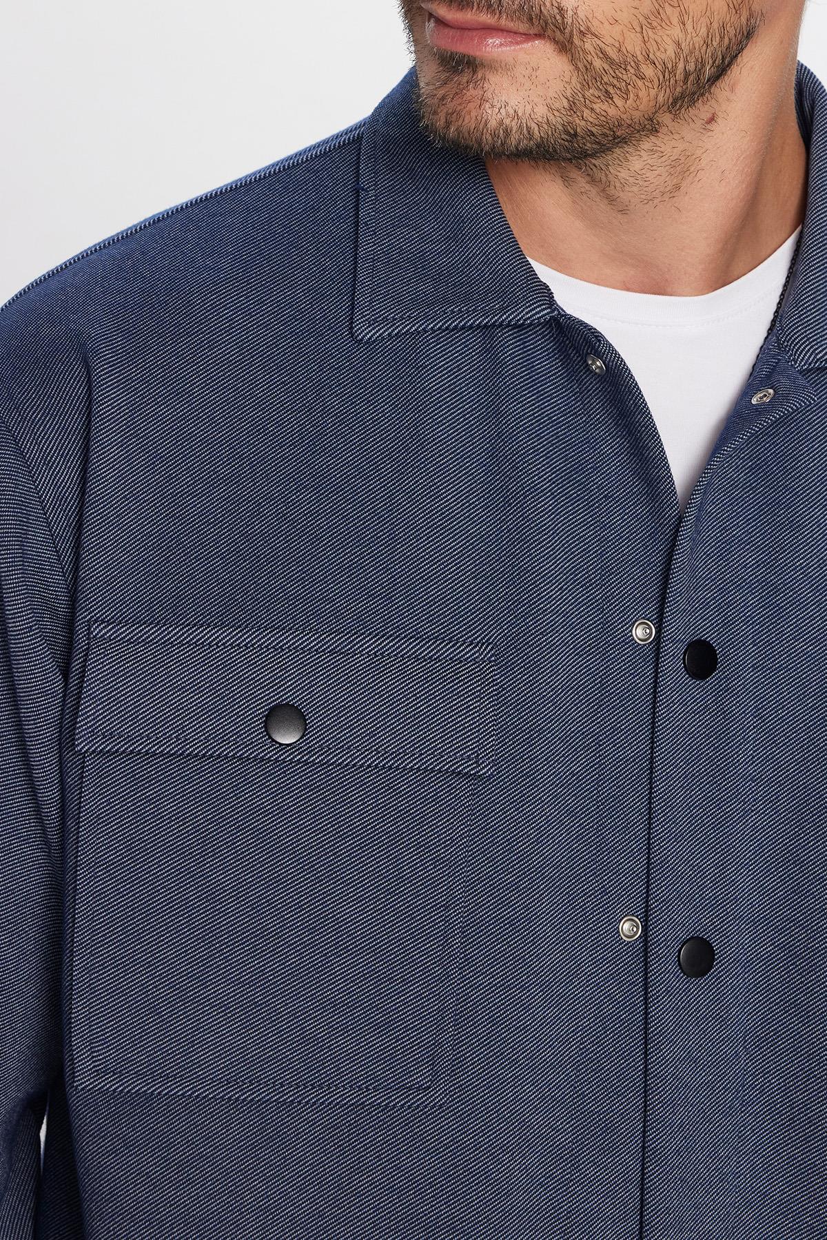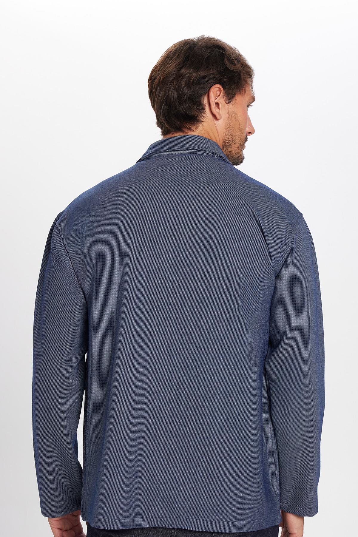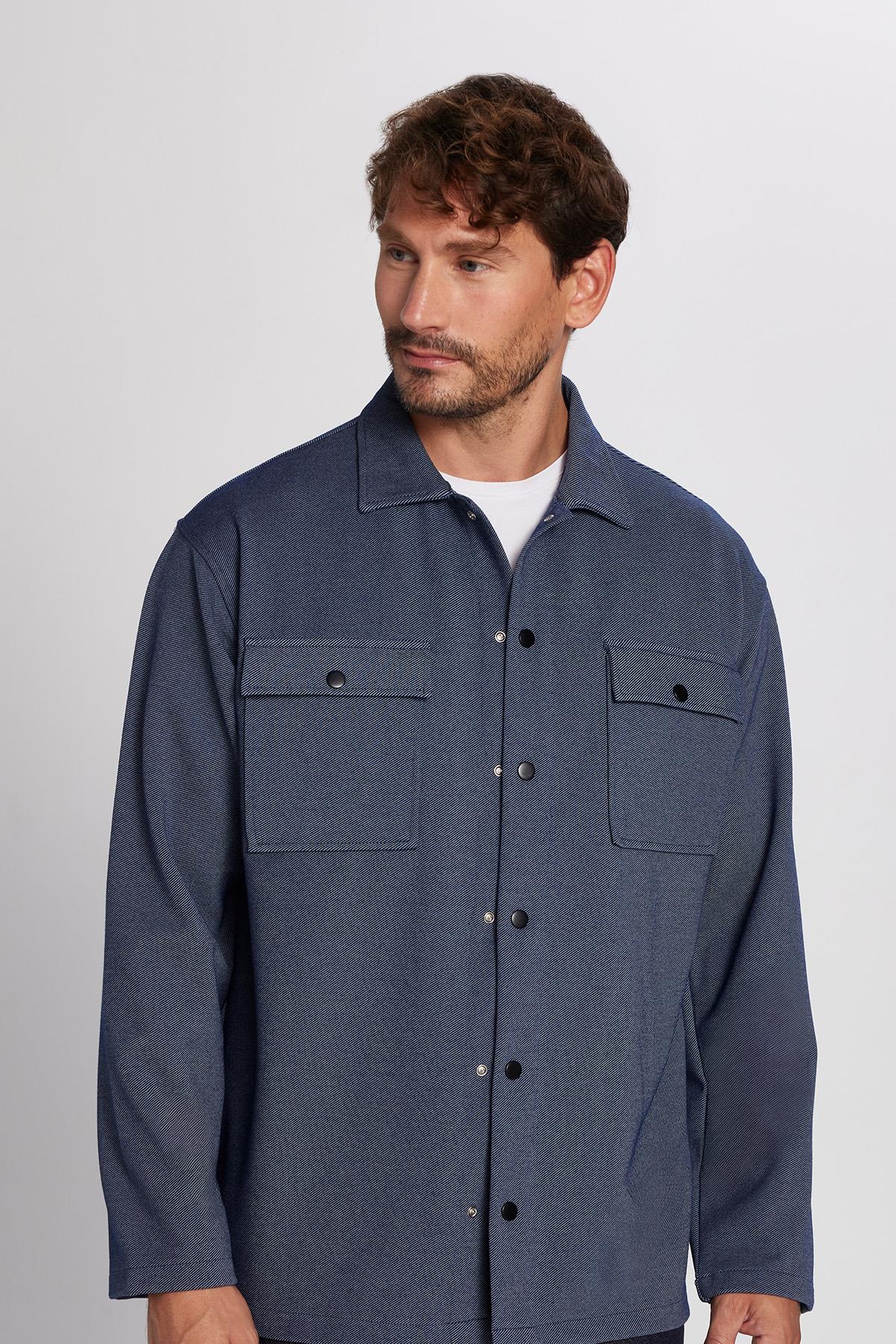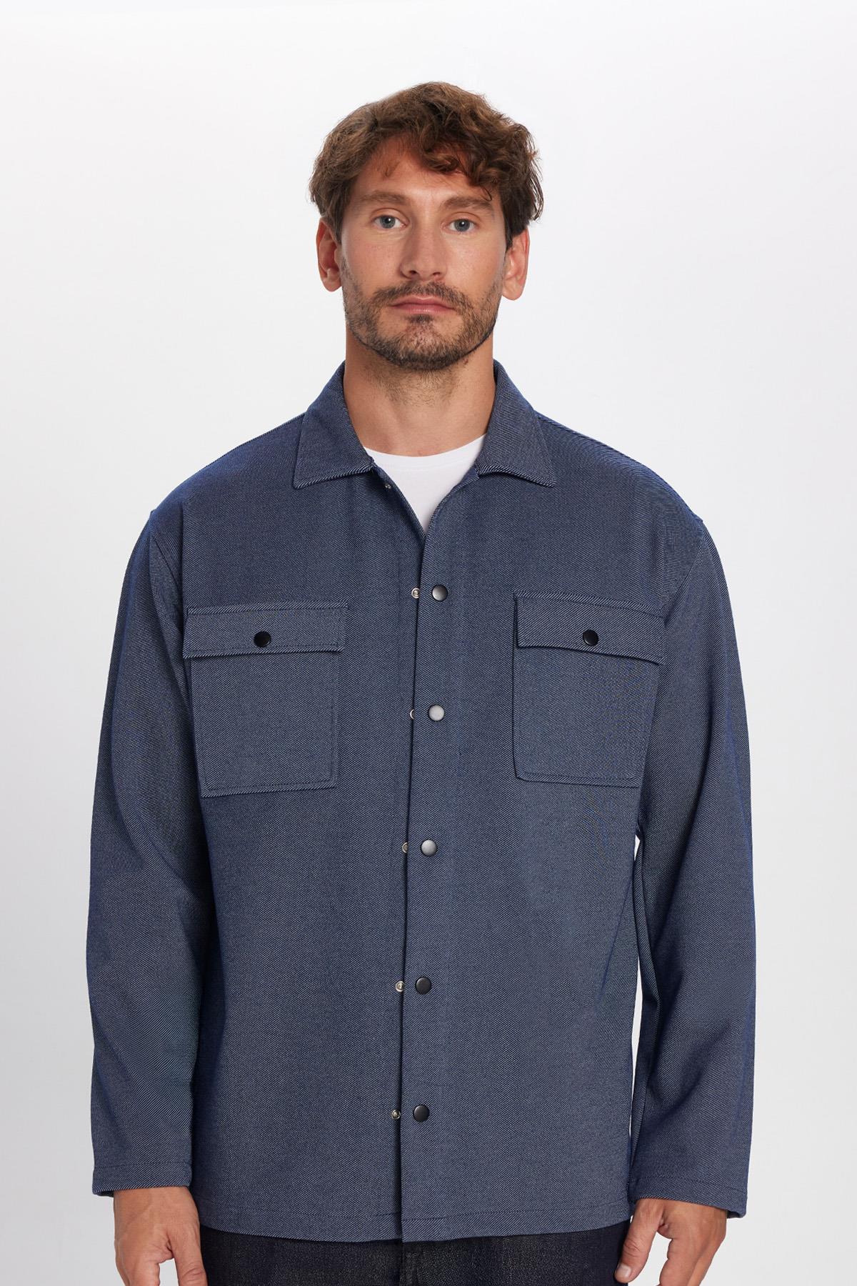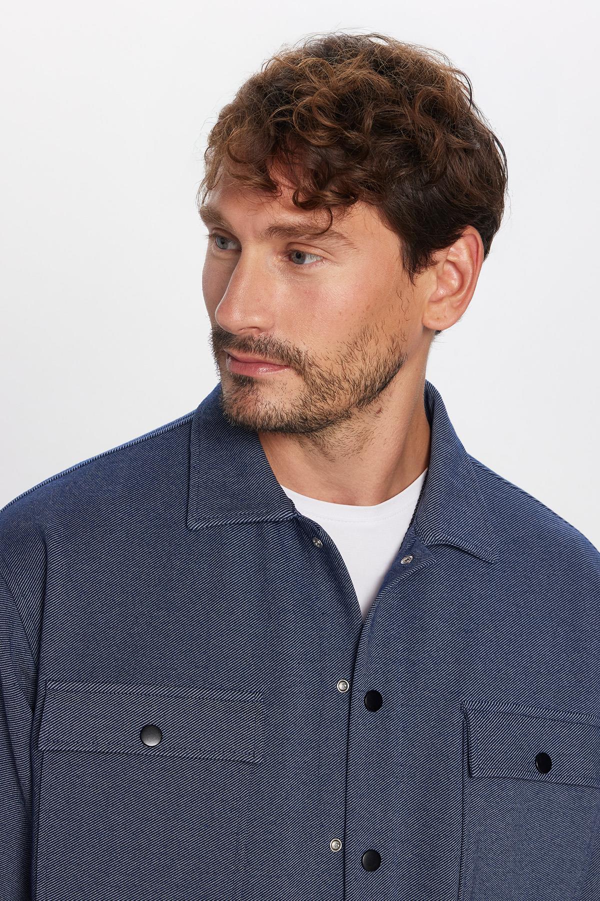 Erkek Relax Fit Rahat Kesim Çift Cepli Örme Lacivert Apaş Yaka Gömlek