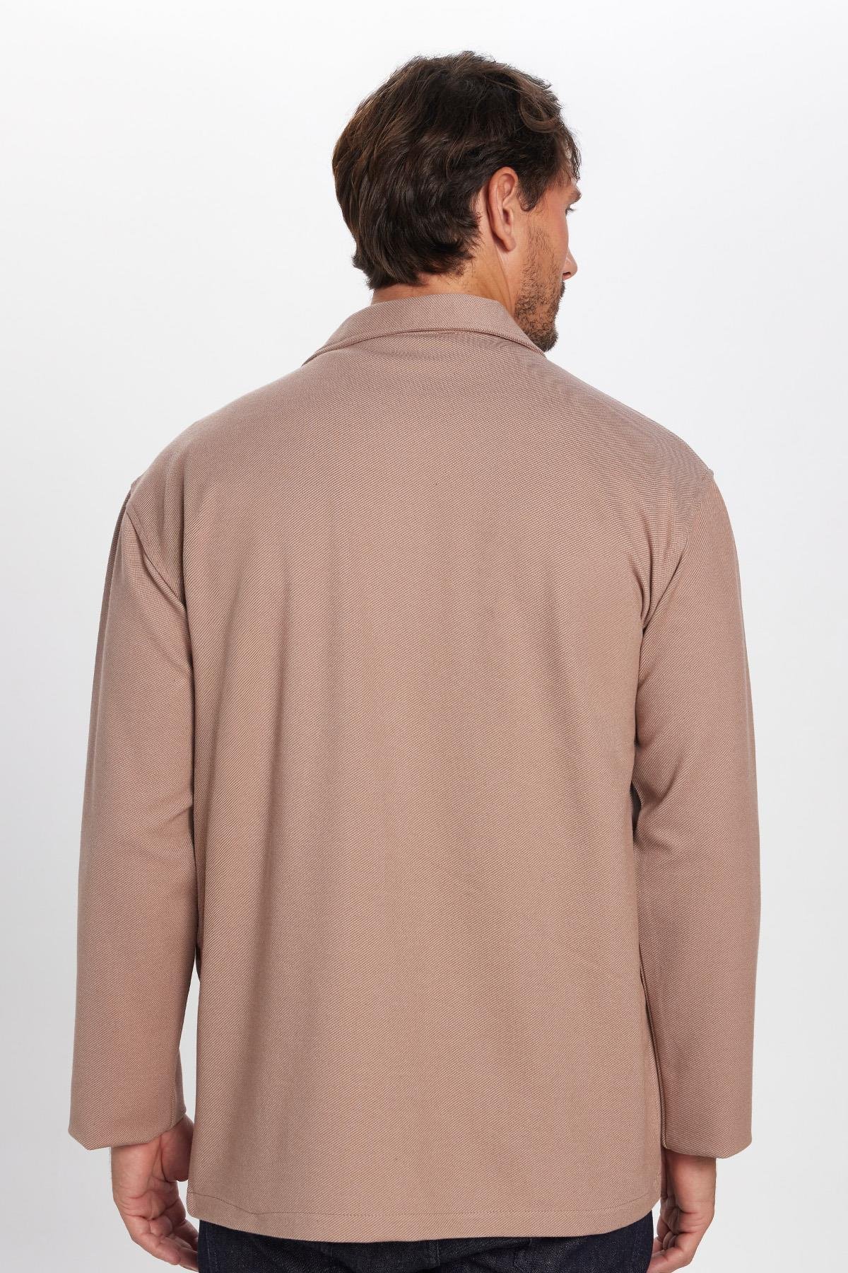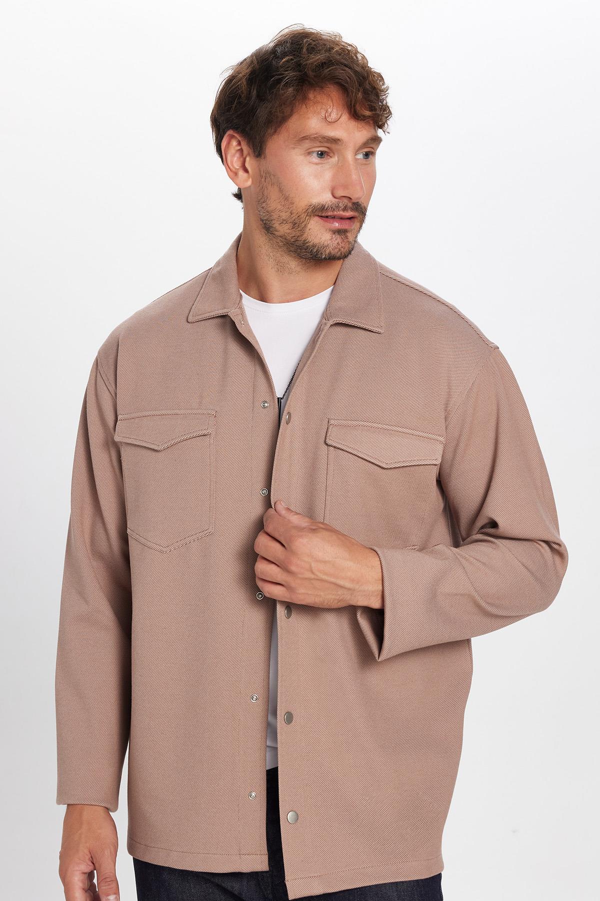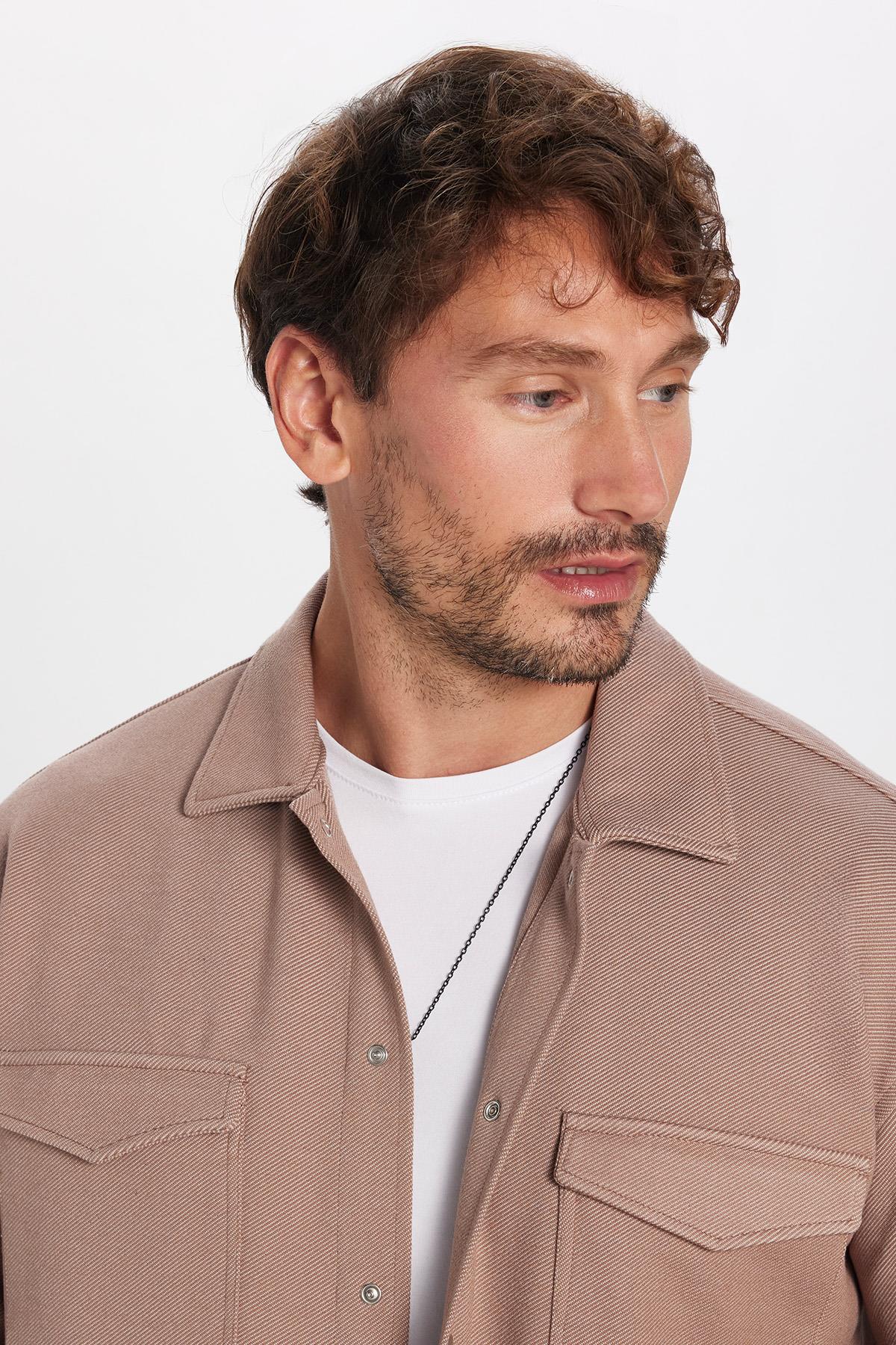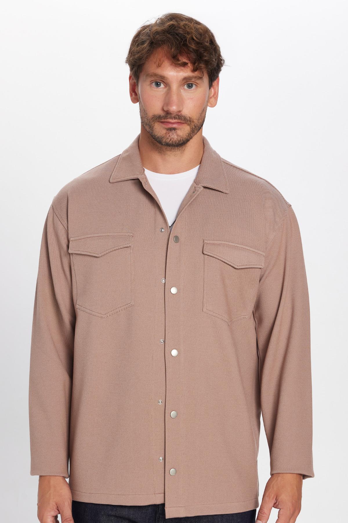 Erkek Relax Fit Rahat Kesim Çift Cepli Örme Vizon Apaş Yaka Gömlek
