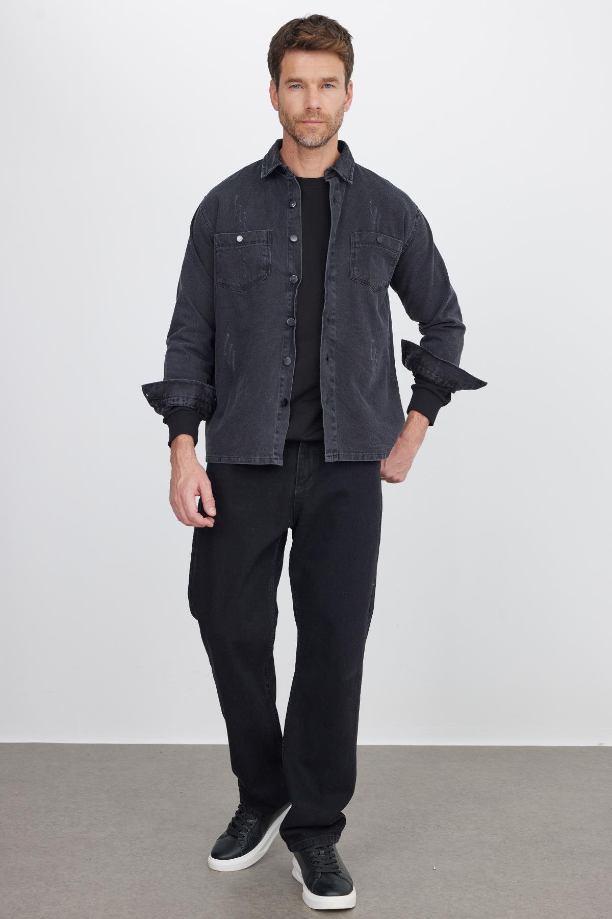 Relax Fit Çift Cep Eskitmeli Siyah Denim Kot Erkek Gömlek