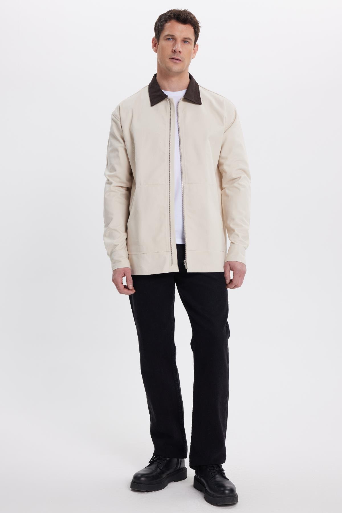 Erkek Relax Fit Rahat Kesim Gabardin Düz Fermuarlı Kanguru Cepli Kontrast Yaka Bej Gömlek Ceket