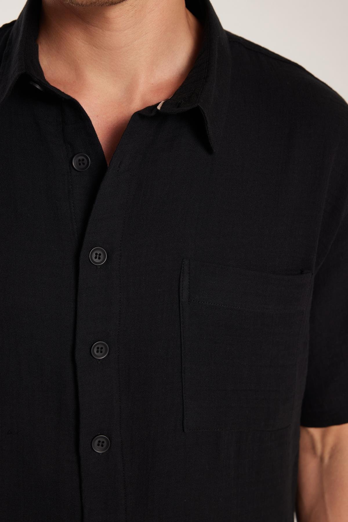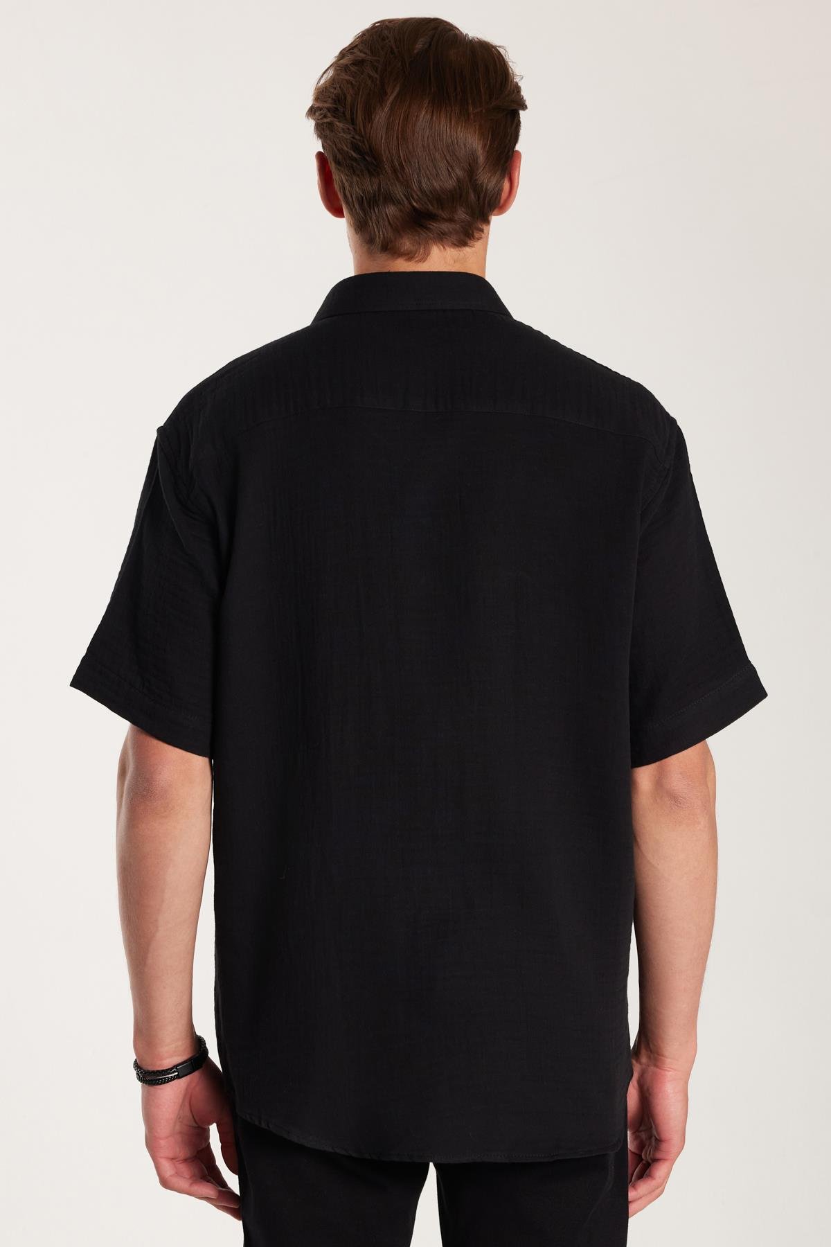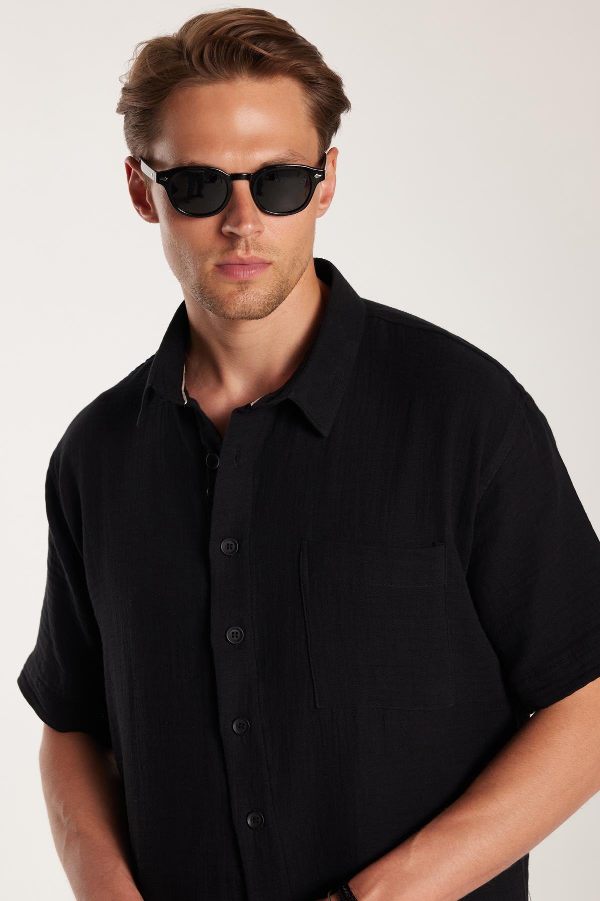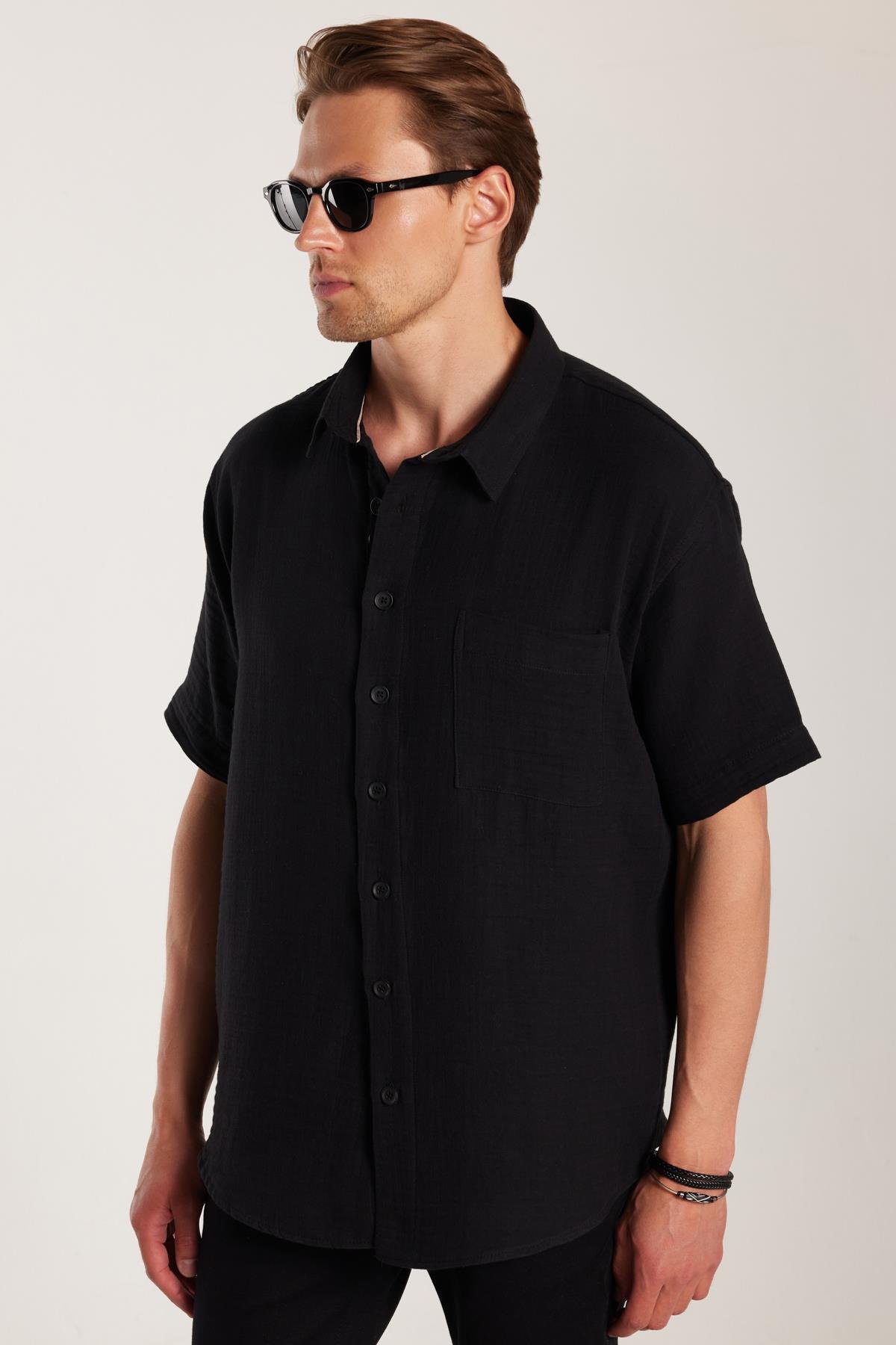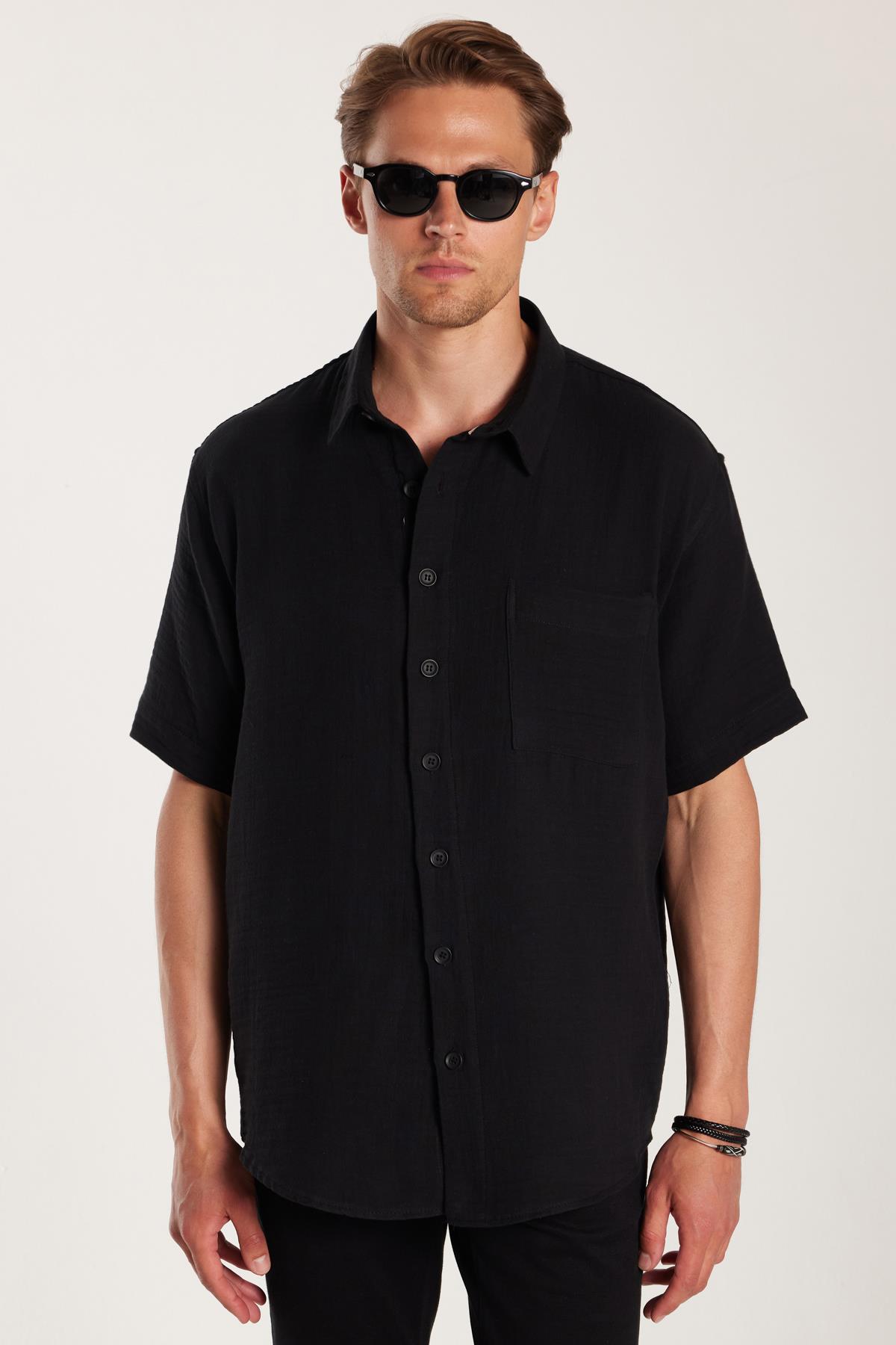 Erkek Relax Fit Rahat Kesim Kısa Kollu %100 Pamuk Tek Cepli Siyah Gömlek