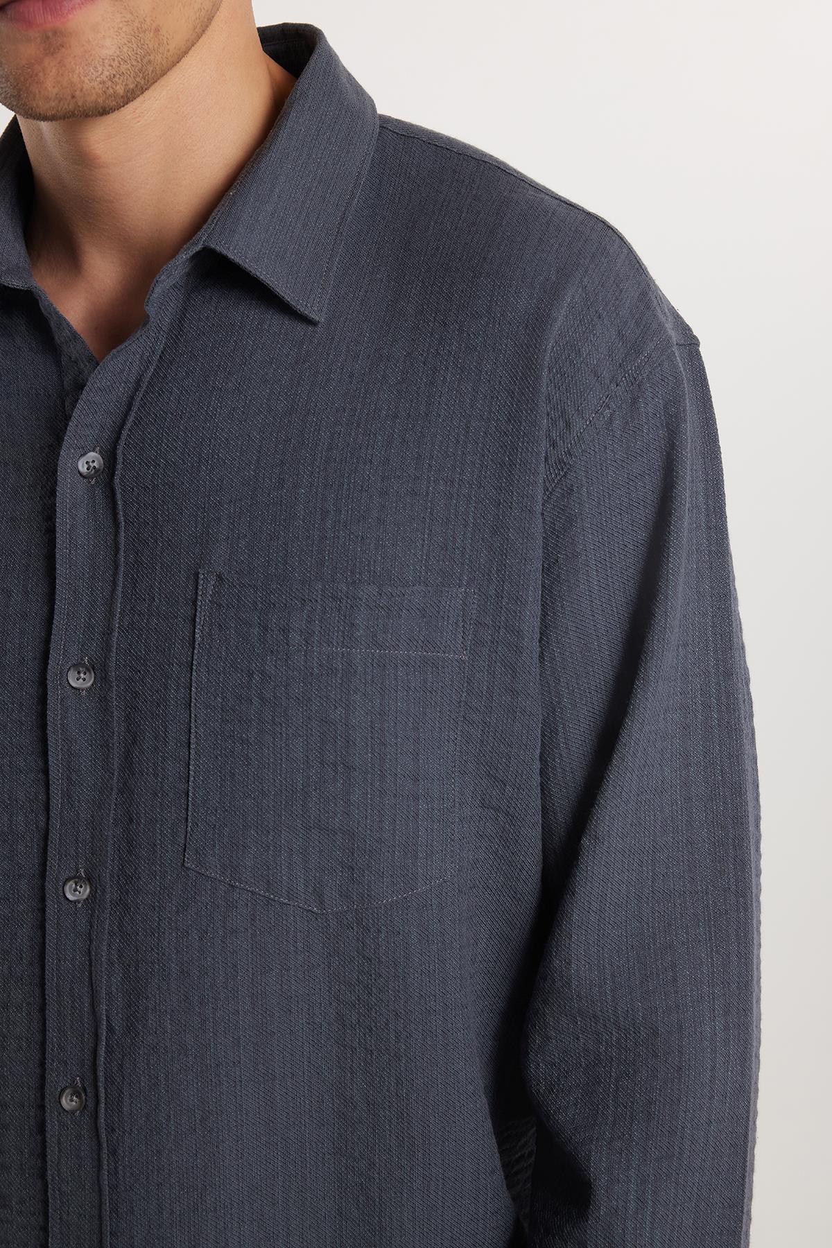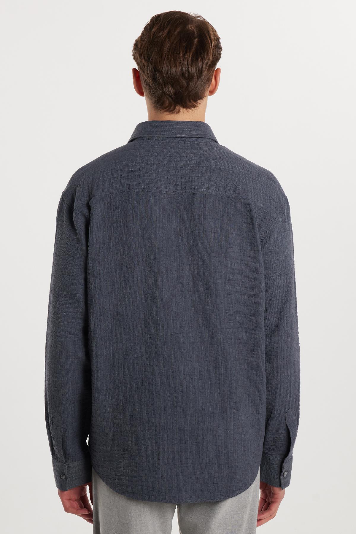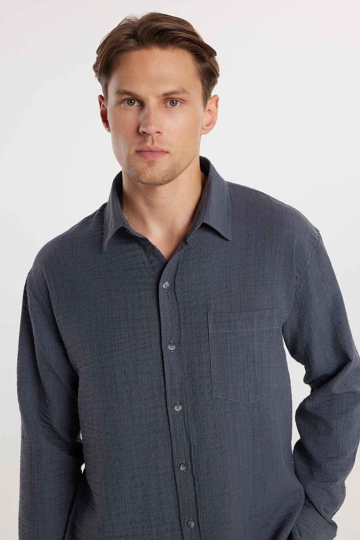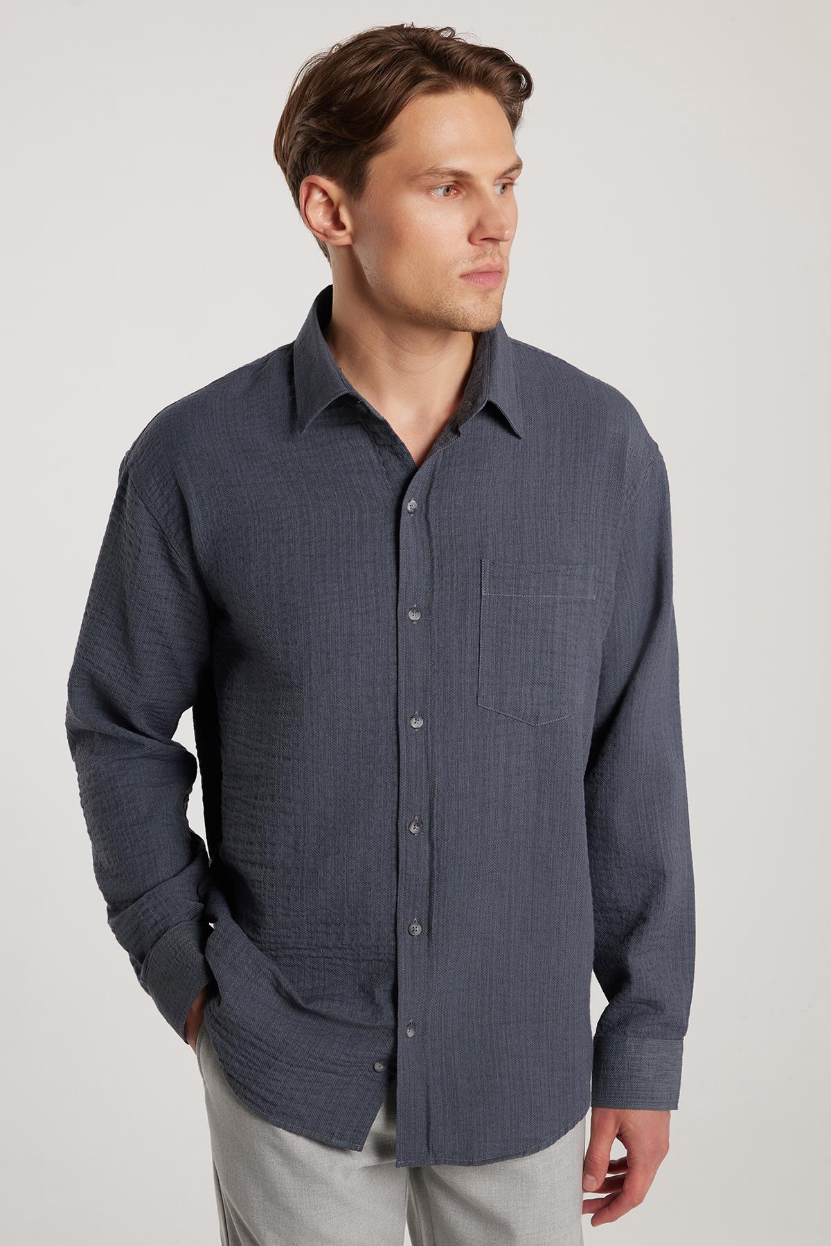 Erkek Relax Fit Rahat Kesim Pamuklu Keten Doku Tek Cepli Gri Gömlek