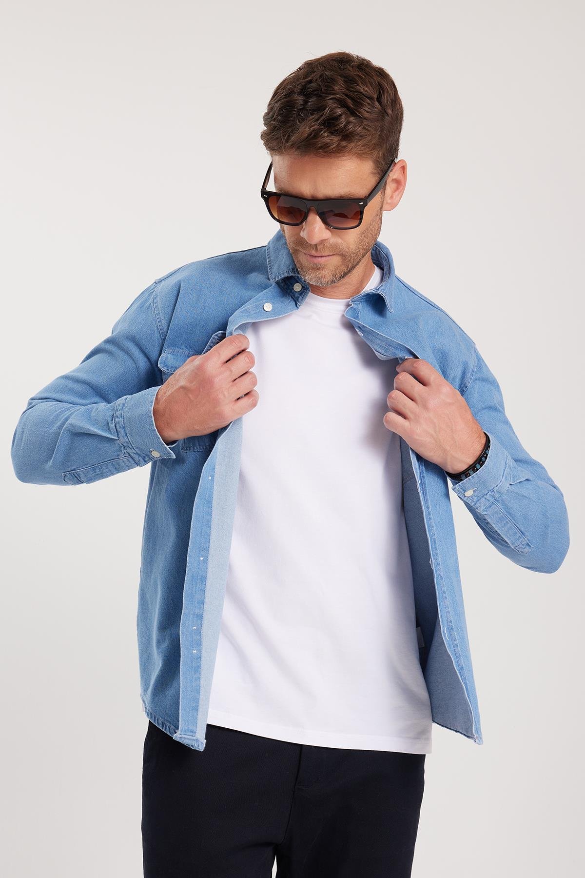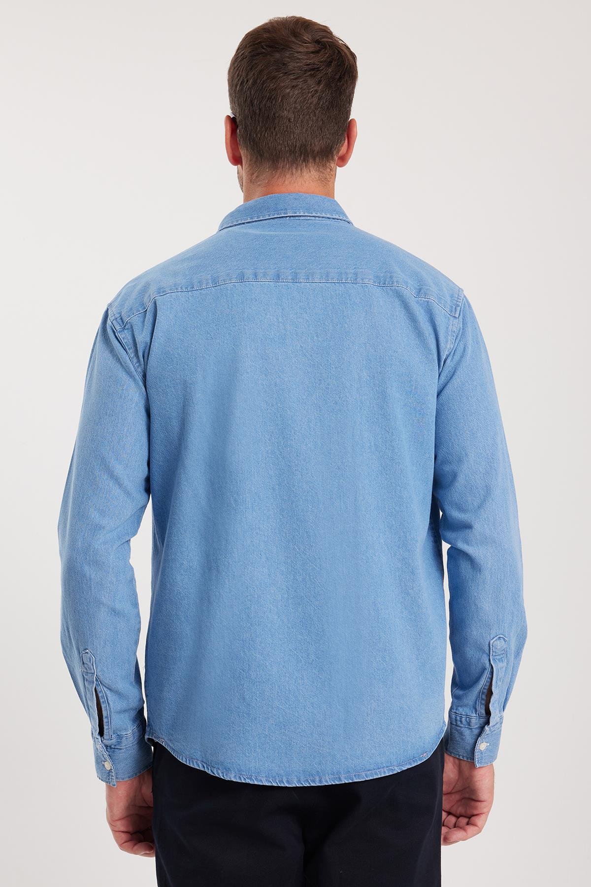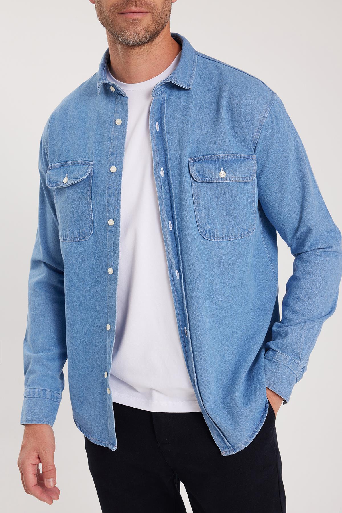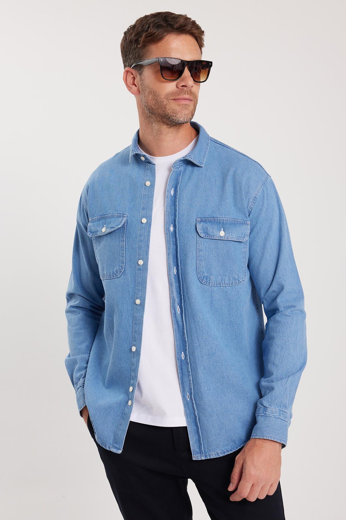 Erkek Relax Fit Rahat Kesim Spor Yaka Çift Cep Kapaklı Denim Açık Mavi Gömlek