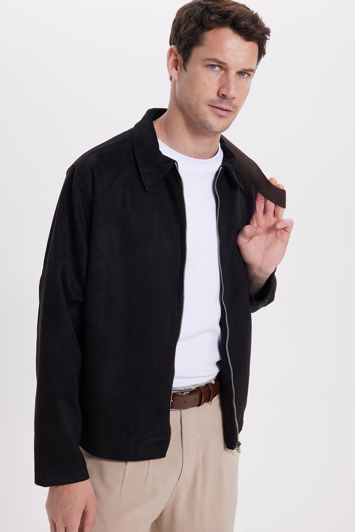 Erkek Relax Fit Rahat Kesim Süet Fermuarlı Astarlı Cepli Siyah Kolej Ceket Mont