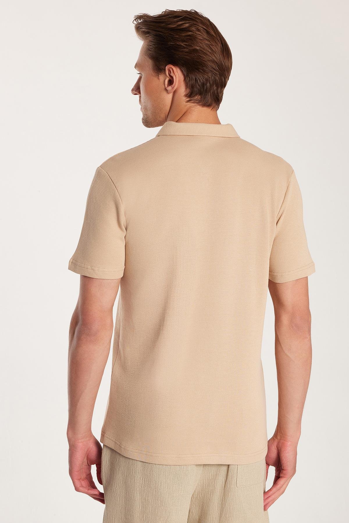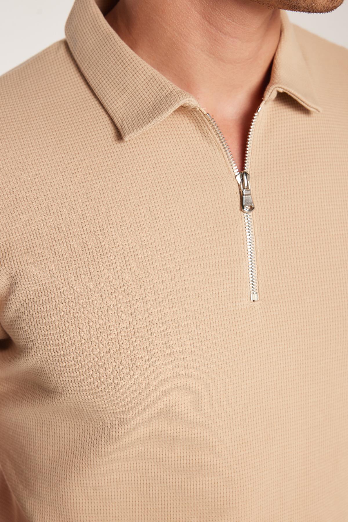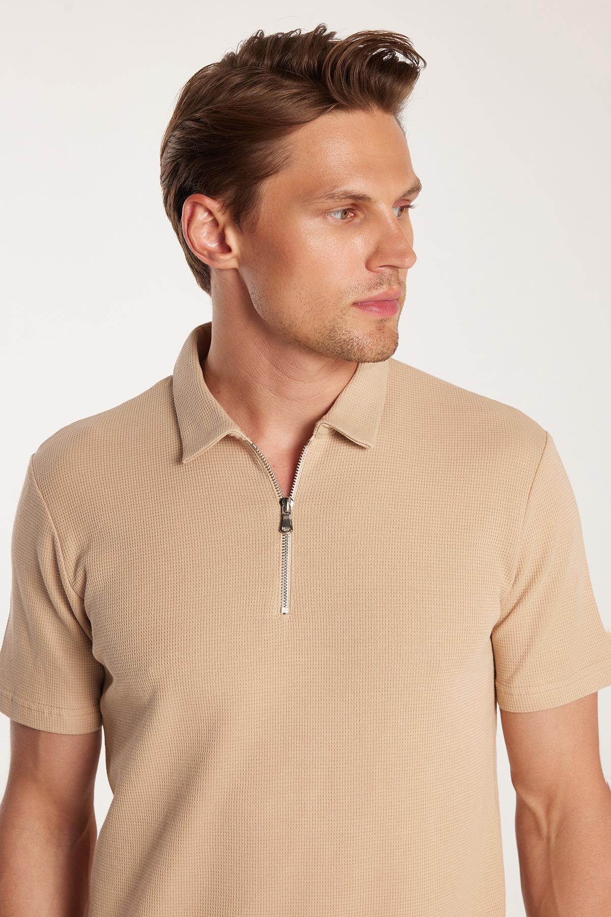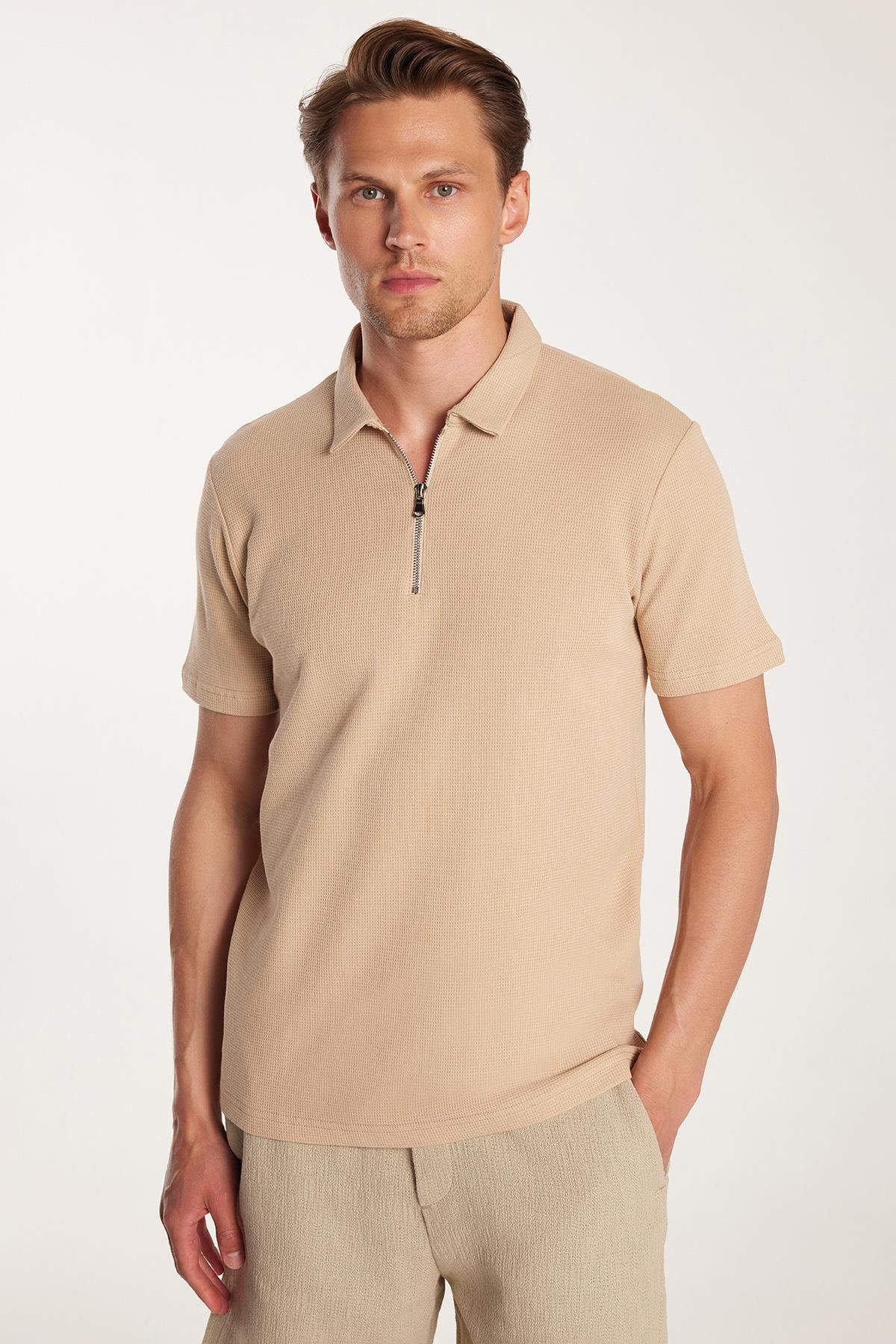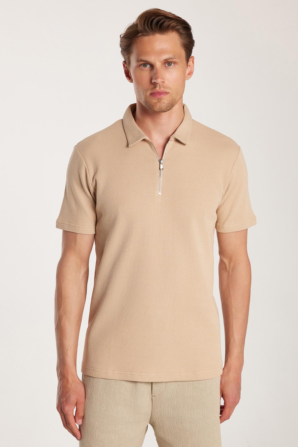 Erkek Slim Fit Dar Kesim %100 Pamuk Fermuarlı Bej Polo Yaka Tişört (TS250017-HS)
