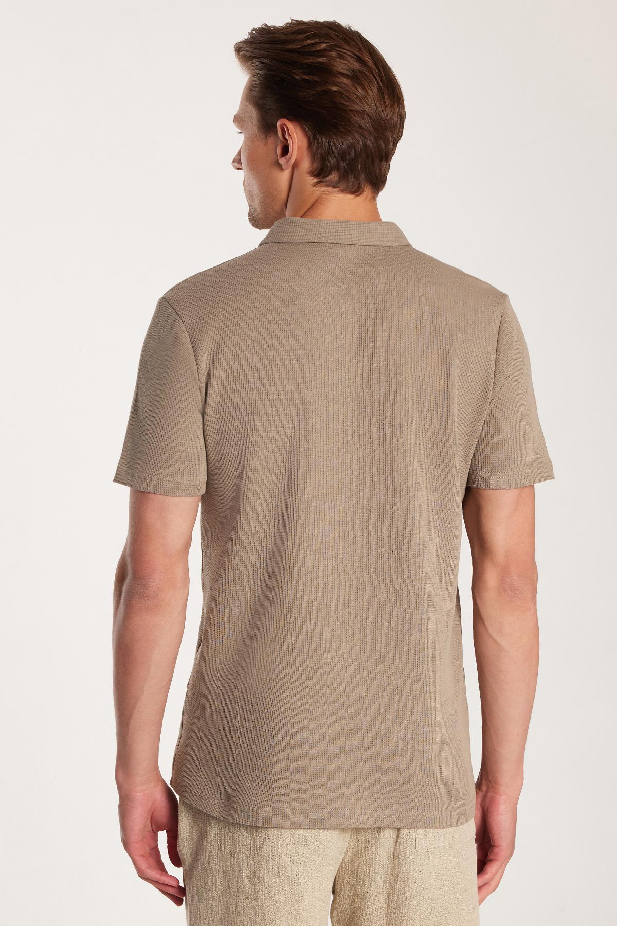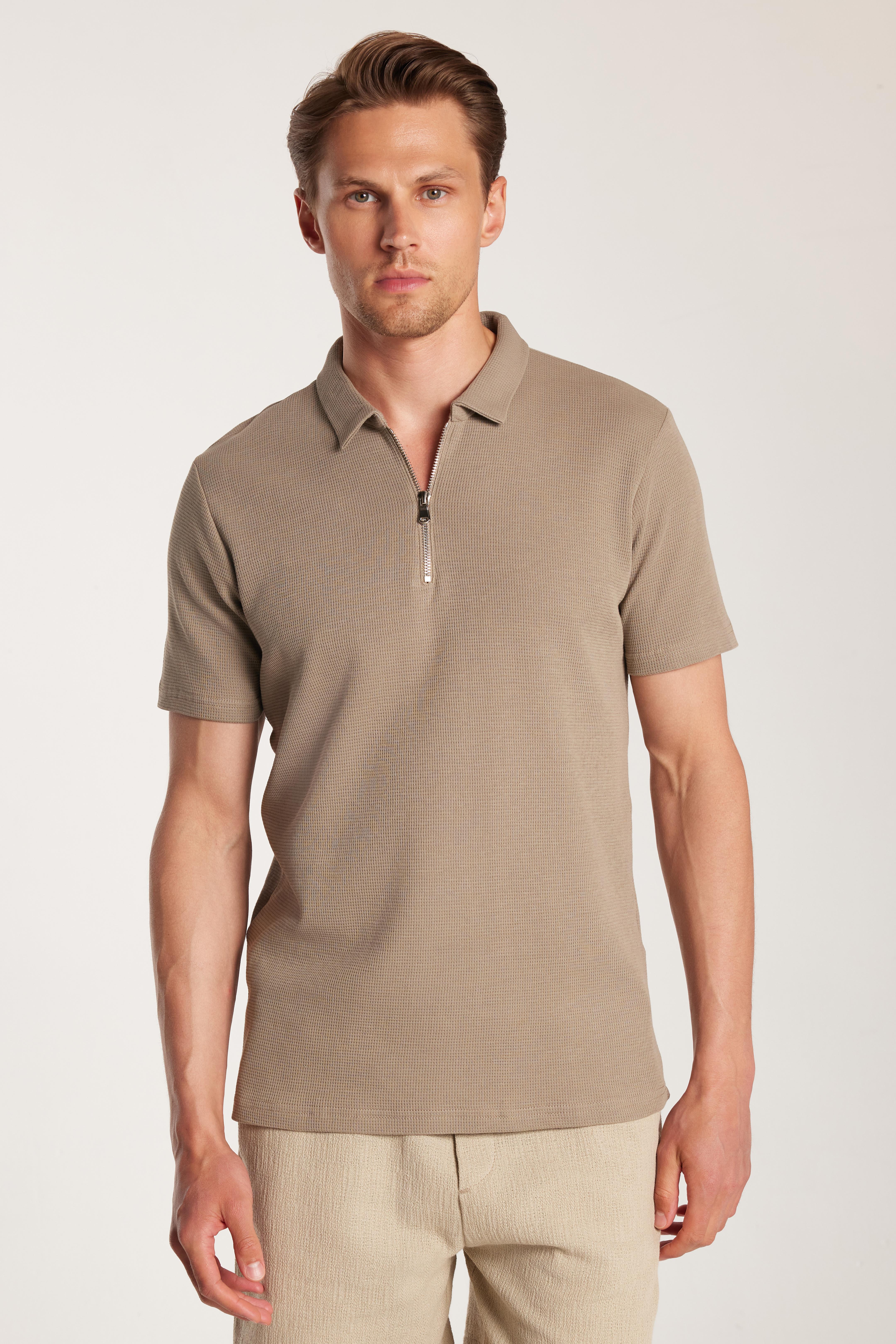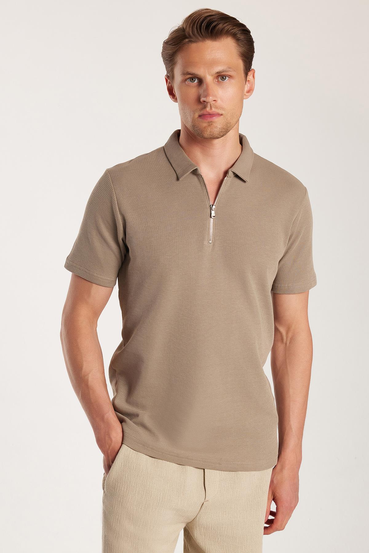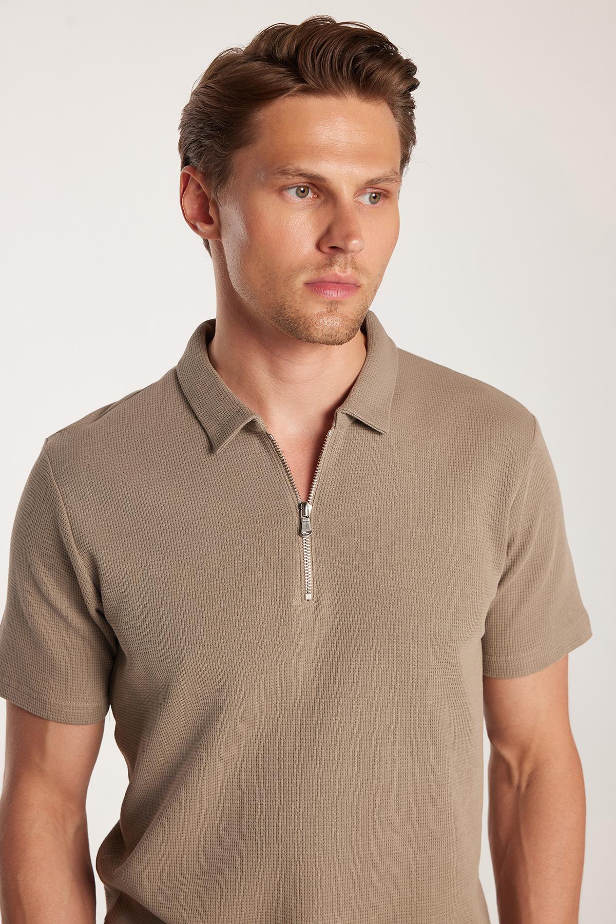 Erkek Slim Fit Dar Kesim %100 Pamuk Fermuarlı Kahverengi Polo Yaka Tişört (TS250017-BDE)