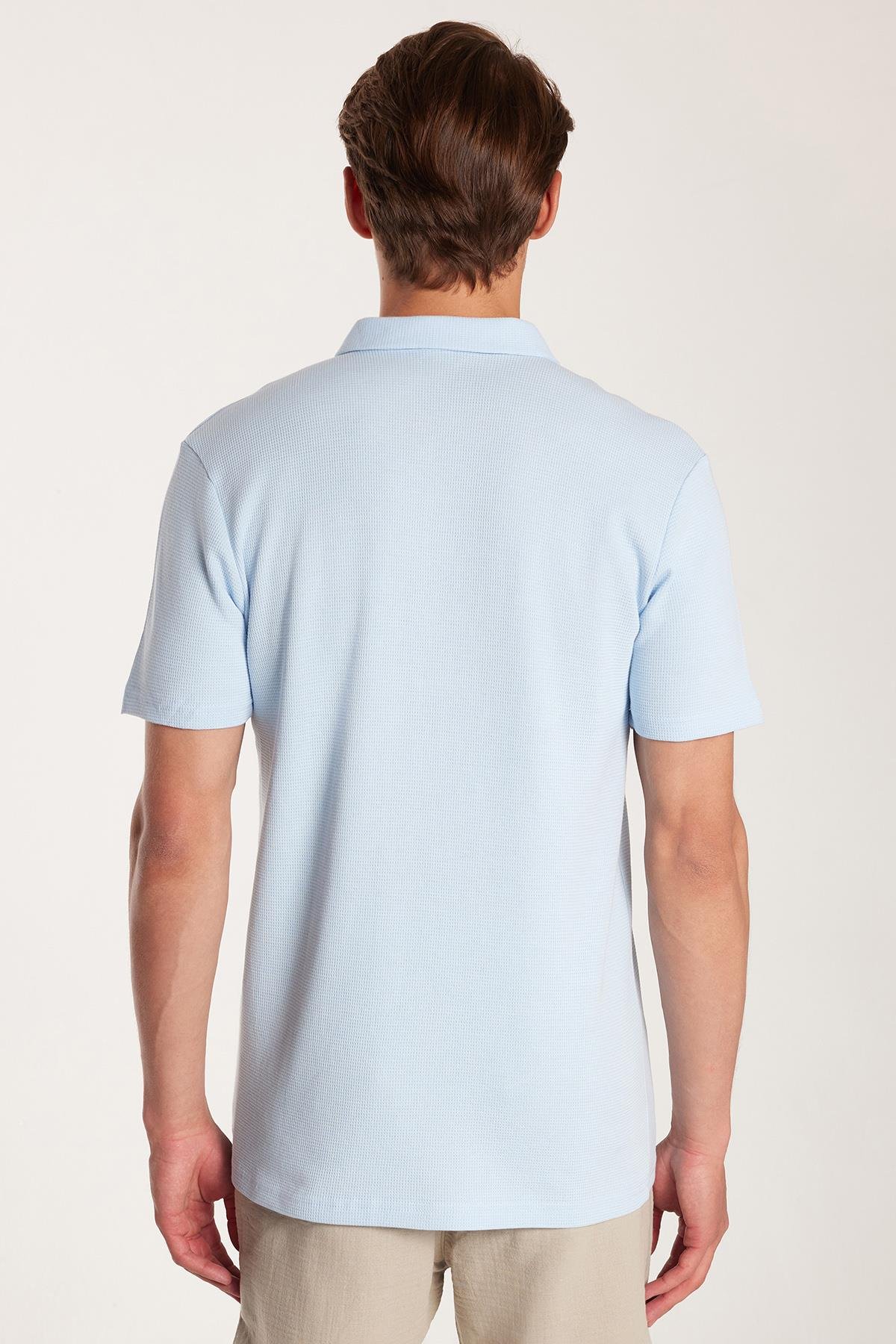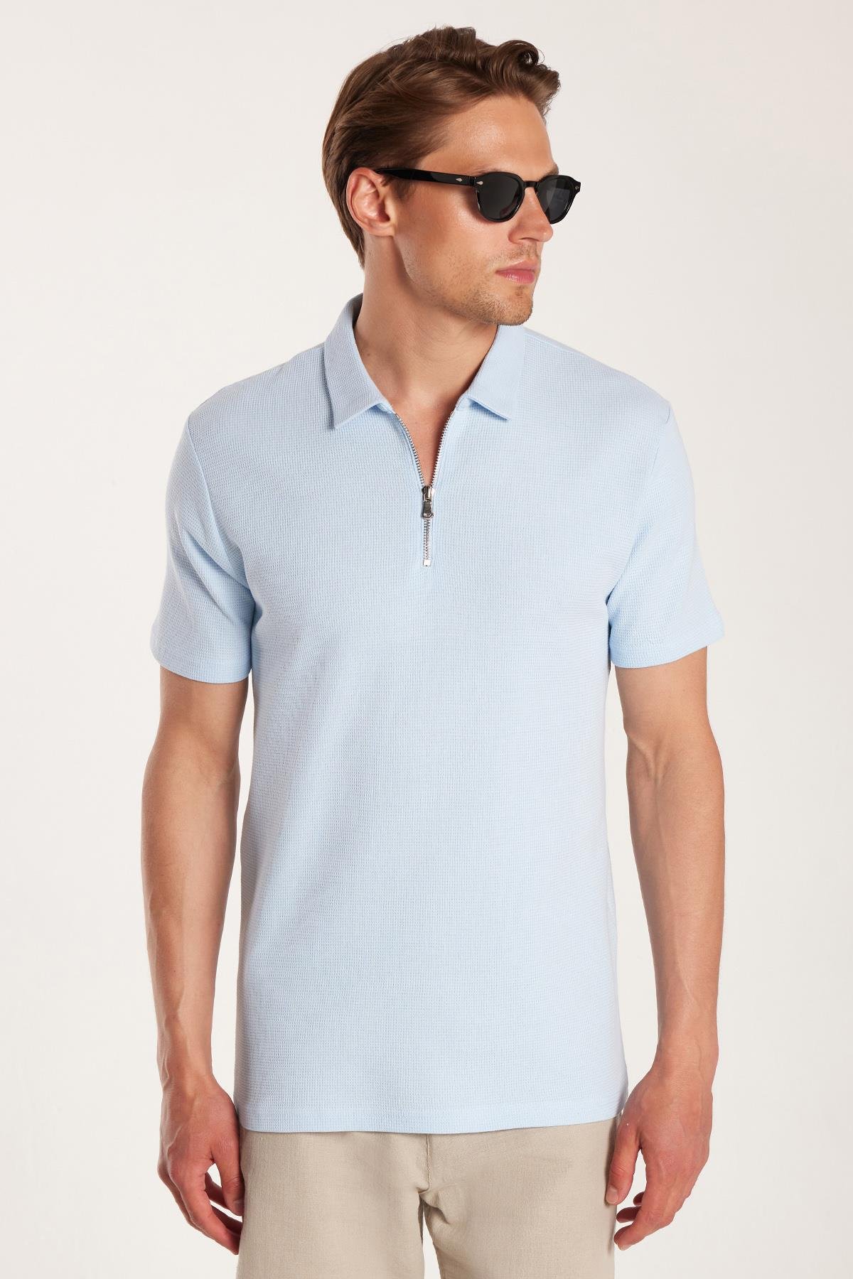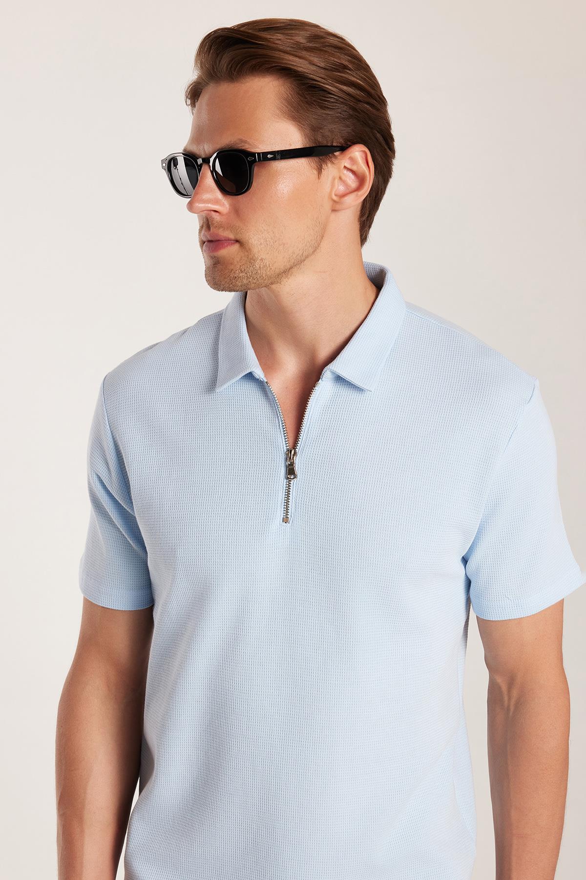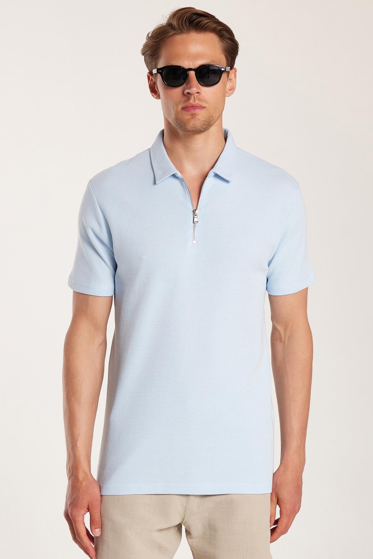 Erkek Slim Fit Dar Kesim %100 Pamuk Fermuarlı Mavi Polo Yaka Tişört (TS250017-SW01)