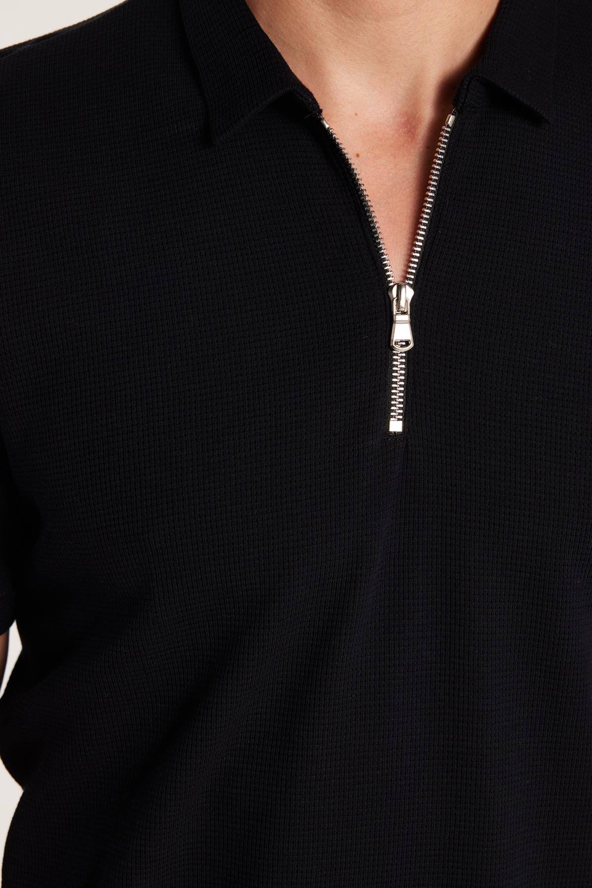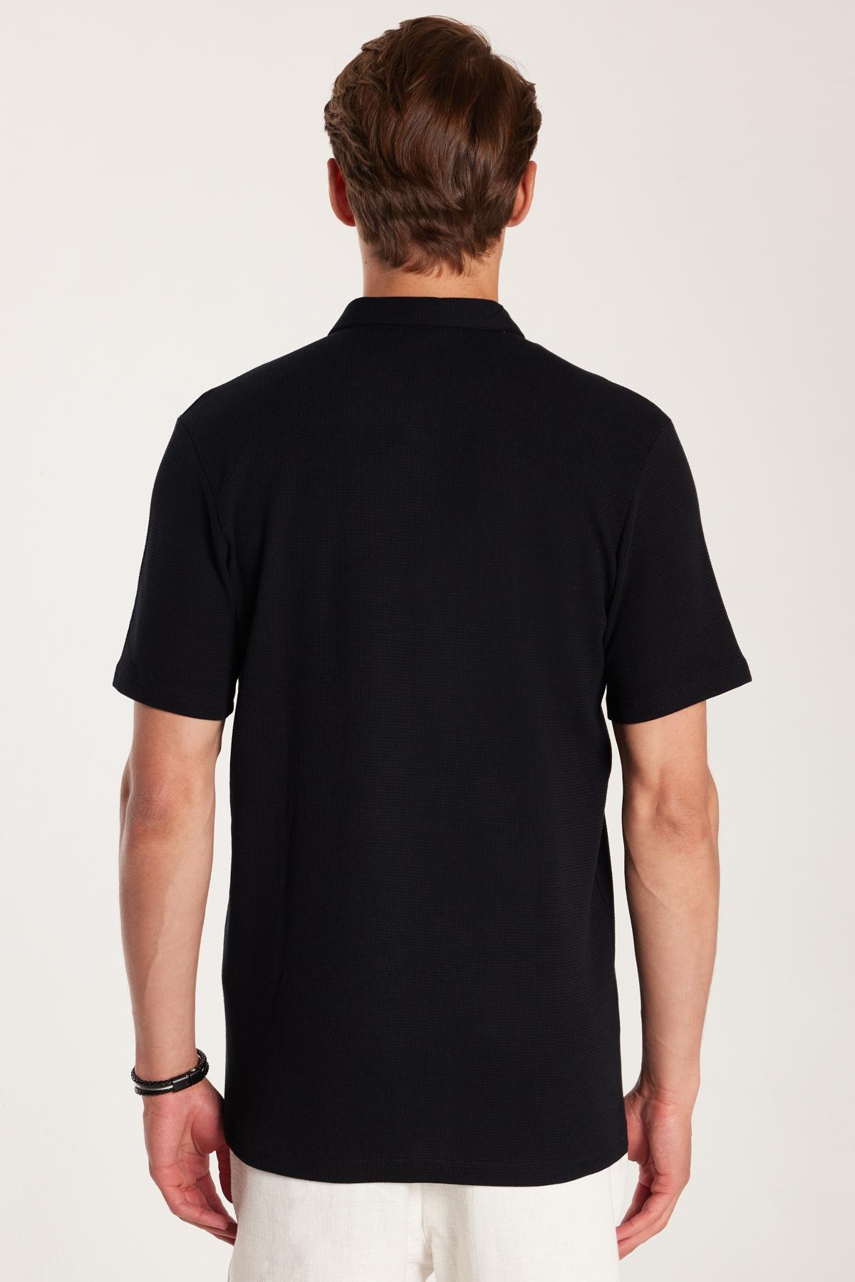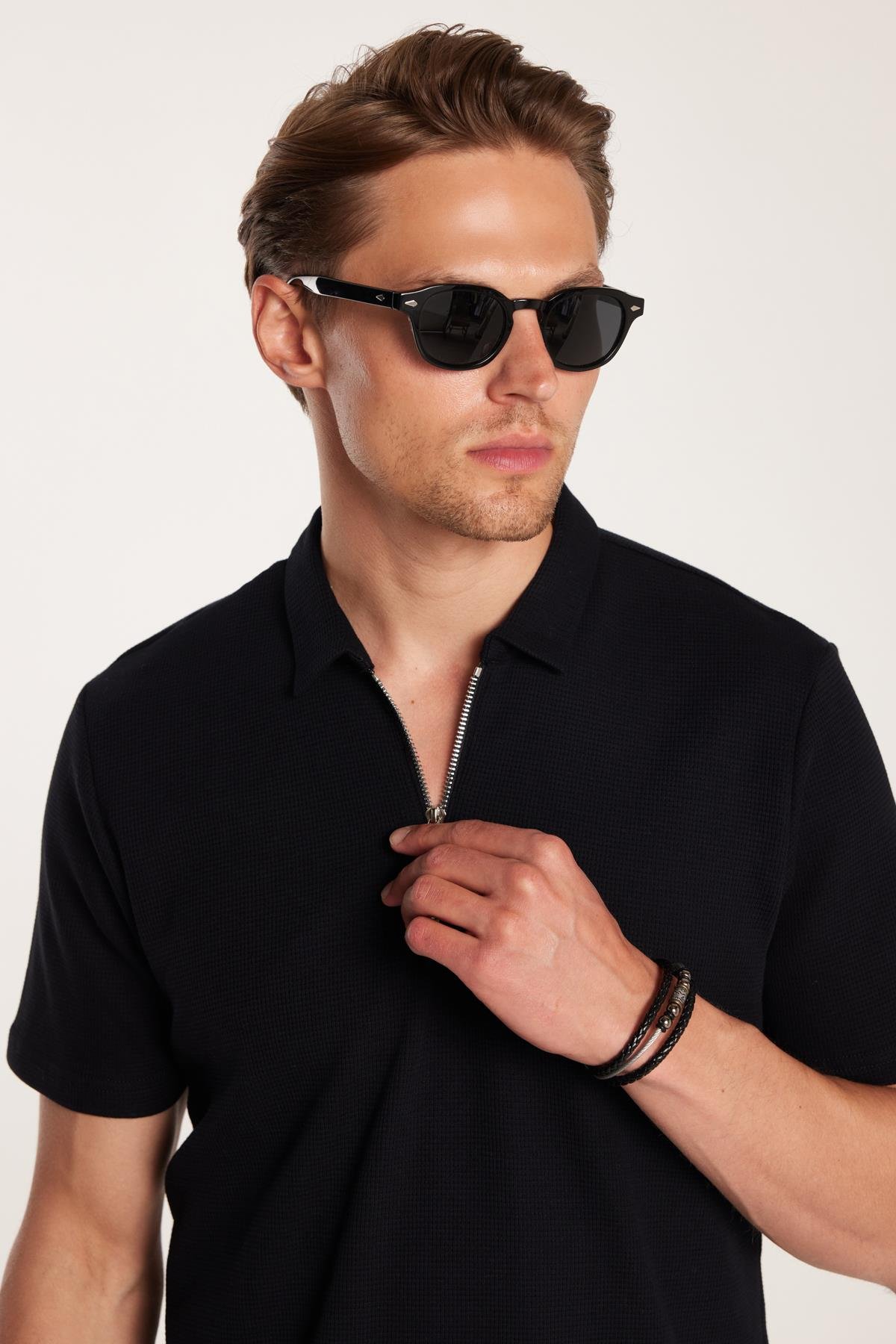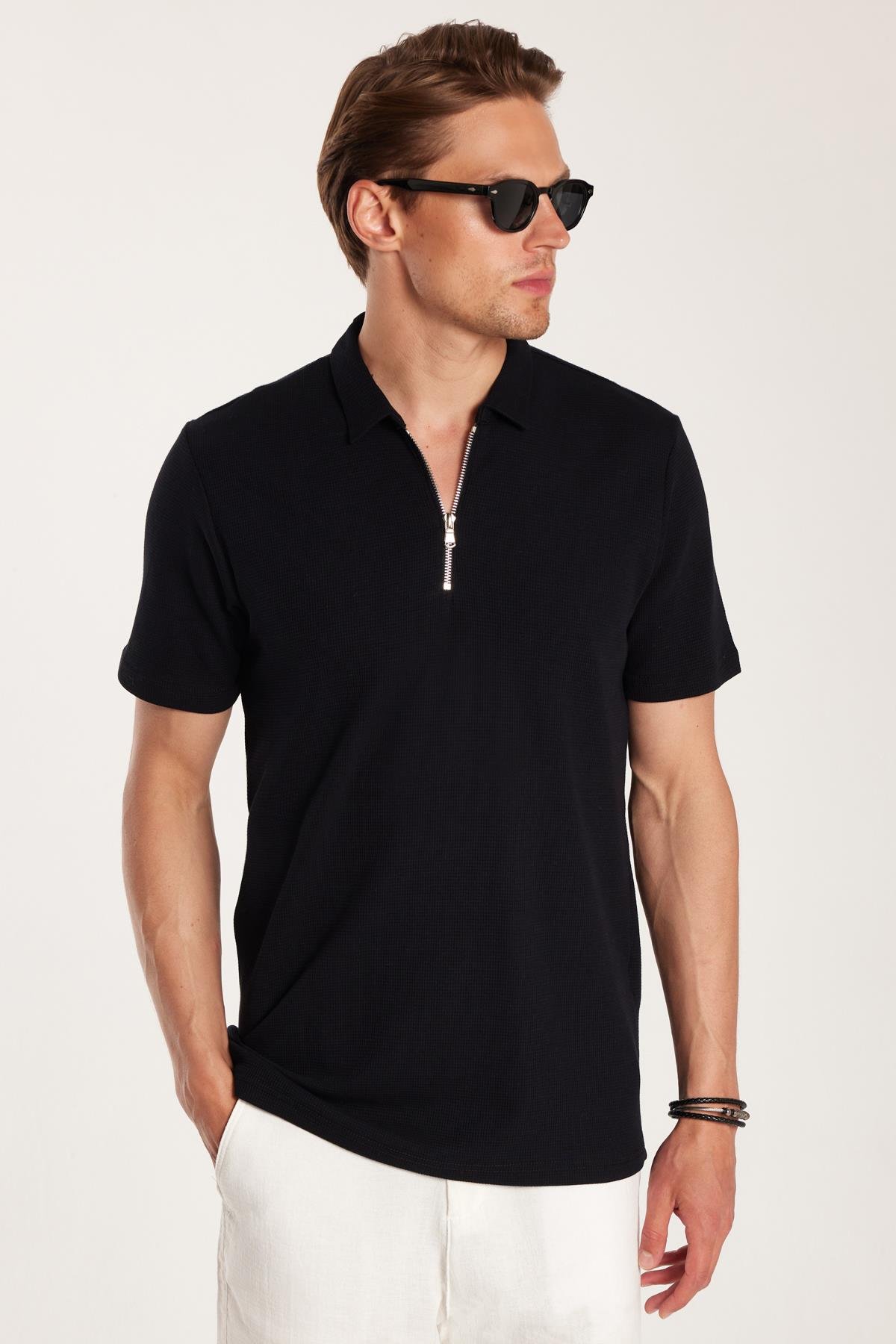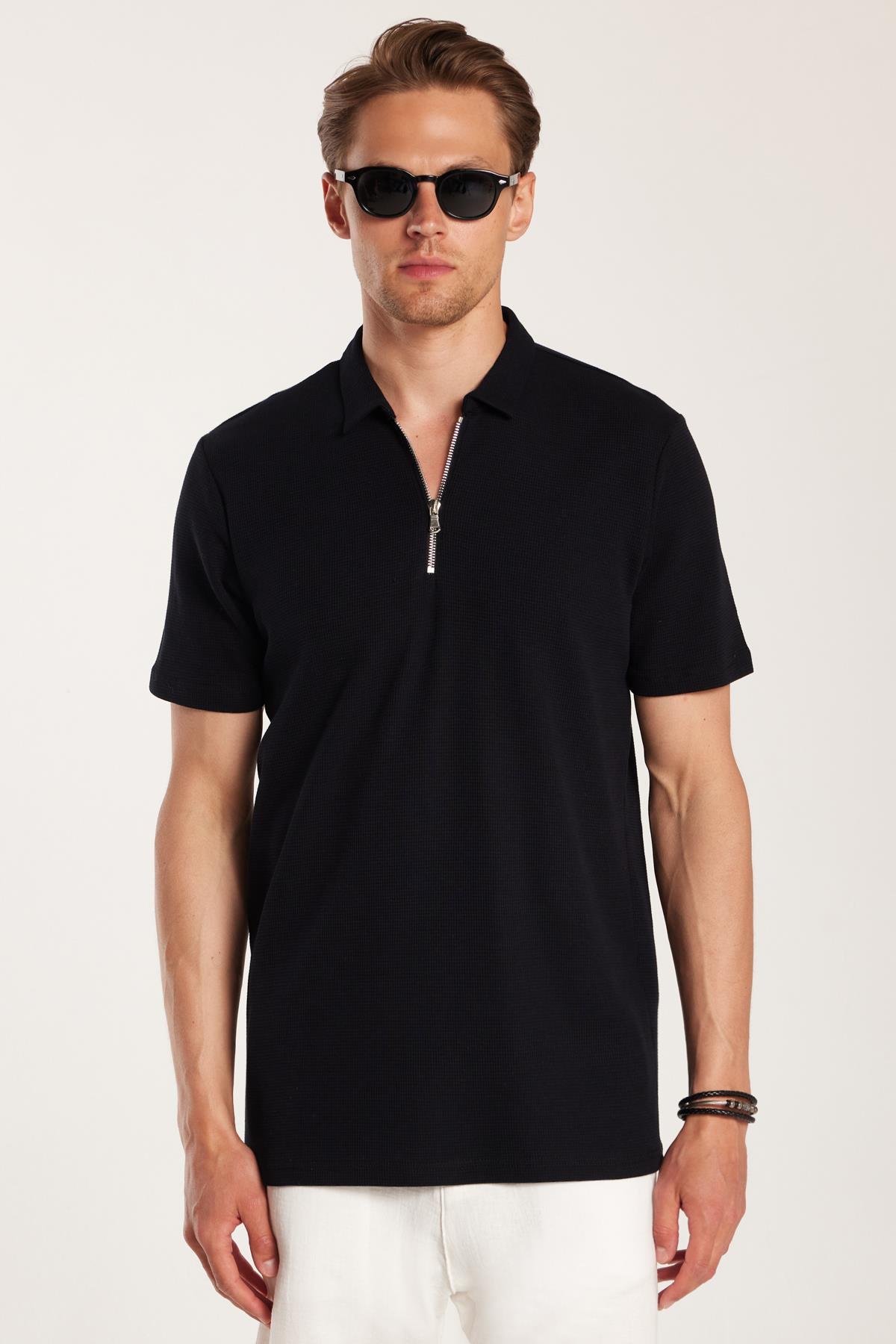 Erkek Slim Fit Dar Kesim %100 Pamuk Fermuarlı Siyah Polo Yaka Tişört (TS250017-02)