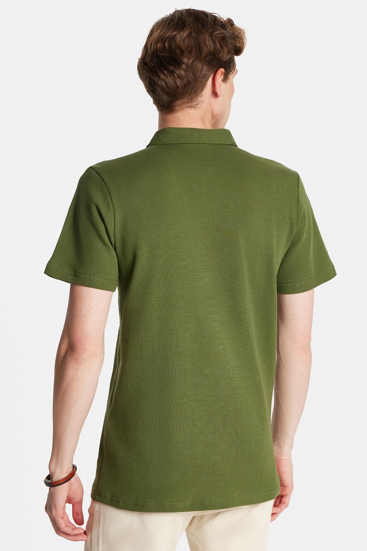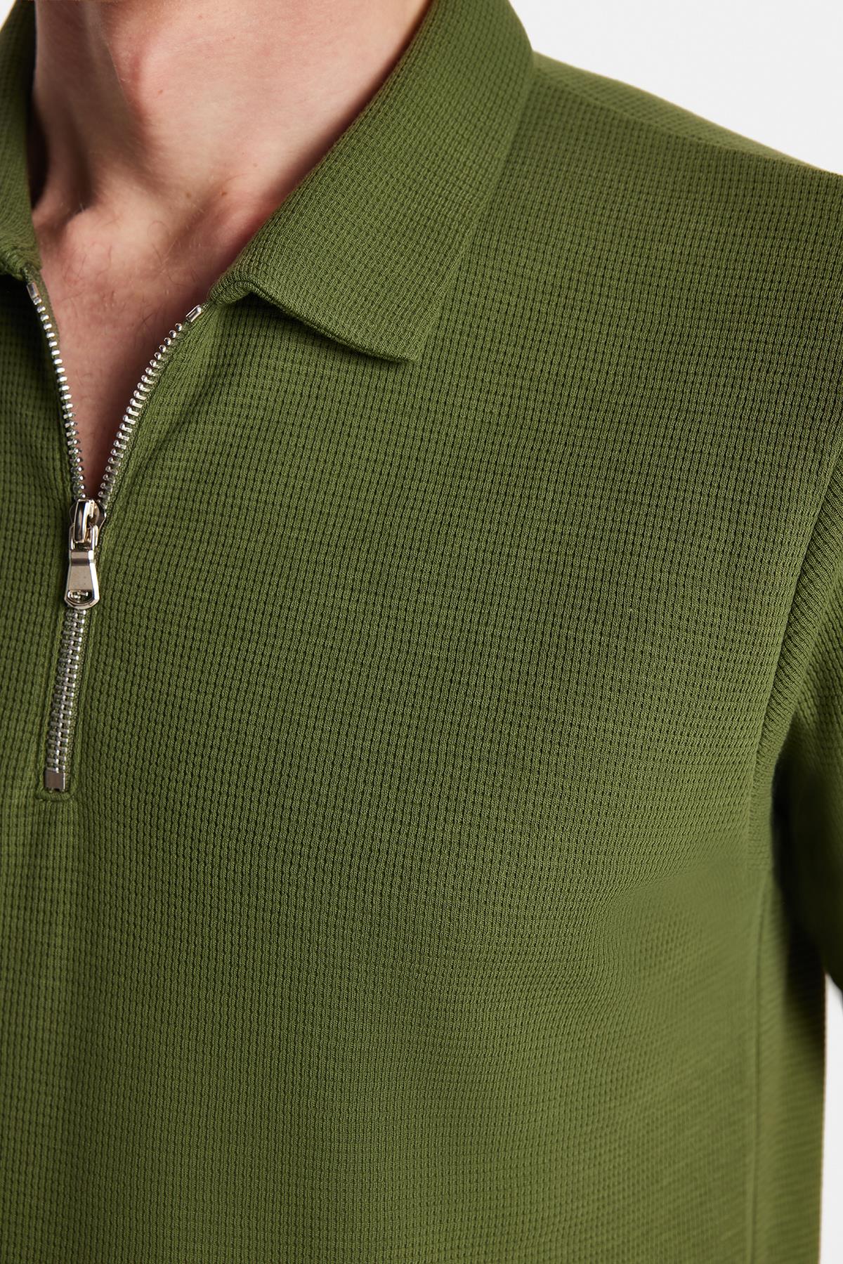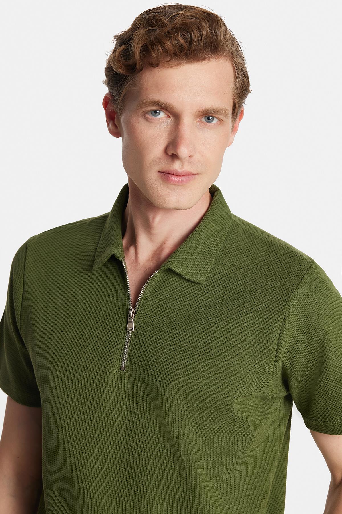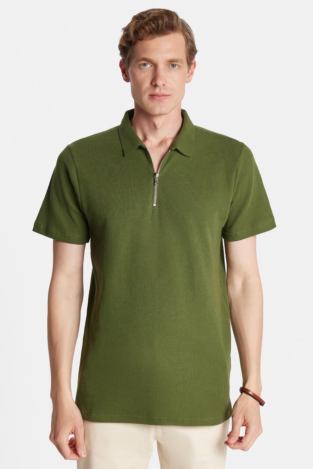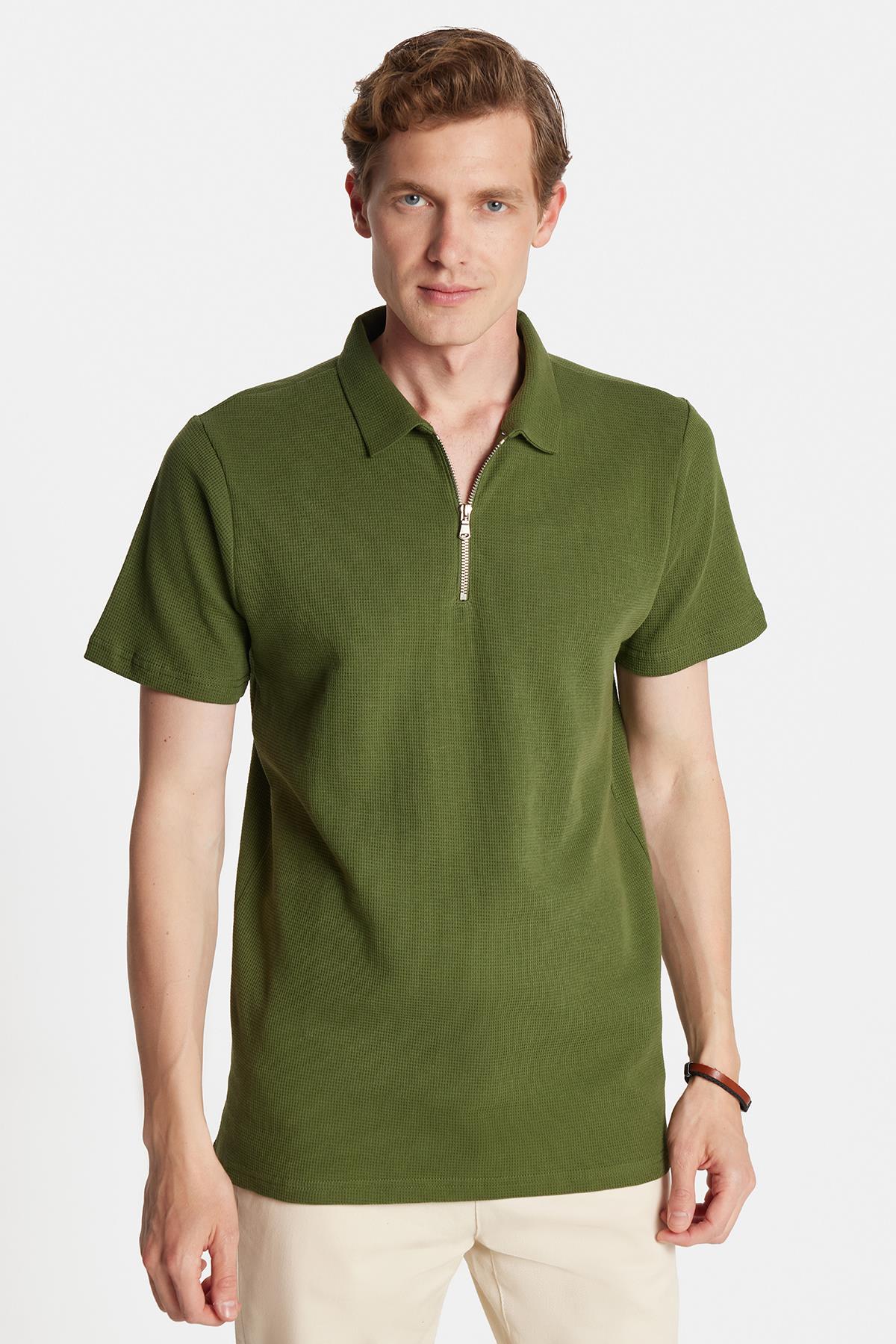 Erkek Slim Fit Dar Kesim %100 Pamuk Fermuarlı Yeşil Polo Yaka Tişört (TS250017-CV)