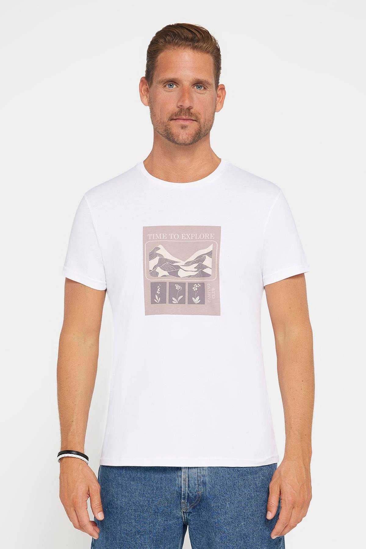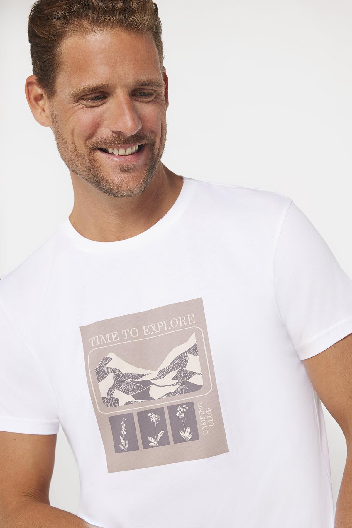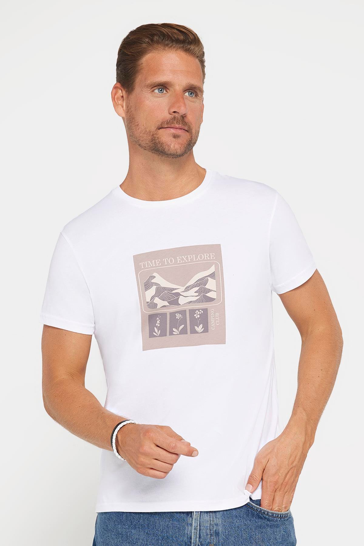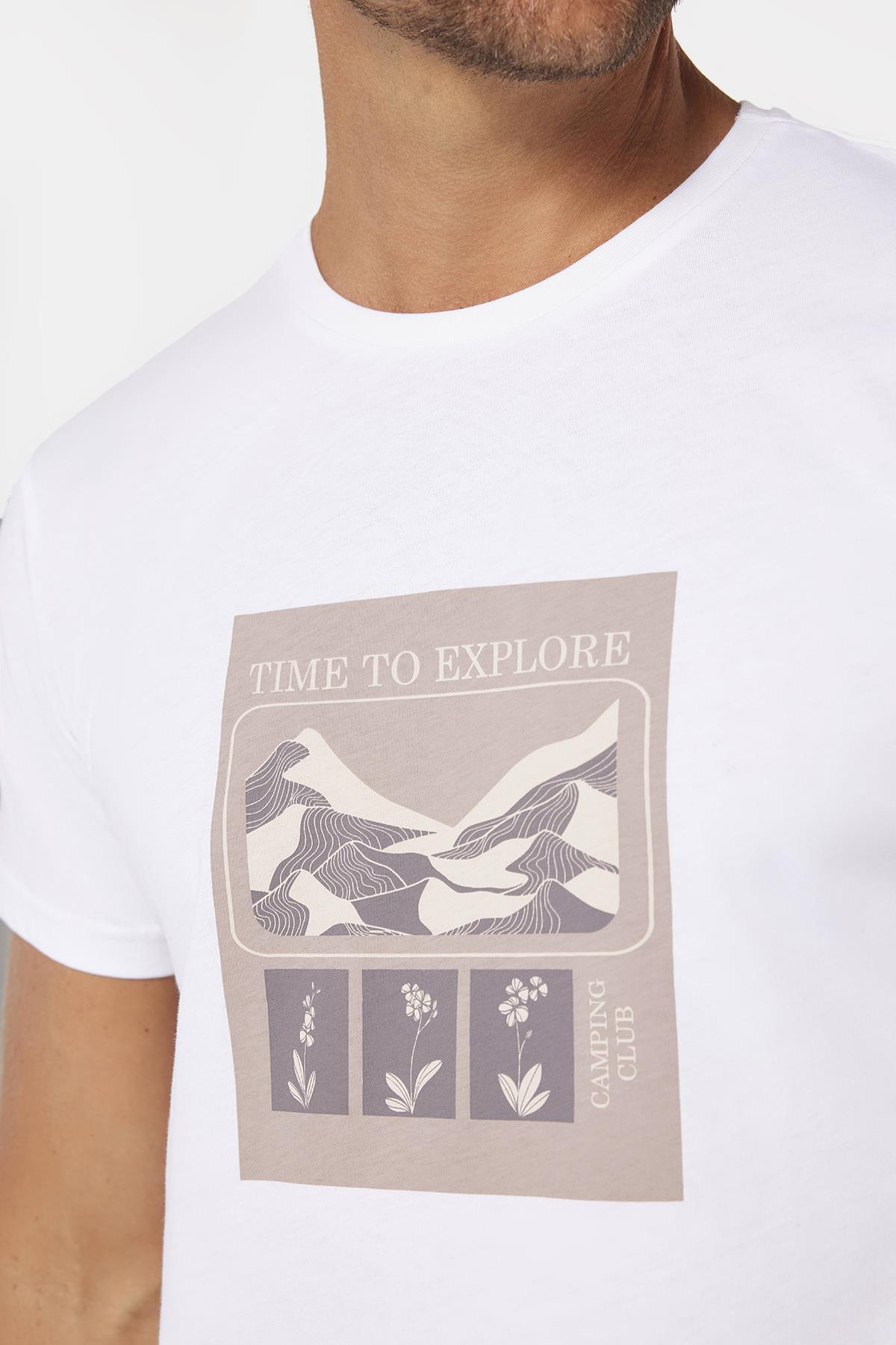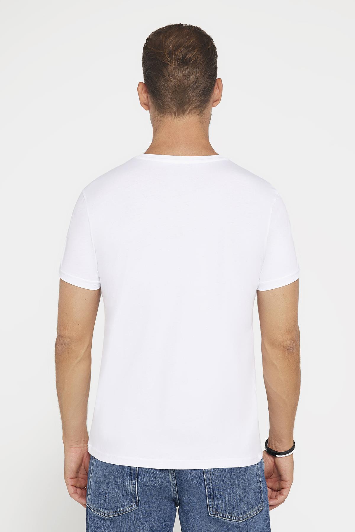 Erkek Slim Fit Dar Kesim %100 Pamuk Yumuşak Dokulu Baskılı Beyaz Bisiklet Yaka Tişört (TS240017-525)